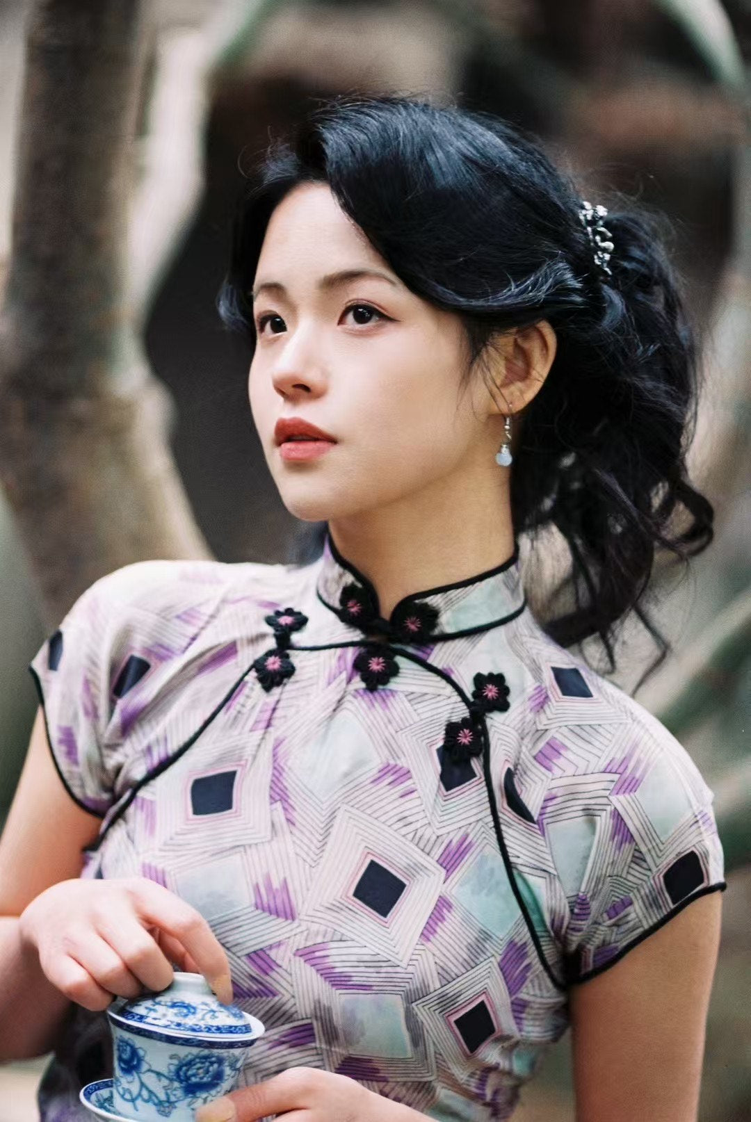 The Qipao features a soft base of pale gray and light teal, upon which avant-garde violet and deep indigo geometric diamond patterns dance, forming a captivating 'Violet Illusion.' This specific pattern style is a vivid manifestation of the Art Deco movement's influence on Chinese fashion, seamlessly integrating Western Modernist abstract aesthetics into traditional Oriental dress.