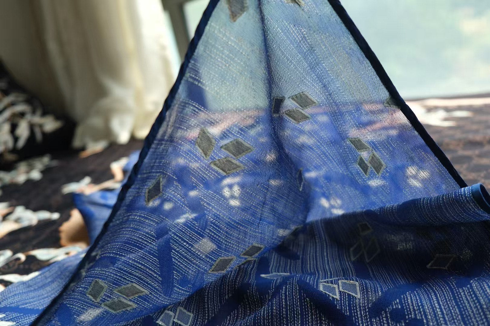 This Qipao showcases a distinctly different modern style found in Republican Era Pictorials. Set against a deep cerulean blue background, it forgoes traditional large floral motifs for a contemporary geometric pattern. Fine vertical lines intersect with staggered diamond elements, creating a unique woven texture and subtle pattern that is understated yet rich in dimension.