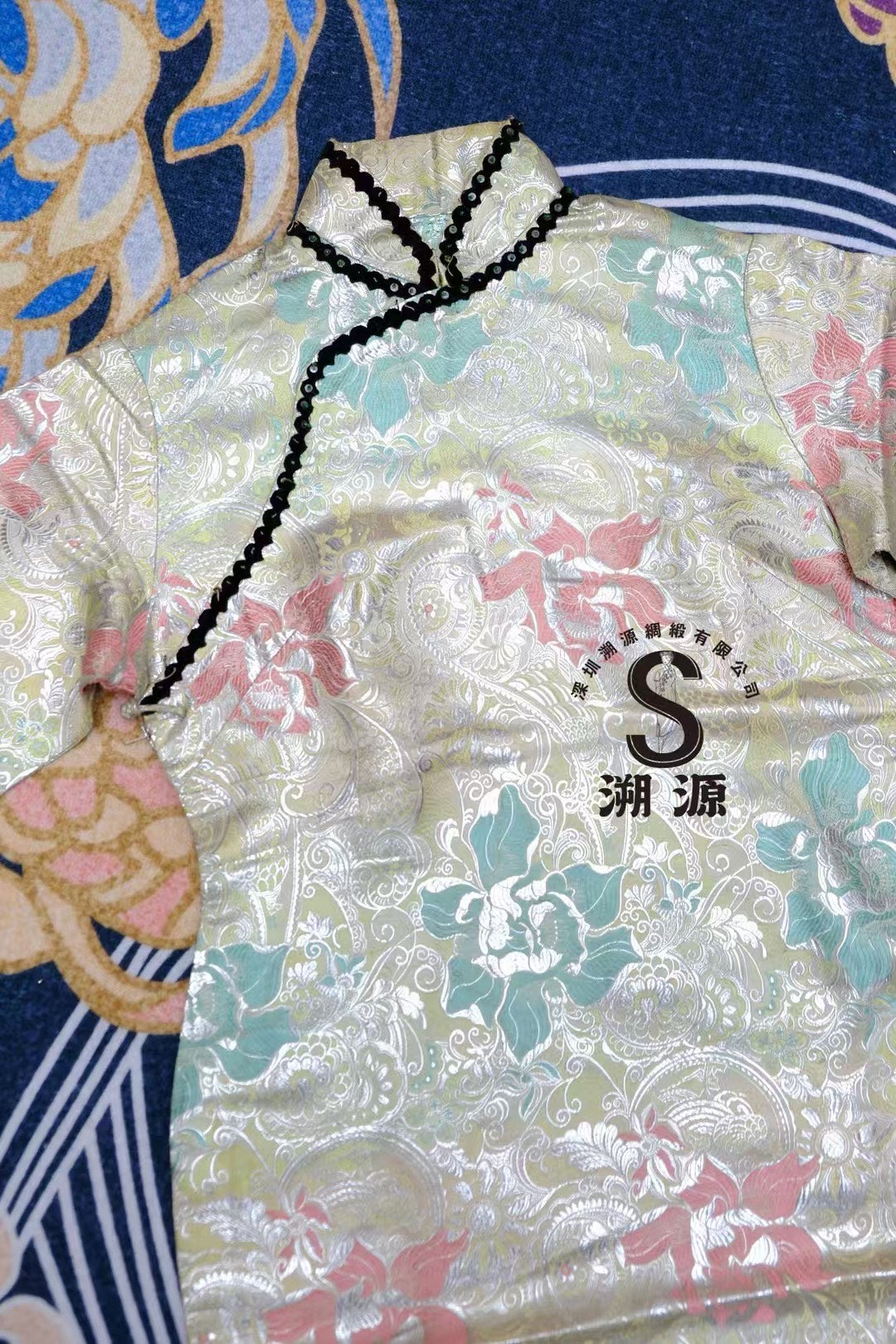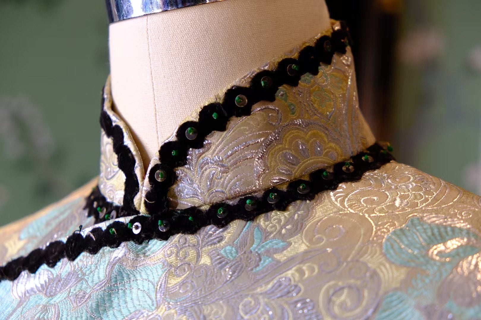 最具特色的莫过于黑色的丝绒绲边,边缘点缀着微小的亮片。这种独特的工艺,不仅勾勒出旗袍婀娜的曲线,更在领口、斜襟和裙摆处,增添了低调的闪耀感和浓郁的海派摩登气息。它完美结合了传统织锦的富贵典雅与新时代女性对光彩和细节的追求,是一件兼具历史价值和时尚趣味的珍品。