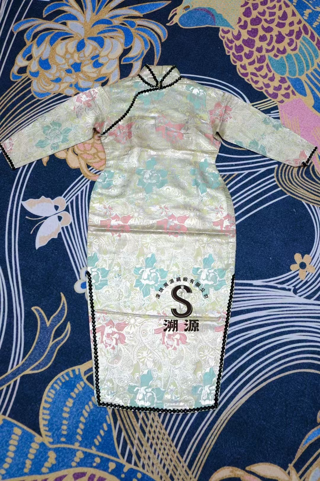 旗袍采用织锦缎材质,底色是浅淡的暖黄与银白交织,织入银线,使整体呈现出一种流动的金属光泽。其上的撞色花卉,以柔美的粉色和清新的浅蓝点缀其间,搭配繁复的佩斯利(Paisley)底纹,将大陆产织锦的精致工艺展现得淋漓尽致。
