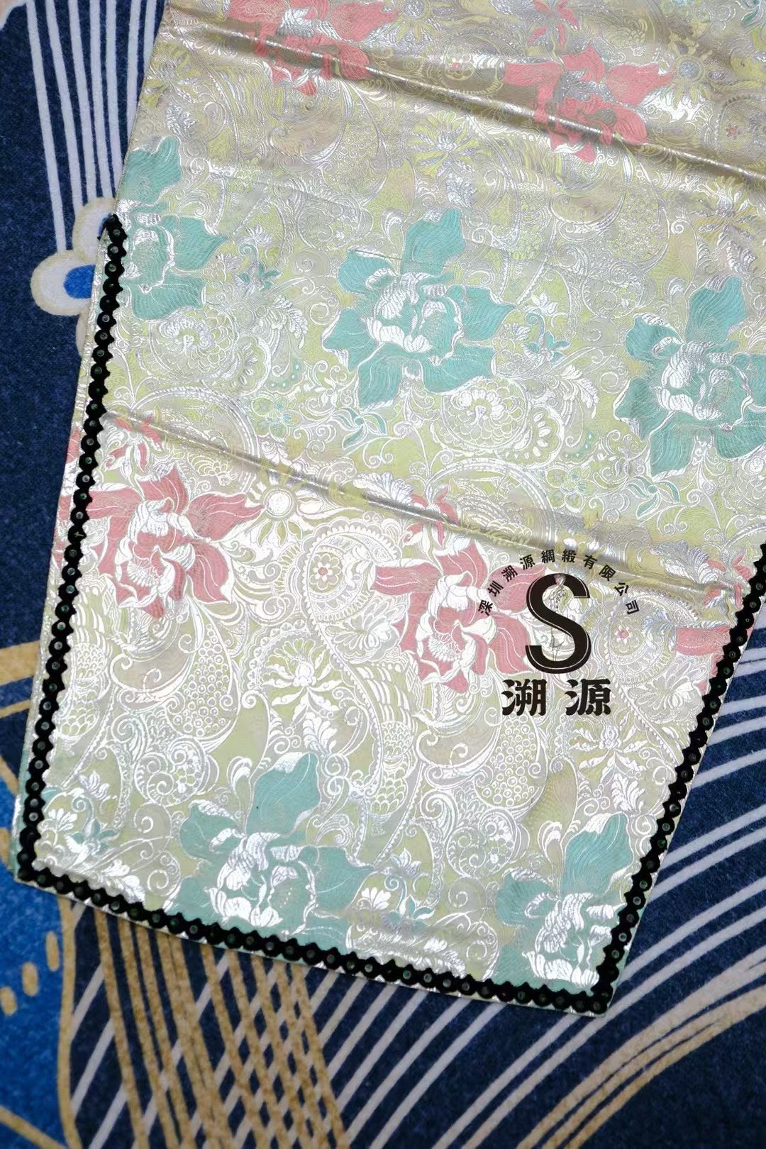 The gown is made from brocade fabric, with a base color that blends pale warm yellow and silver-white. Woven with silver threads, the fabric possesses a liquid, metallic luster. The color-block floral motifs—in soft pink and refreshing light blue—are interspersed with an intricate Paisley background pattern, showcasing the superb craftsmanship of Mainland China's brocade weaving.