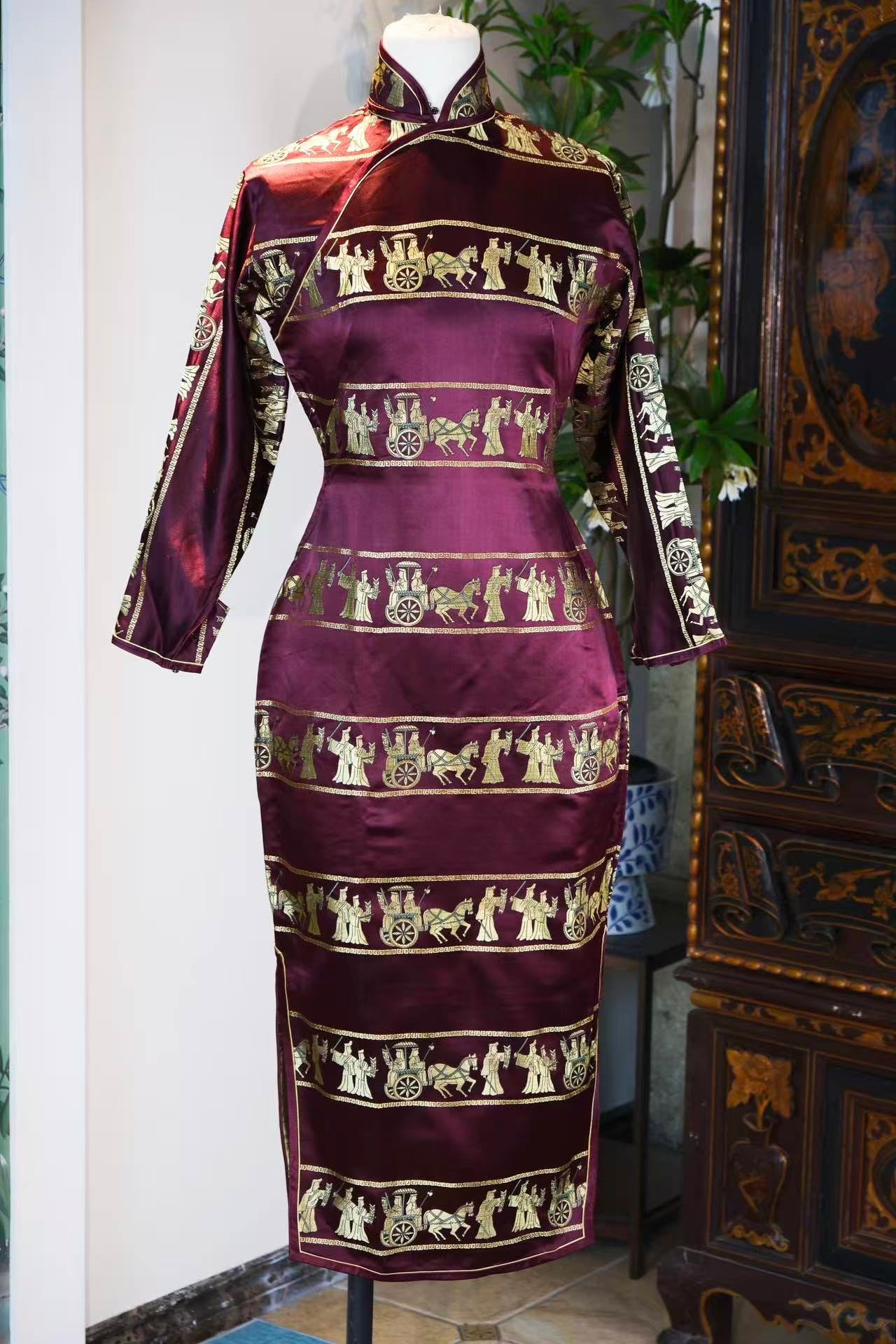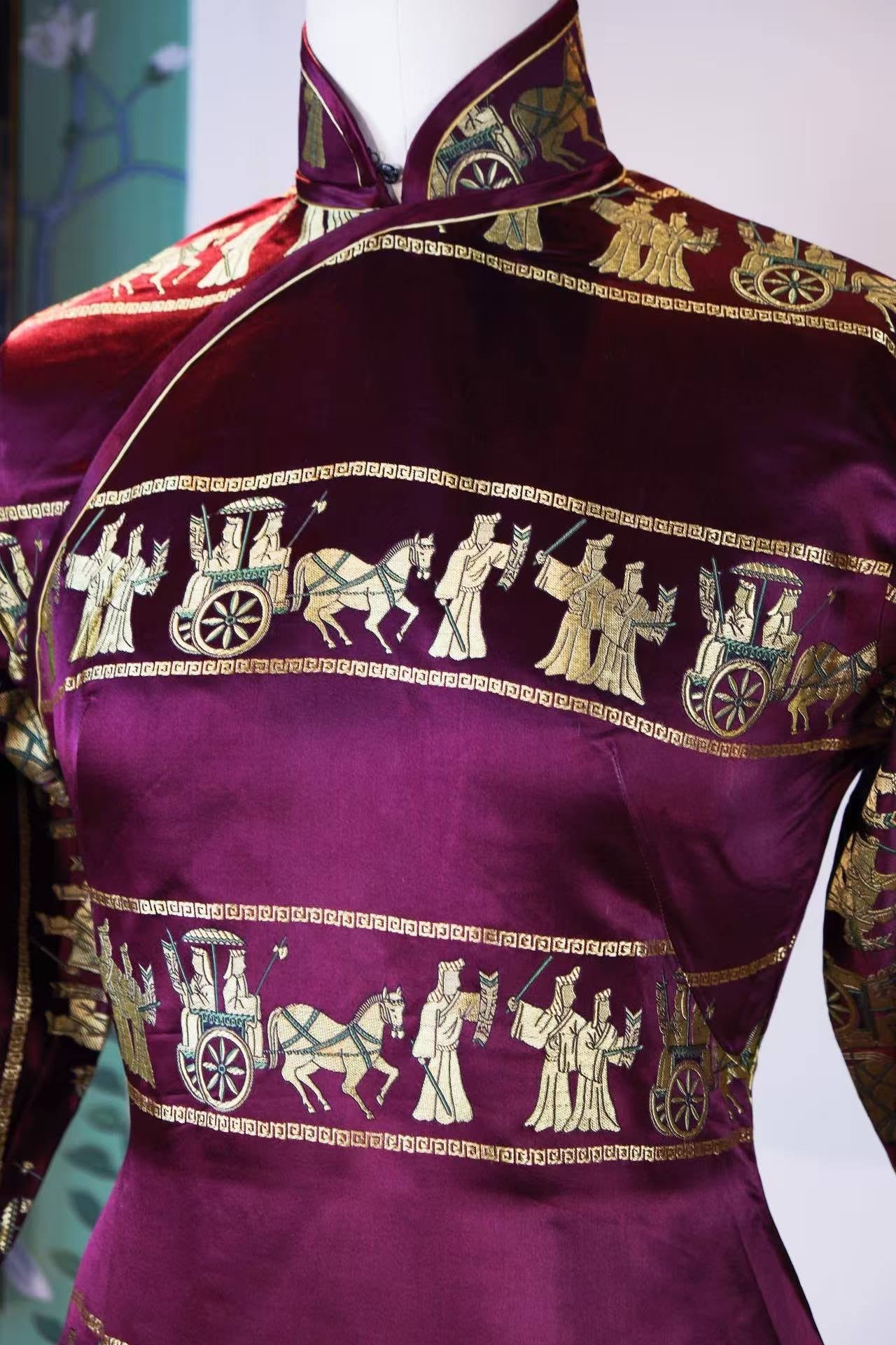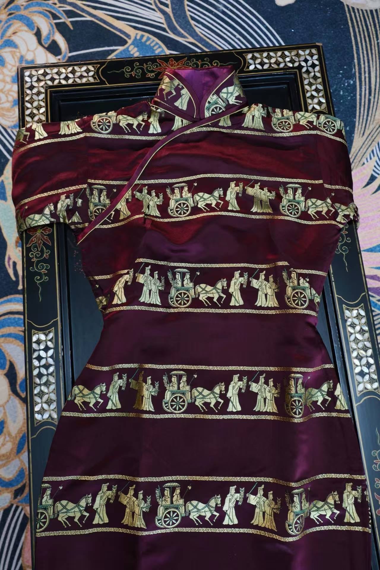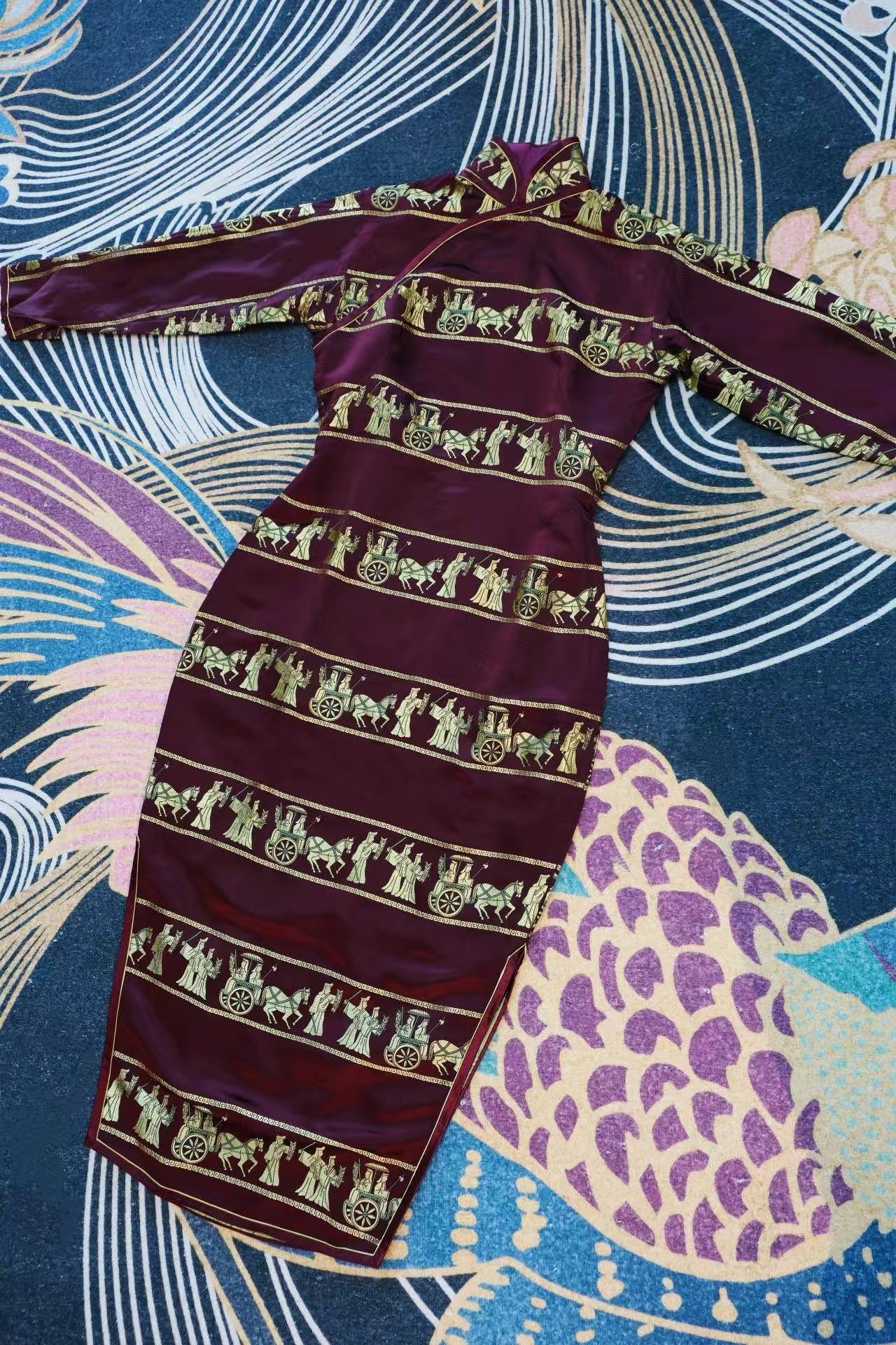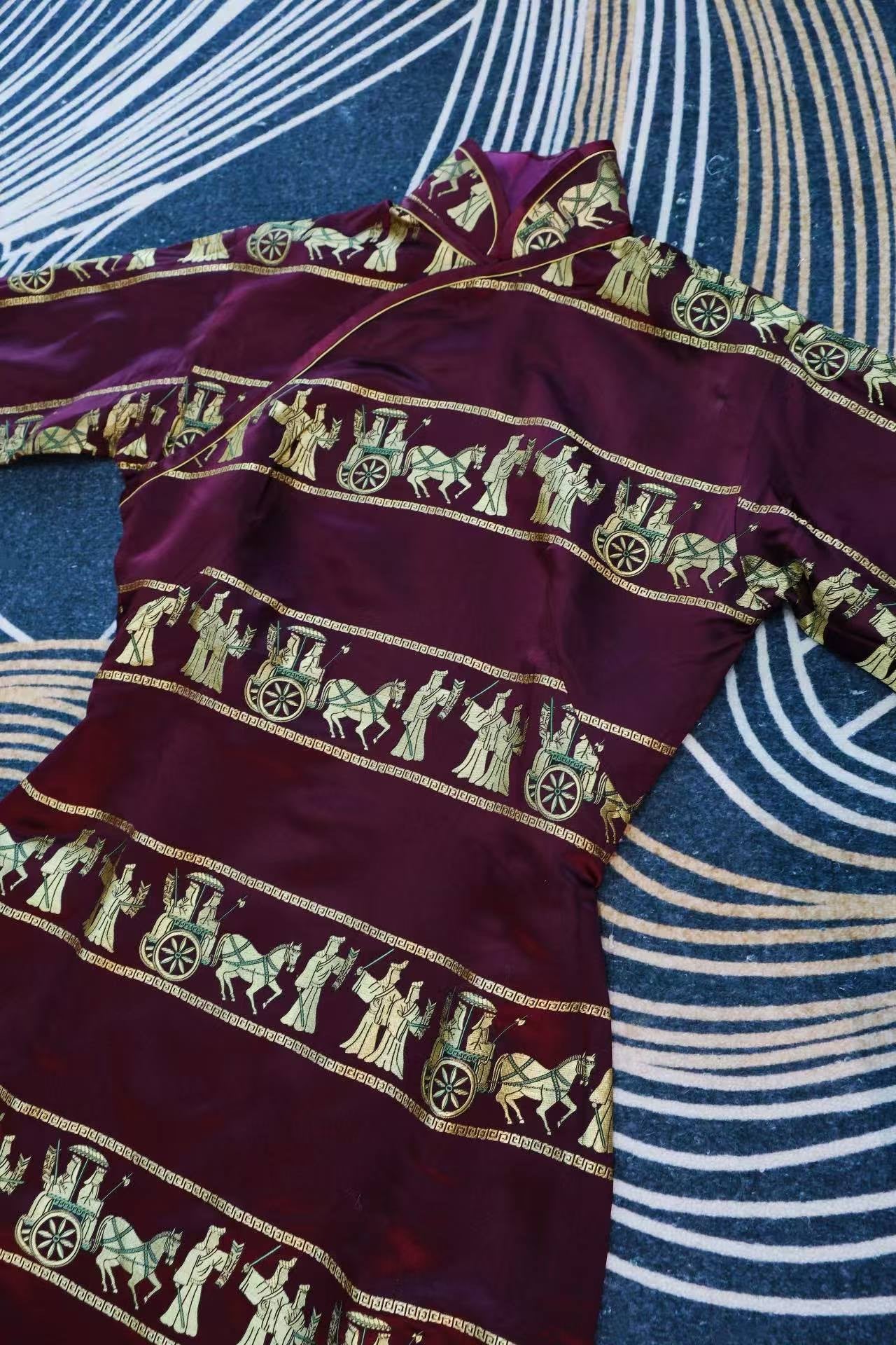 40年代 - 紫魅惊鸿·1940年代海派酒红织锦提花金线车马出行图古董旗袍 | 1940s - Purple Glamour & Startled Swan: A Late 1940s Shanghai-Style Wine Red Brocade Cheongsam with Gold-Woven Chariot Procession