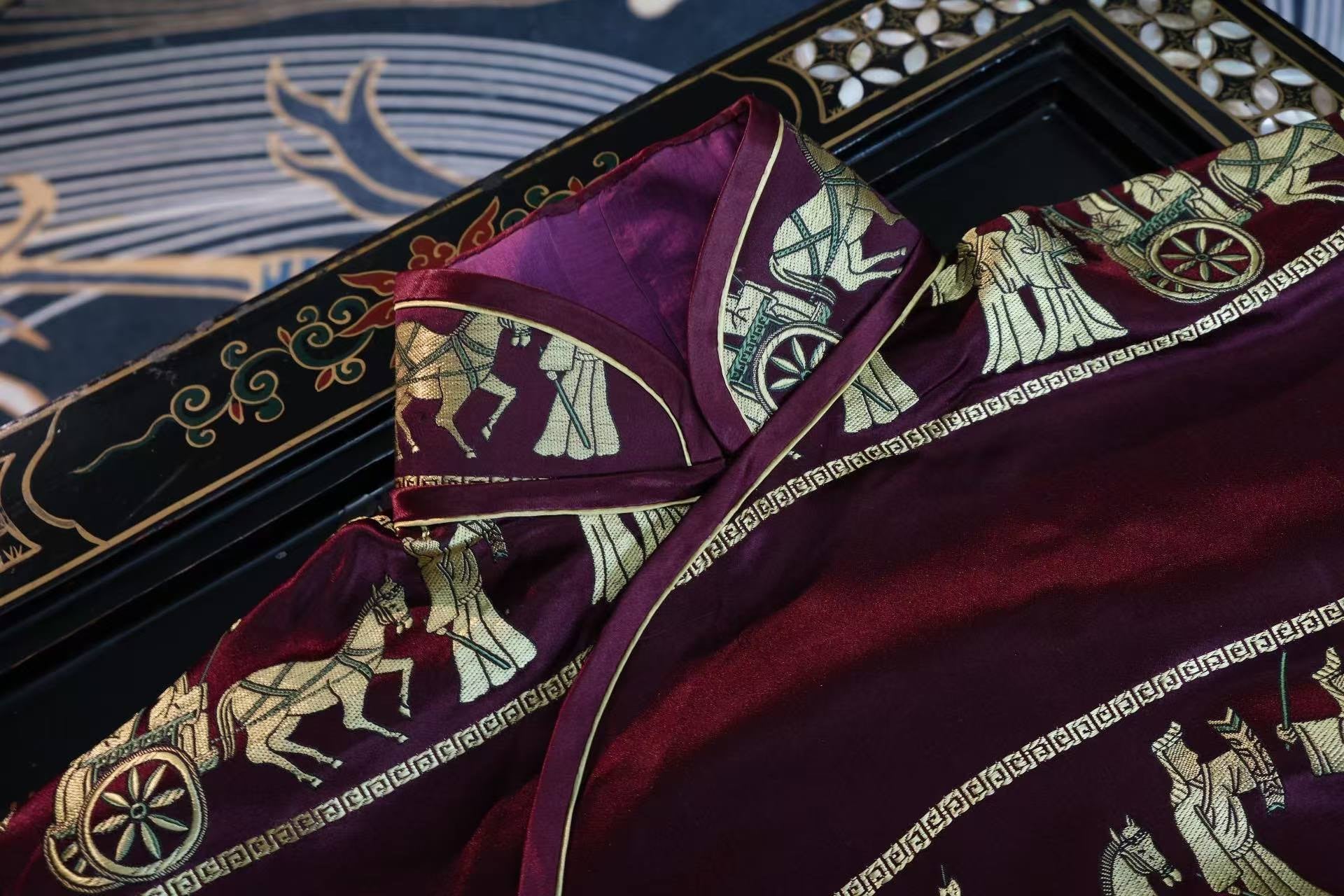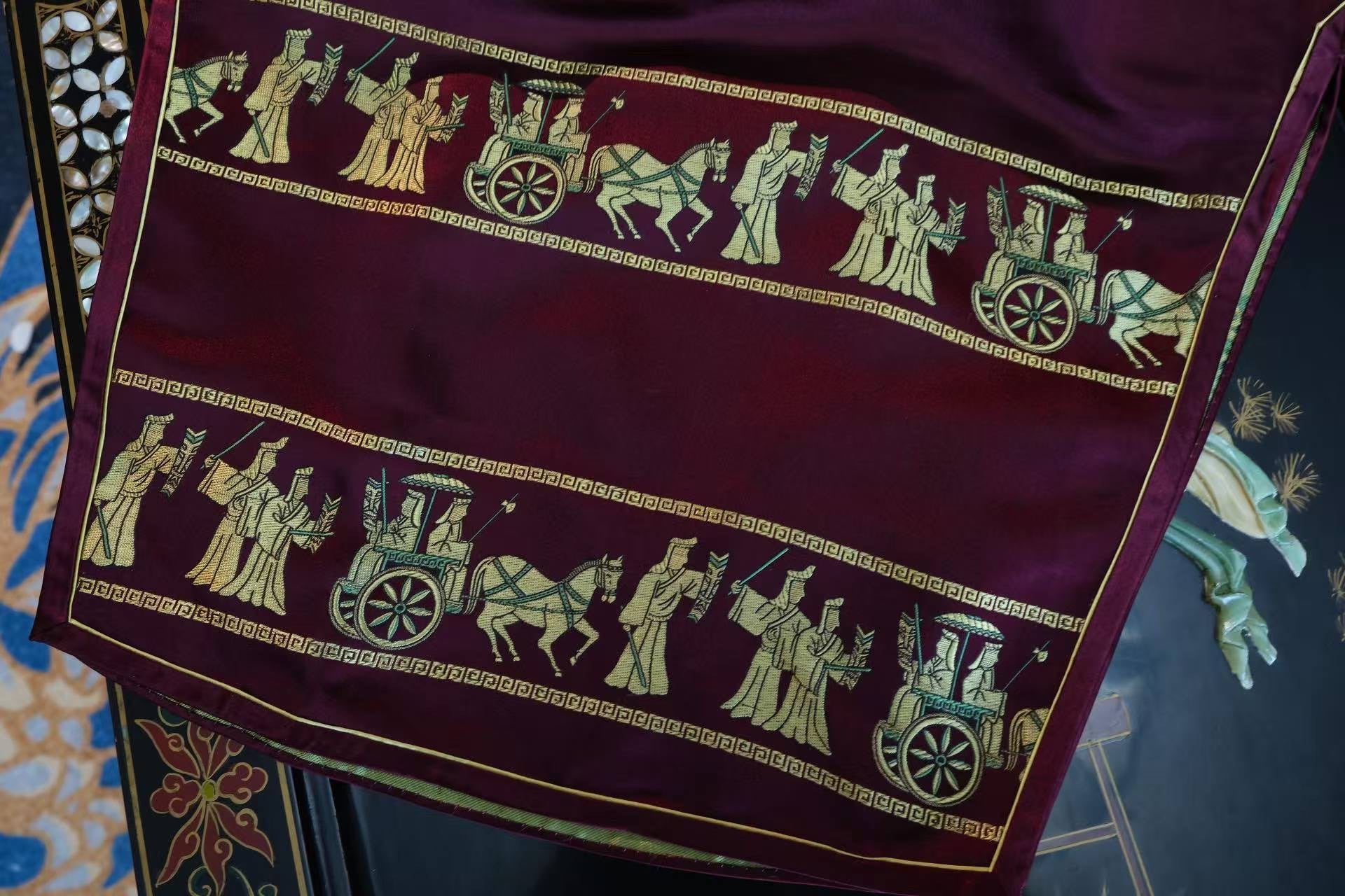 The "Chariot and Horse Procession" motif has remained a symbol of "status and ritual" for millennia, spanning from Warring States bronze jars to Tang Dynasty tie-dyeing and Qing Dynasty Kesi (tapestry silk). By integrating ancient rites into everyday attire, this robe serves as a "mobile ritual totem."