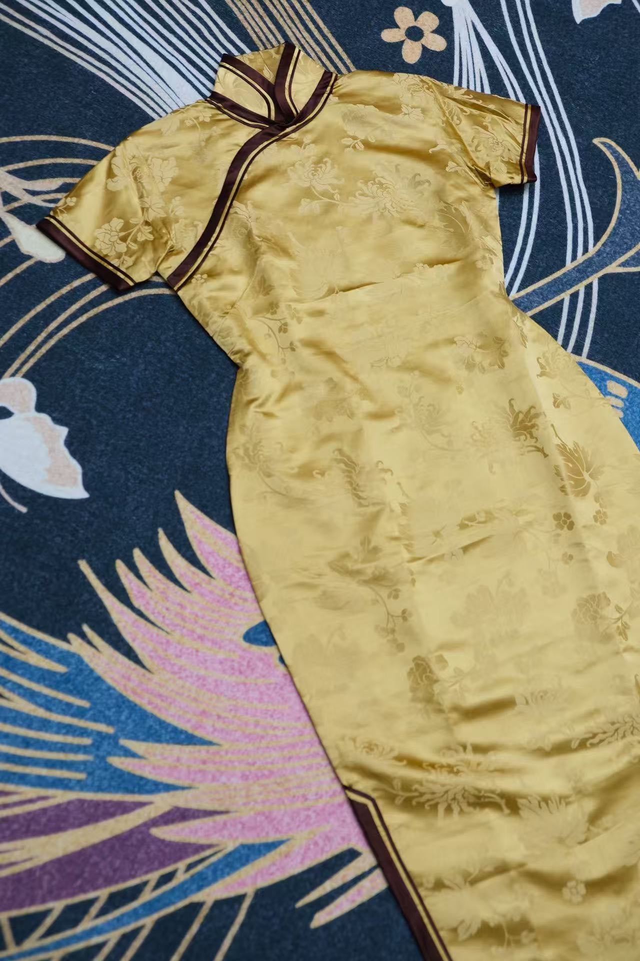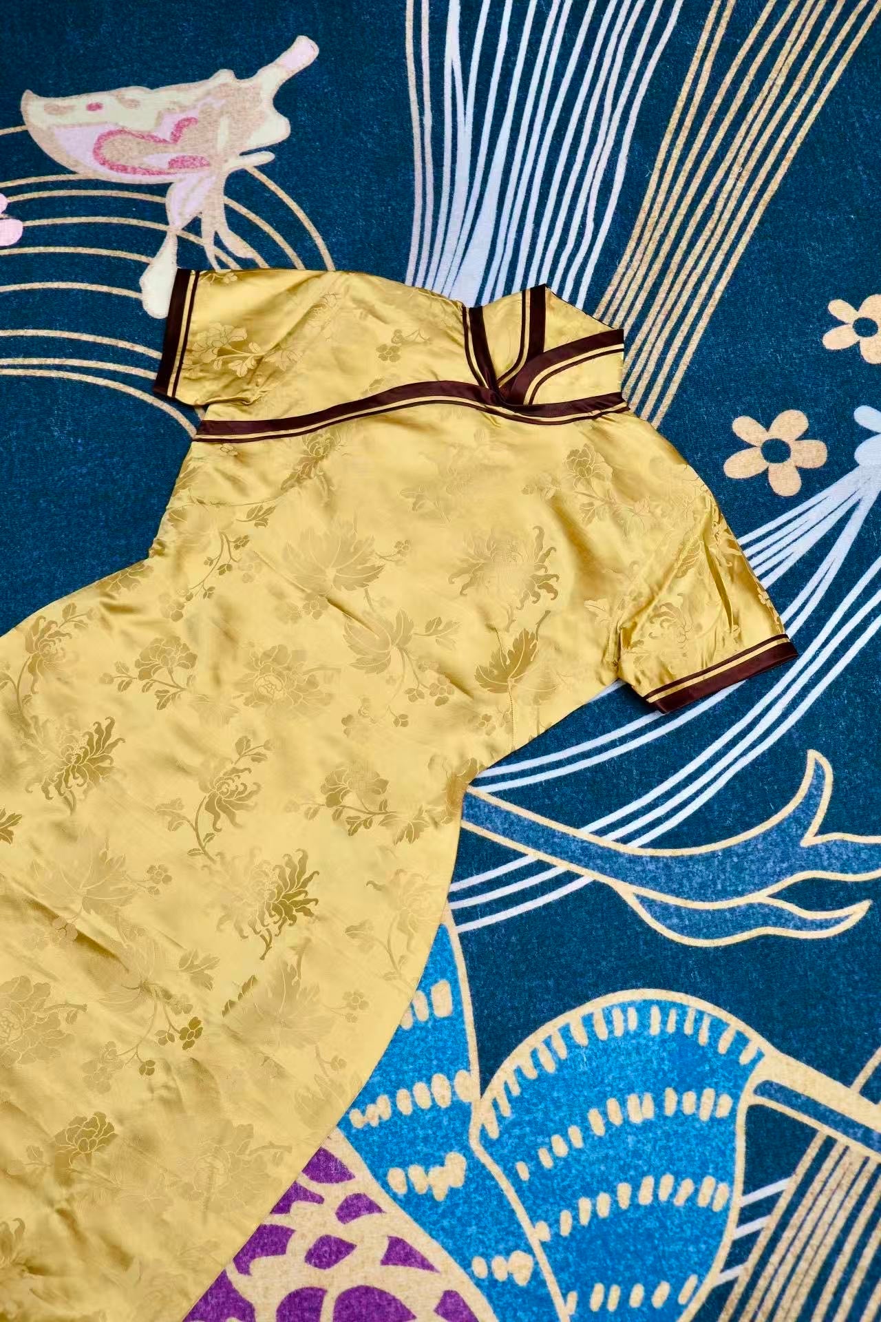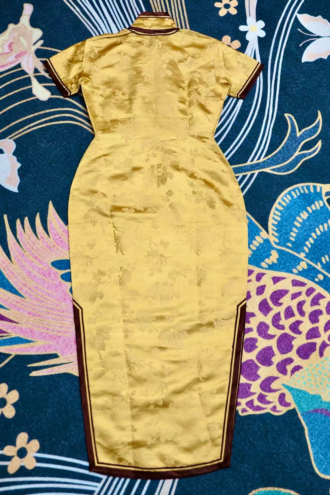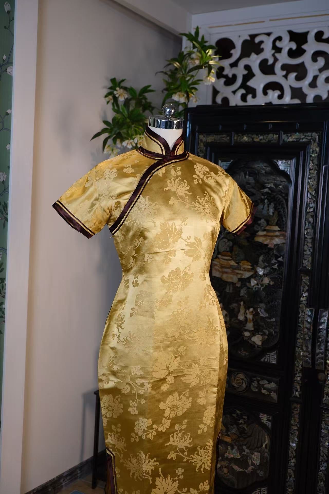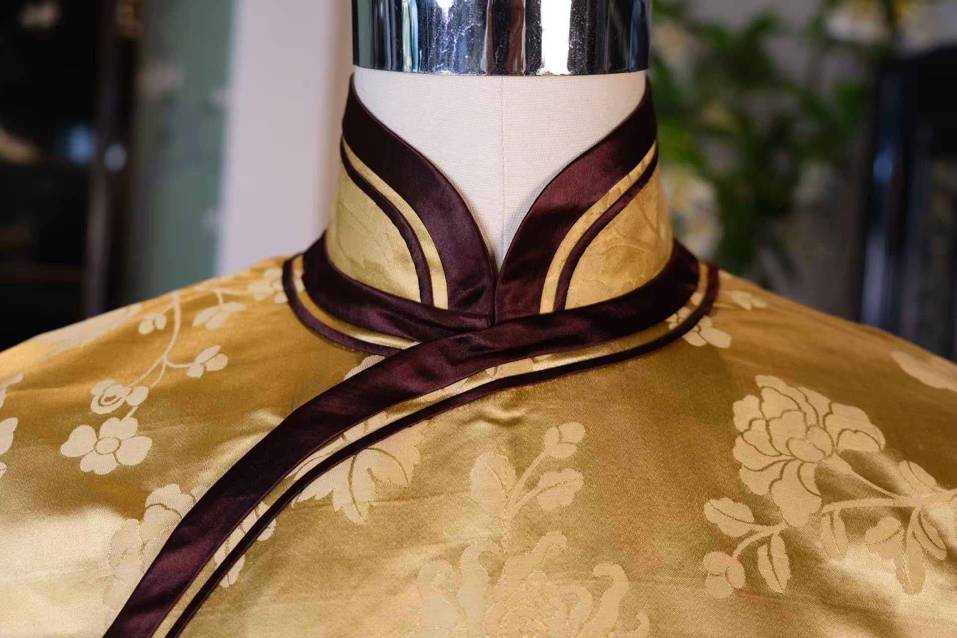 A highlight of this qipao is its distinctive broad, contrast-colored piping. Deviating from the common narrow trim, this piece features a rare, wide piping combined with a fine inner cord (大宽绲➕宕条) not often seen on Hong Kong gowns. The bold deep brown edging creates a striking visual impact against the sumptuous gold damask, achieving a look that is both fashionable and assertive. More than just an article of clothing, it is an artistic treasure that encapsulates history, craftsmanship, and a pioneering fashion sensibility.