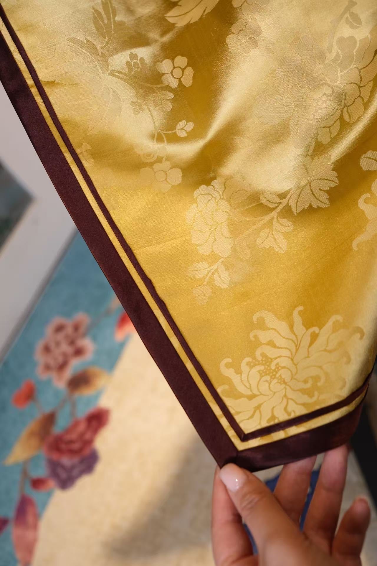 然而,其面料却穿越时空,选用的是民国时期的摹本缎——一种以精细的菊花纹样提花工艺制成的真丝面料,在光线下流转着华丽而内敛的光泽,象征着高洁与富贵。