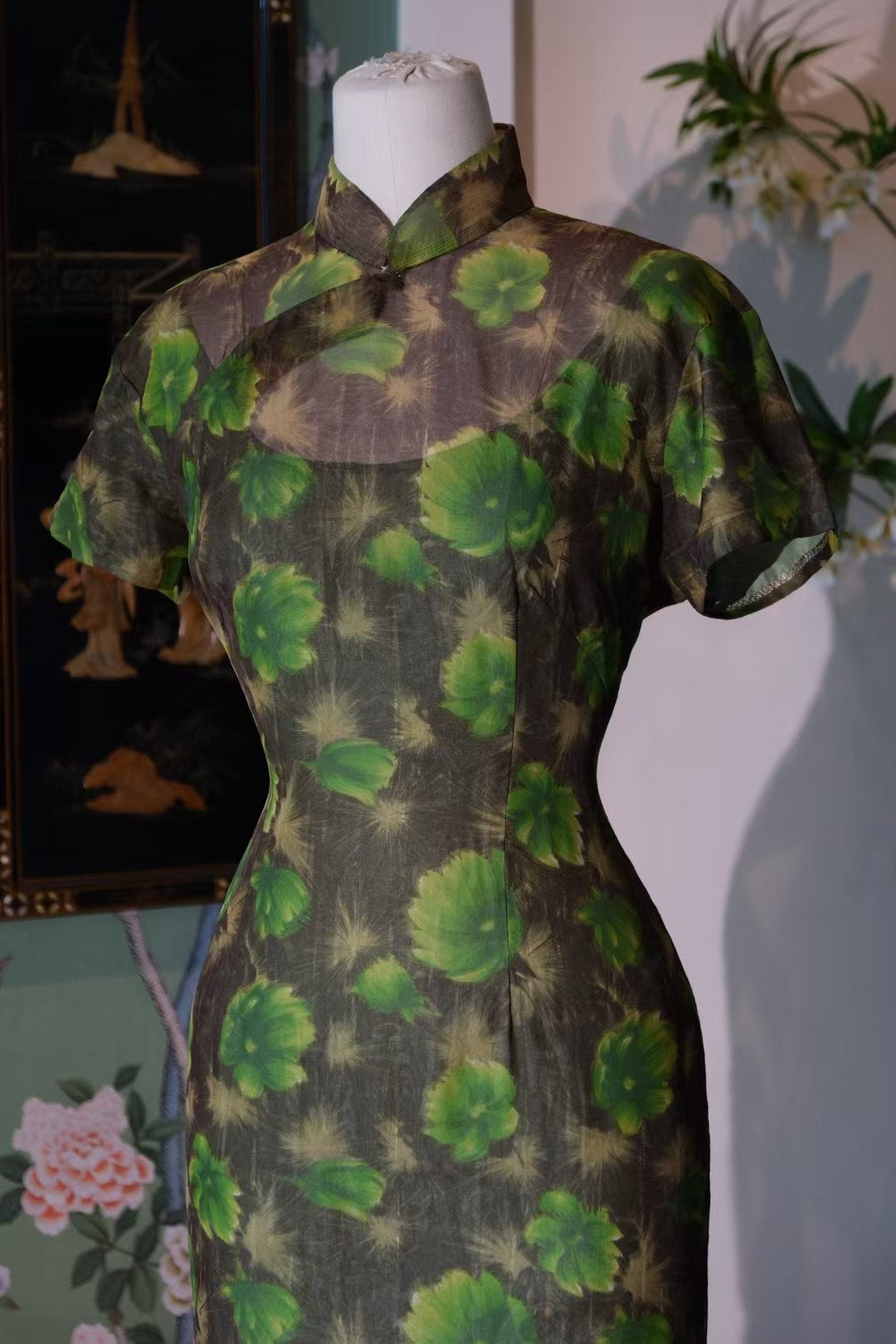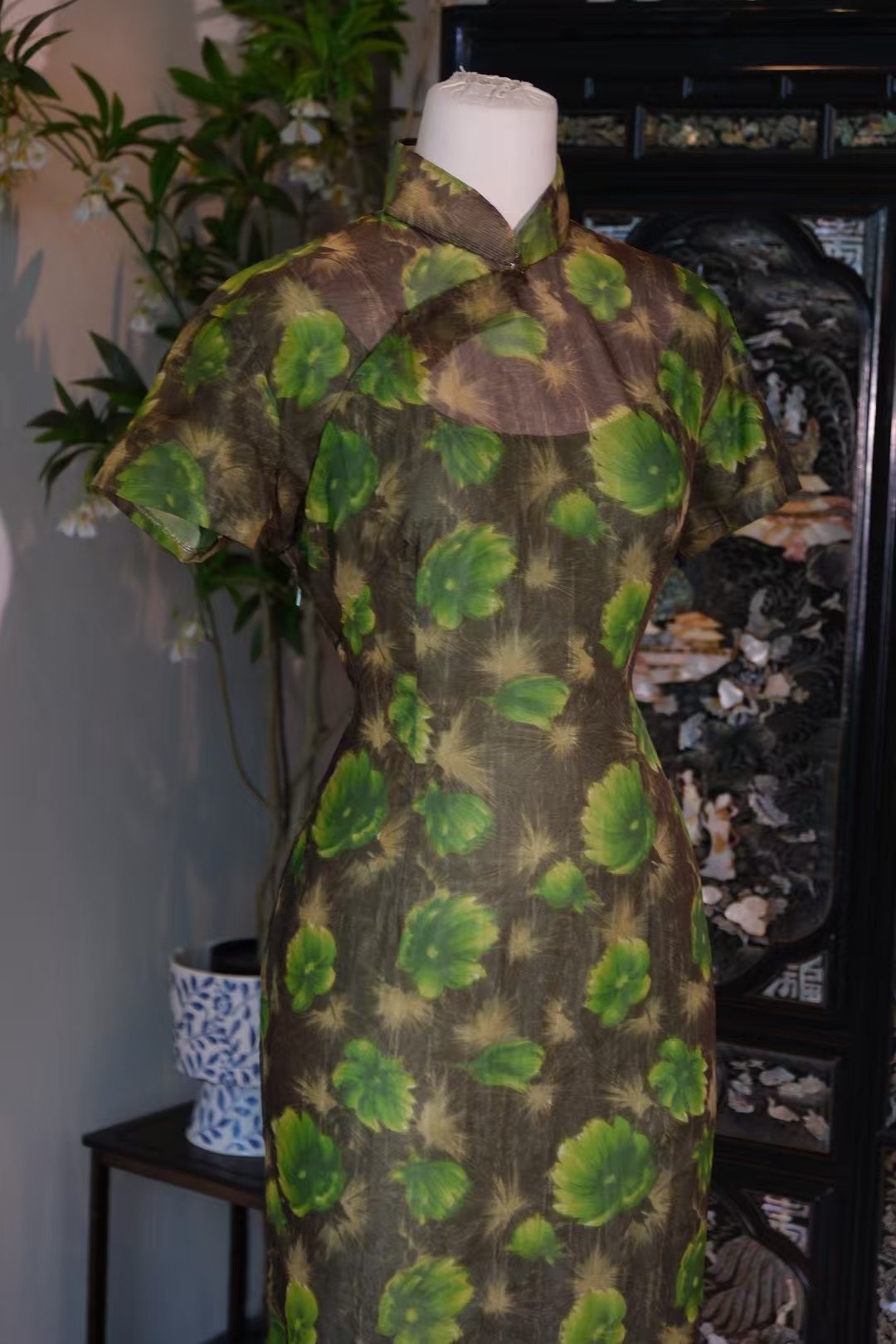 • 面料与质感: 旗袍甄选轻薄、微透的真丝乔其纱,带来空灵飘逸的视觉效果。底色是沉稳内敛的墨绿或深棕,如一池夏夜的静谧深潭,蕴含着历史的厚重感。