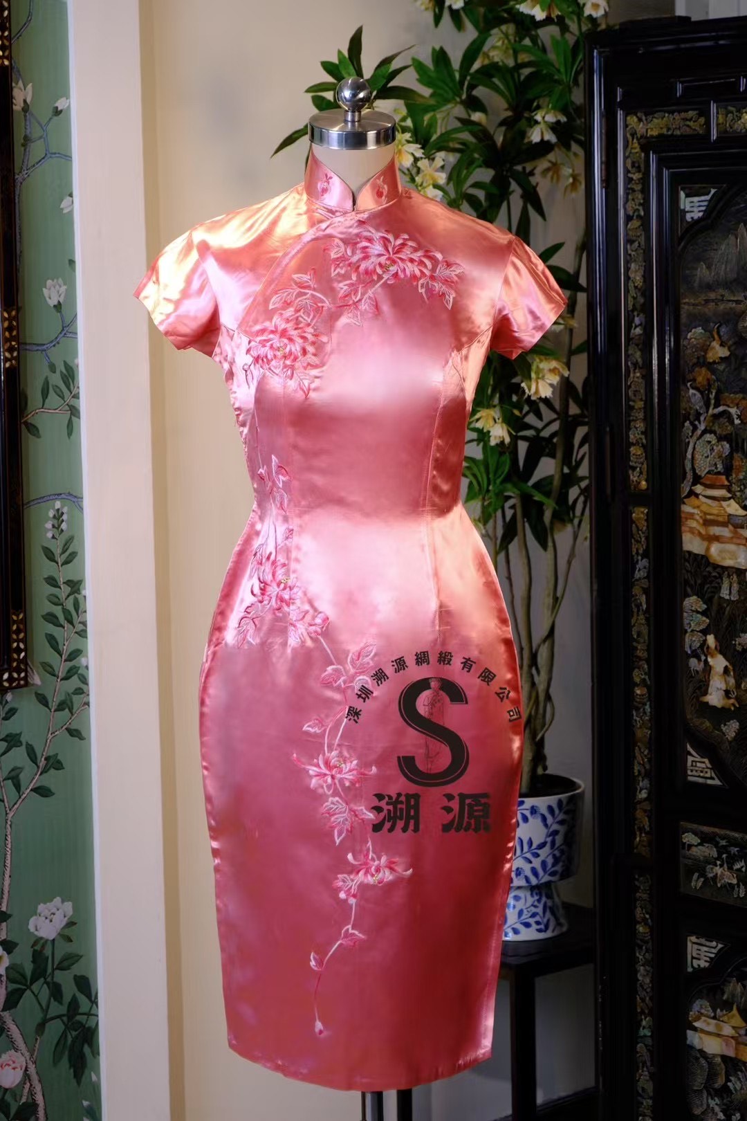 眼前这袭【桃华灼灼】精致手绘/刺绣花枝亮面缎面短袖修身旗袍,以其温润的光泽与细腻的纹样,描绘出一幅春意盎然的画卷。