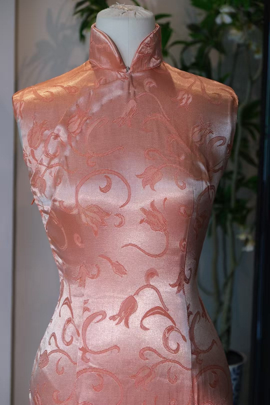 This sleeveless Cheongsam perfectly embodies reserved Oriental elegance mixed with sweet Western romance, utilizing its warm, jade-like color and finely luminous jacquard fabric. It captures the beauty of a young woman's prime, like the brilliant glow of peach blossoms on a branch.
