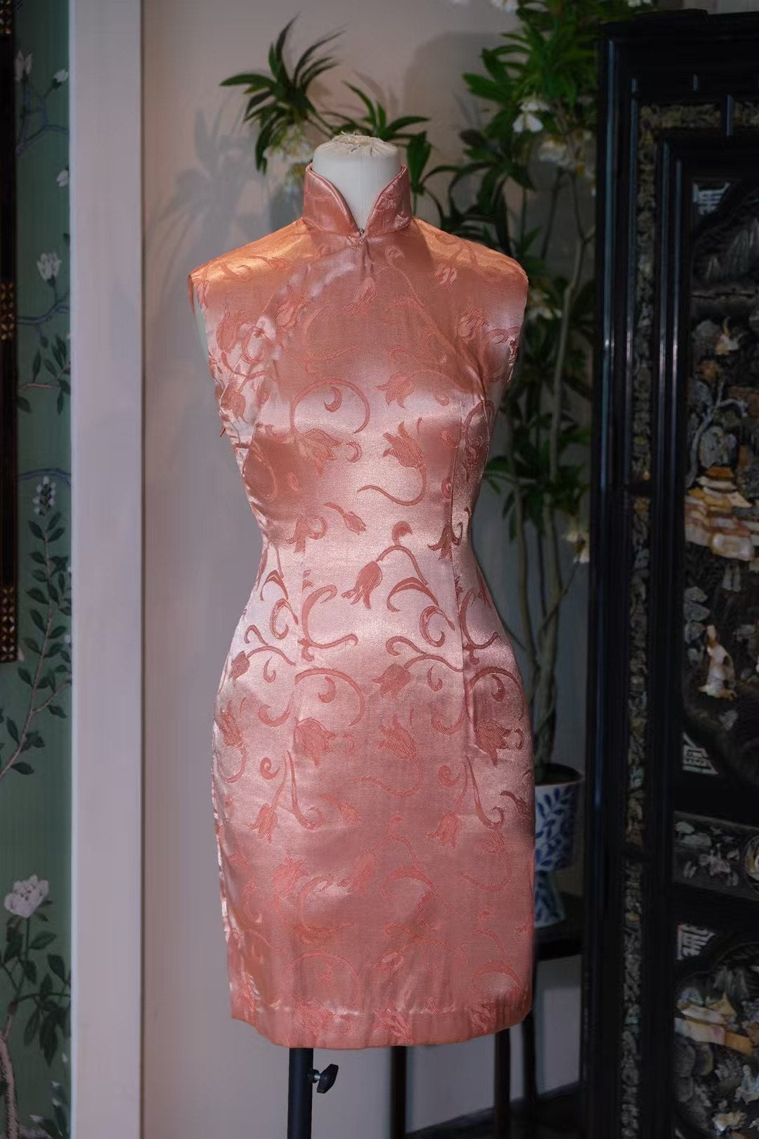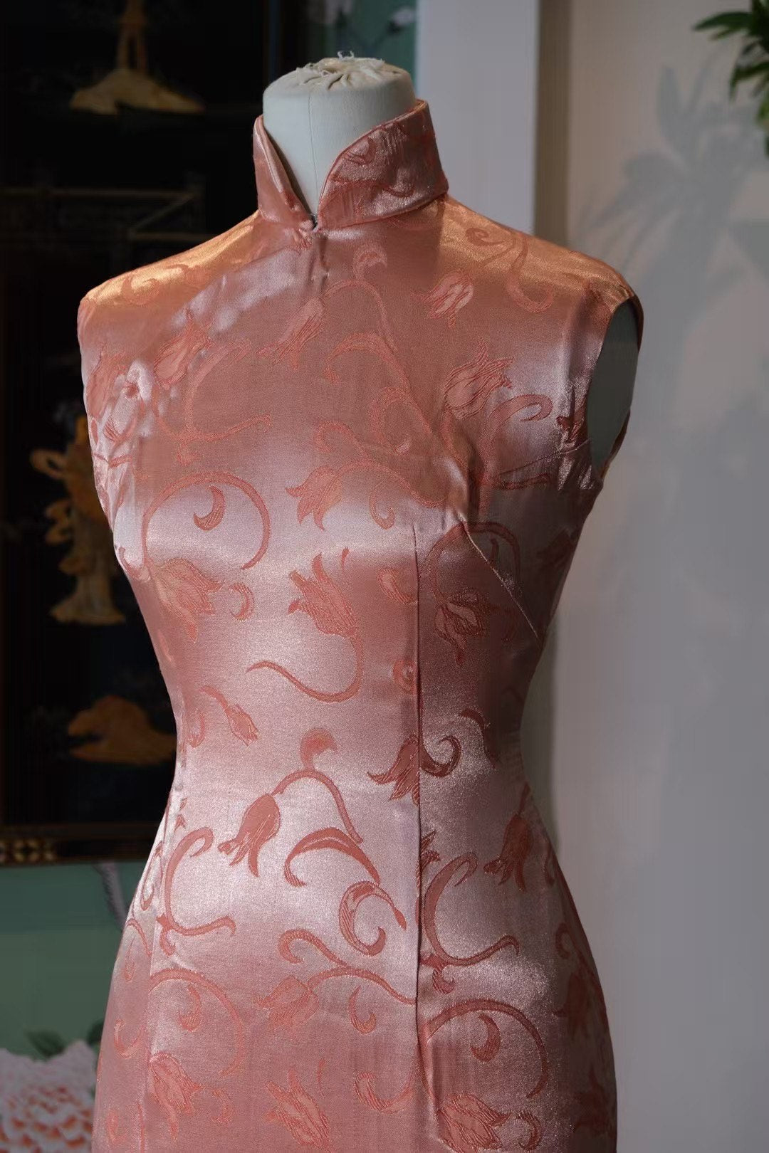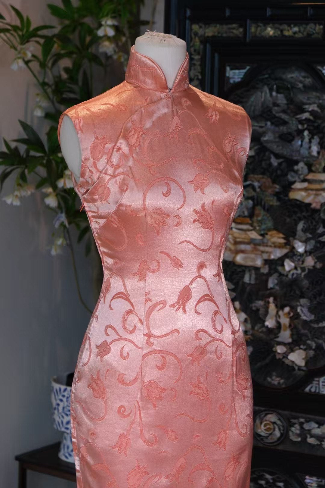 60年代 -《桃夭玉润 · 锦绣年华》—— 华丽光泽,提花暗纹的珊瑚粉无袖短款旗袍 | 1960s- "Peach Blossom Grace · Brocade Bloom Years" — The Lustrous, Jacquard-Woven Coral Pink Sleeveless Short Cheongsam