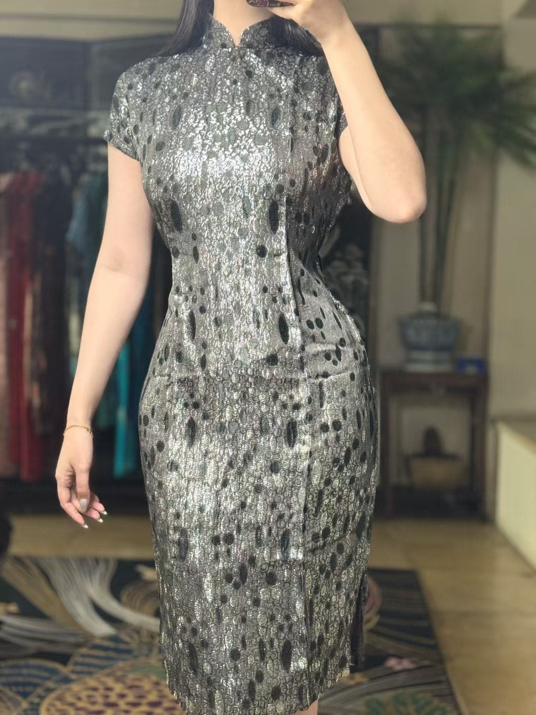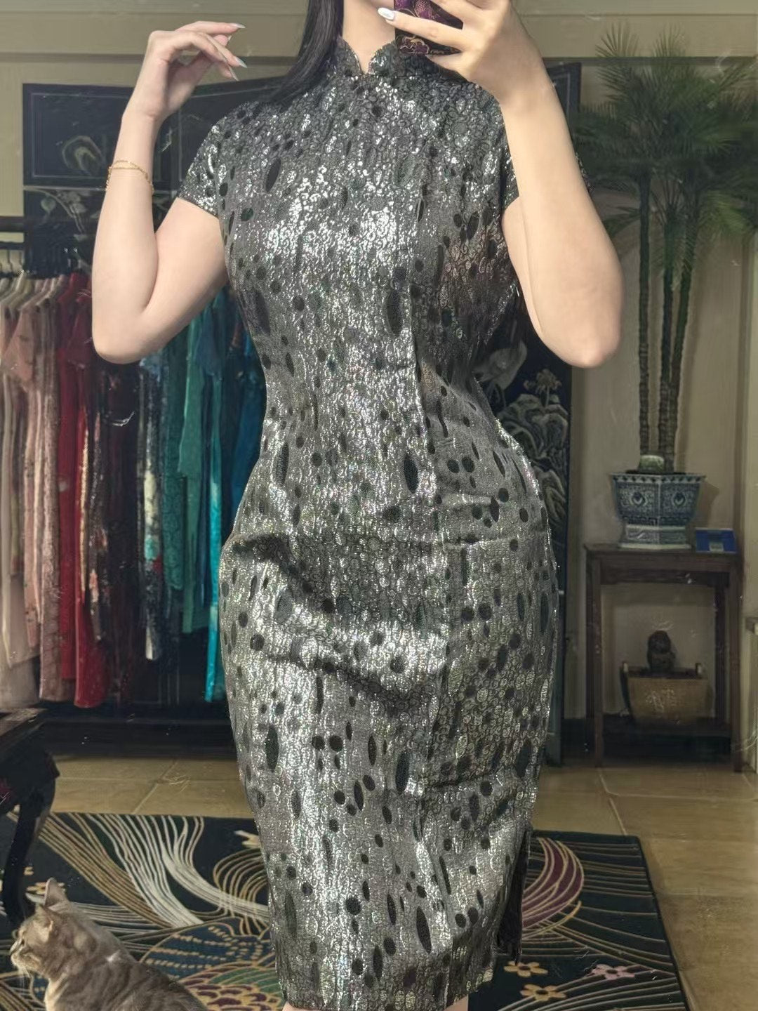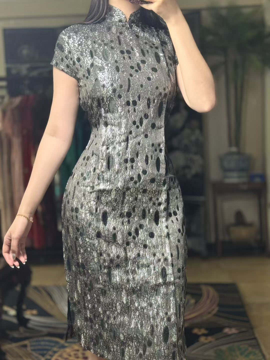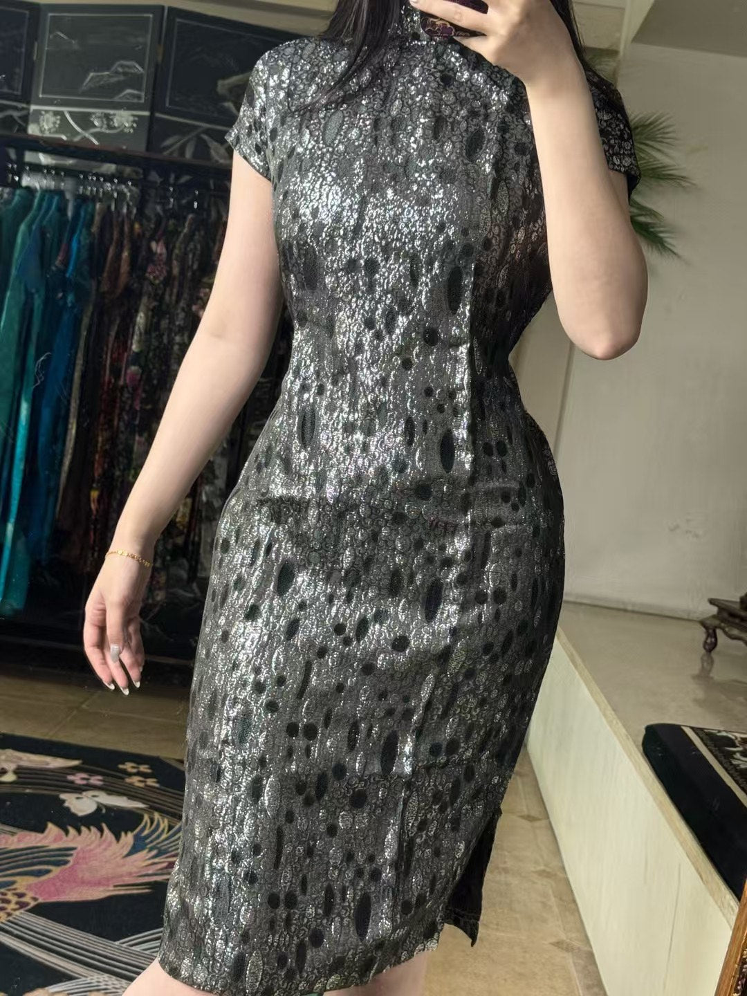 The visual impact of the fabric is the soul of this Qipao. Its dark base is illuminated by high-intensity silver metallic luster, with an irregular spotted pattern that resembles liquid metal flowing in the dark, or digital rain/glitch code from a sci-fi film. This unique texture and contrast give the Qipao an embossed texture that truly feels so modern, even today! It possesses a three-dimensional tension that leaps from the surface.