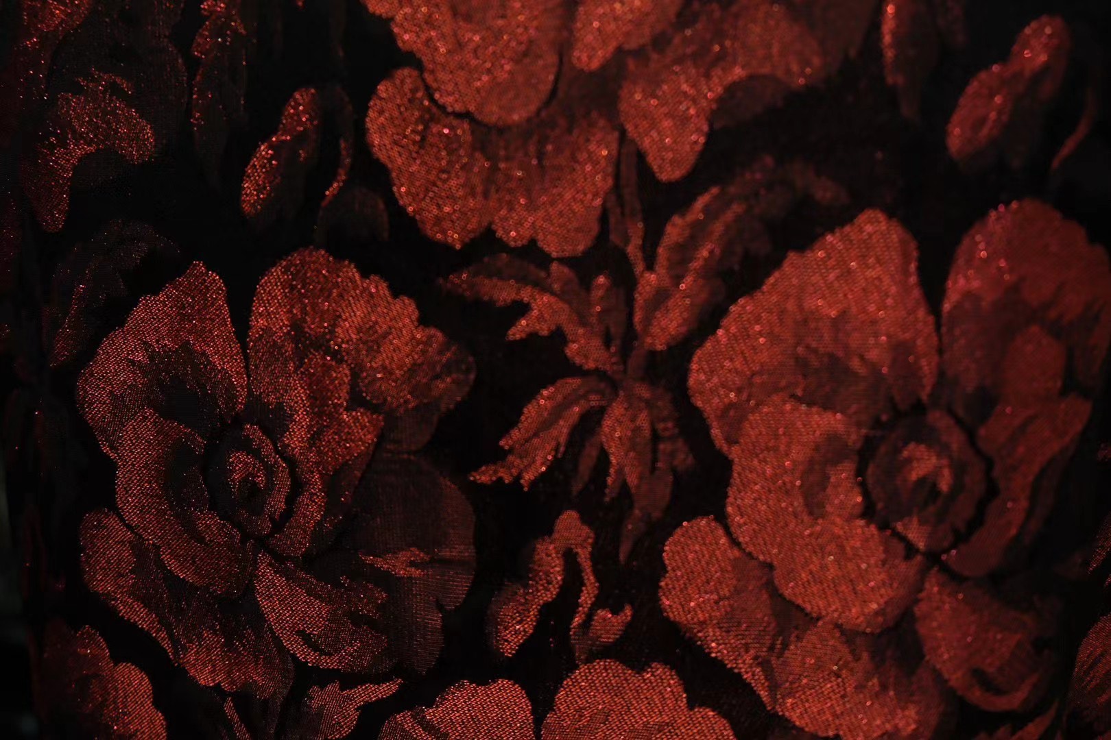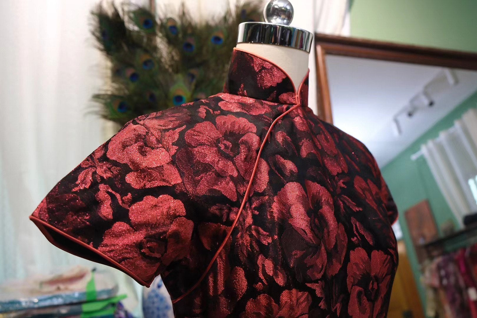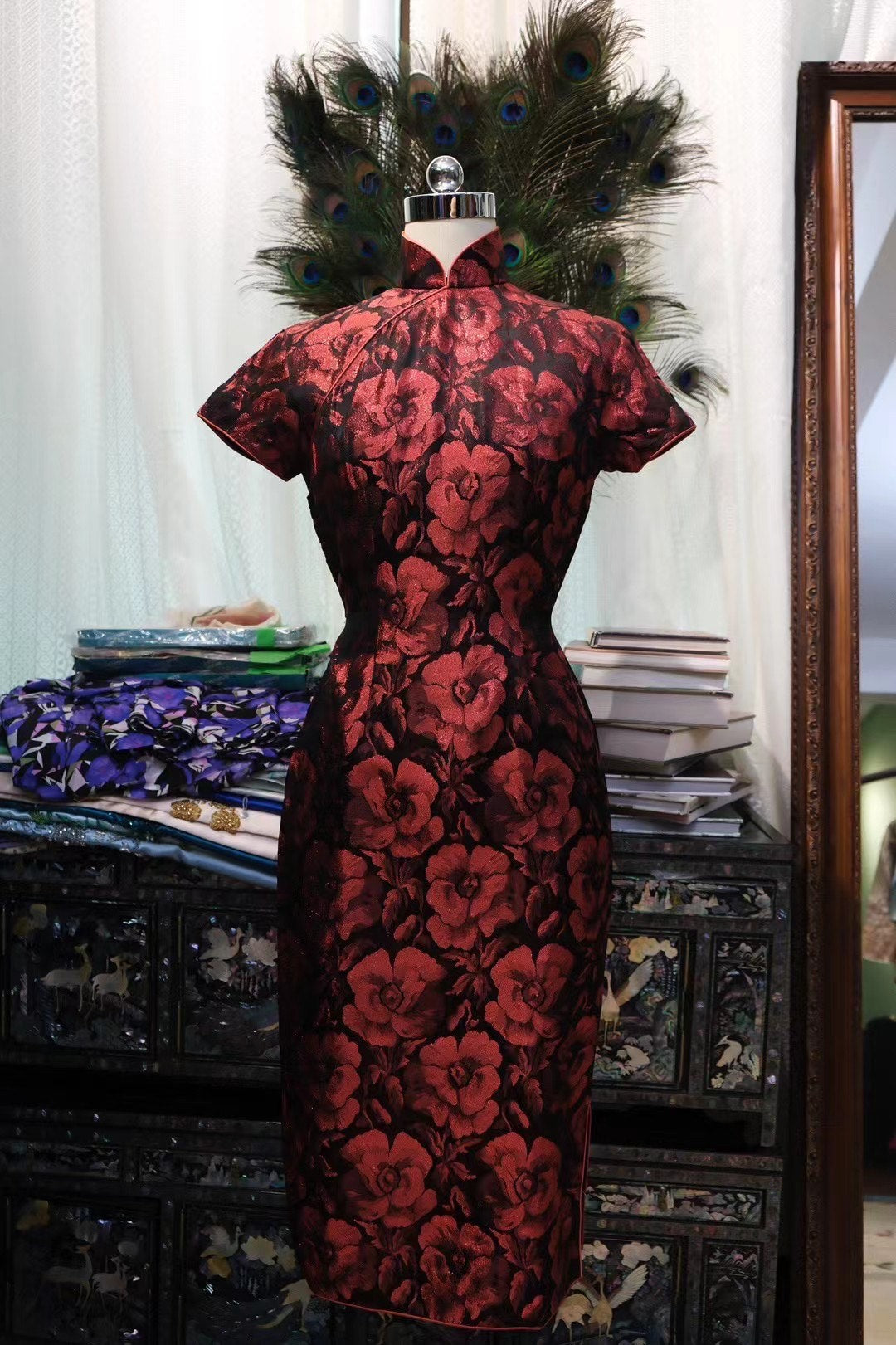 🖤 面料与色彩:黑底繁花,织金华贵 旗袍采用珍贵的黑地提花织锦(织金/织银)面料。深沉的黑色为底,织入大朵的嫣红色花卉图案,形成强烈的视觉对比。面料中隐约可见的金色提花线(或亮片线)使花朵在光影下闪耀,如同夜幕中盛开的玫瑰,自带一种沉淀的年代感和低调的华贵