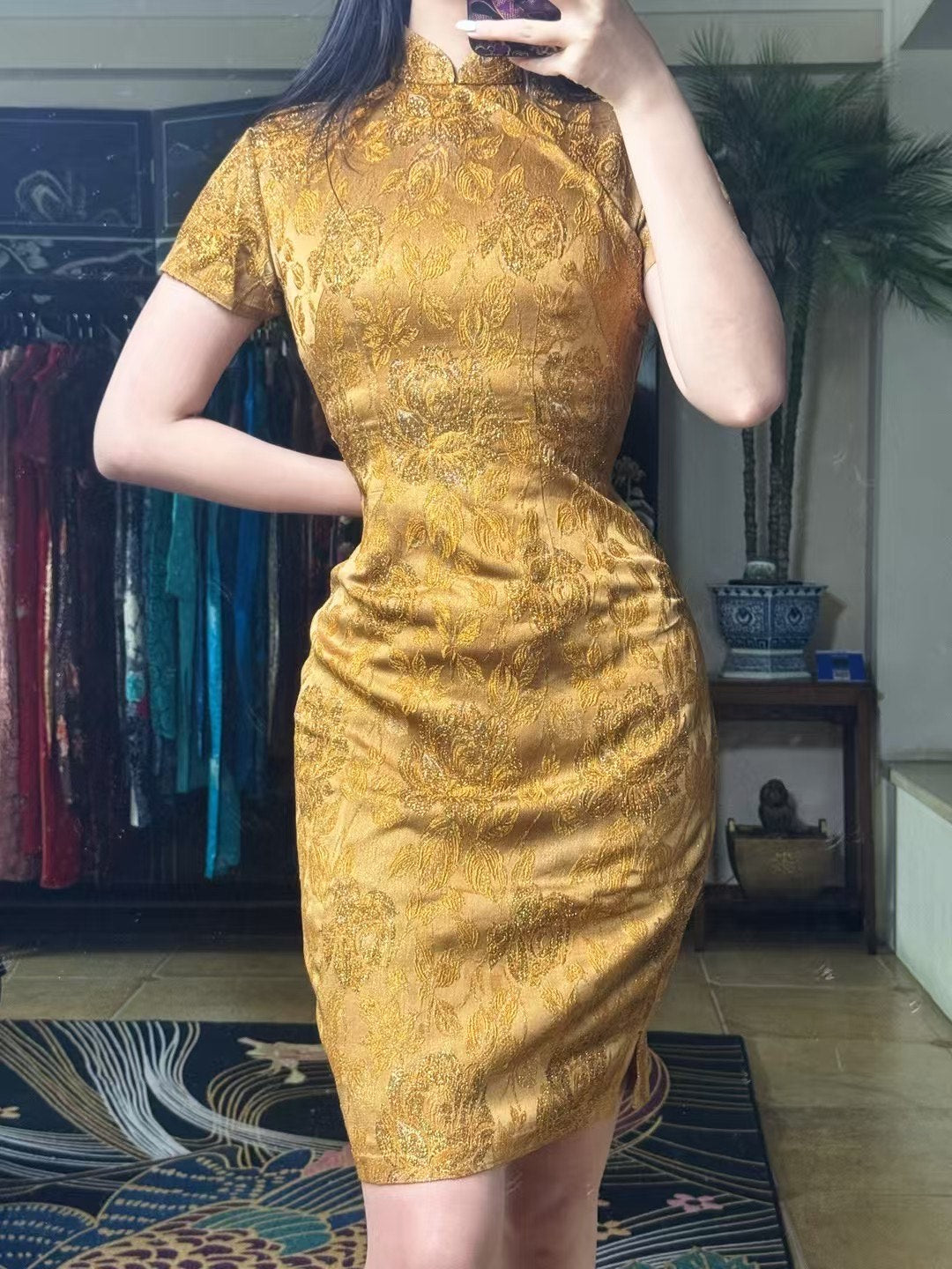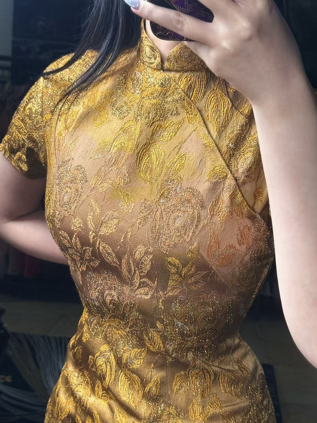 旗袍選用了華美的**「香檳金」織錦面料**,這種色彩不張揚、不刺眼,卻泛著醇厚而溫暖的鎏光。面料採用了精湛的織金工藝,將古典的**「玫瑰」**花紋以浮雕般的立體感織入其中。從不同角度看,玫瑰花紋在光影下若隱若現,充滿了視覺的深度和紋理感,這正是區別於普通印花的頂級工藝。