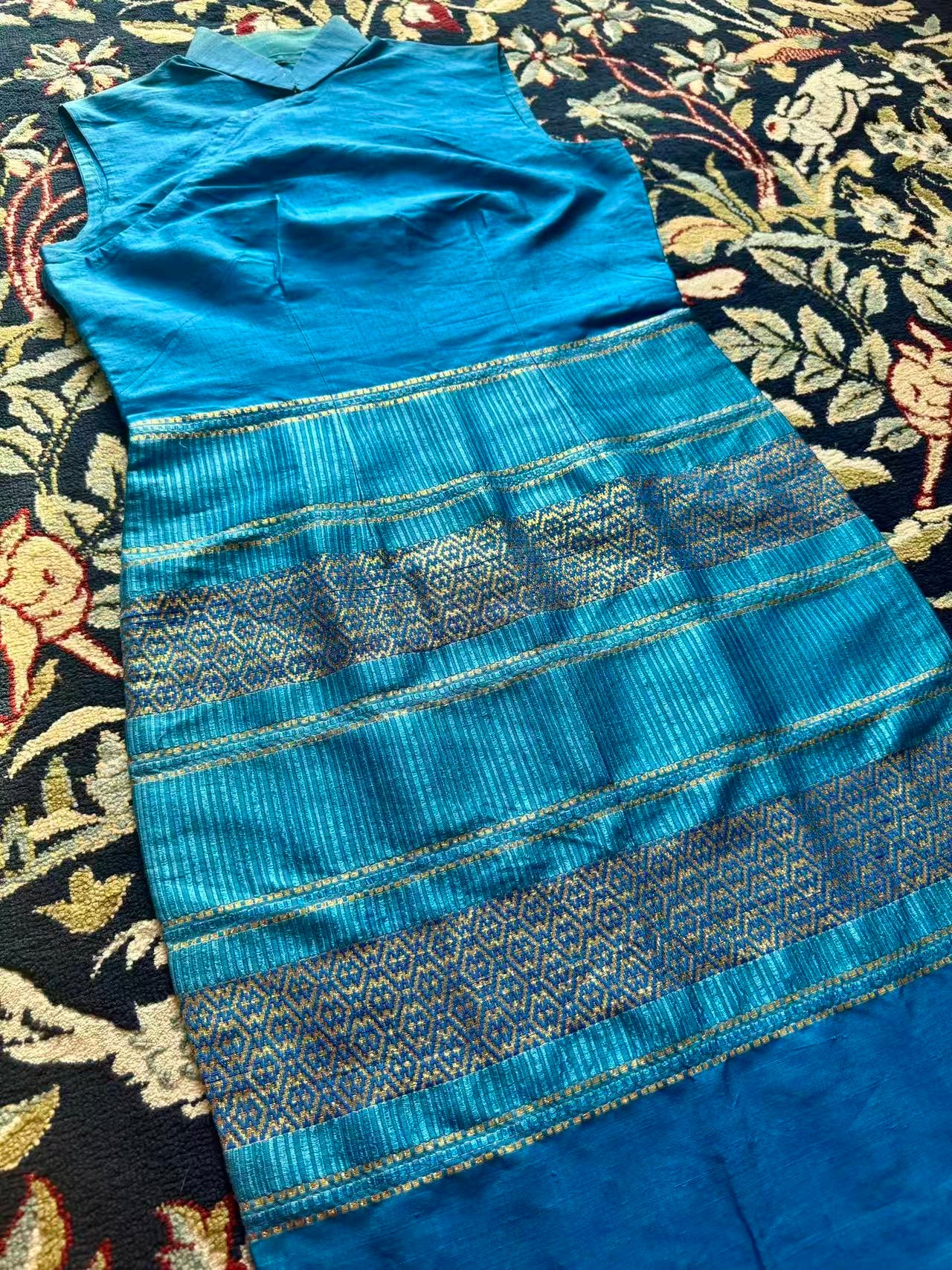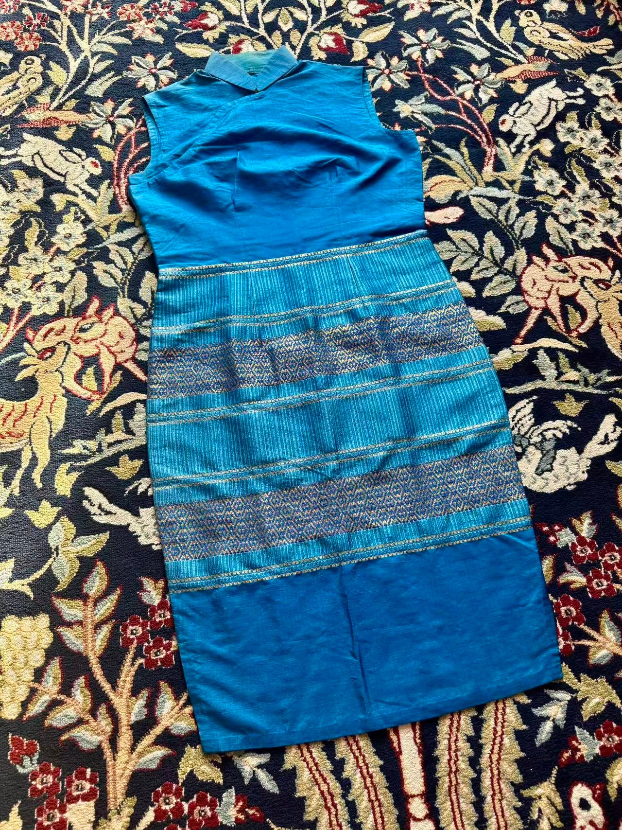 [I. Silhouette: The Essence of Mid-Century Grace] This piece, tailored in Hong Kong during the late 1950s, inherits the quintessential body-conscious tailoring of the Republican era while integrating contemporary aesthetics into its details. The Mandarin collar stands at approximately 5cm, elegantly veiling the collarbone; the sleeveless design showcases the arms, reflecting the liberating spirit of the age. With natural waist darting and a fluid hip silhouette, it preserves the traditional reserved contour of the Qipao while subtly aligning with the late-1950s tide of female empowerment.