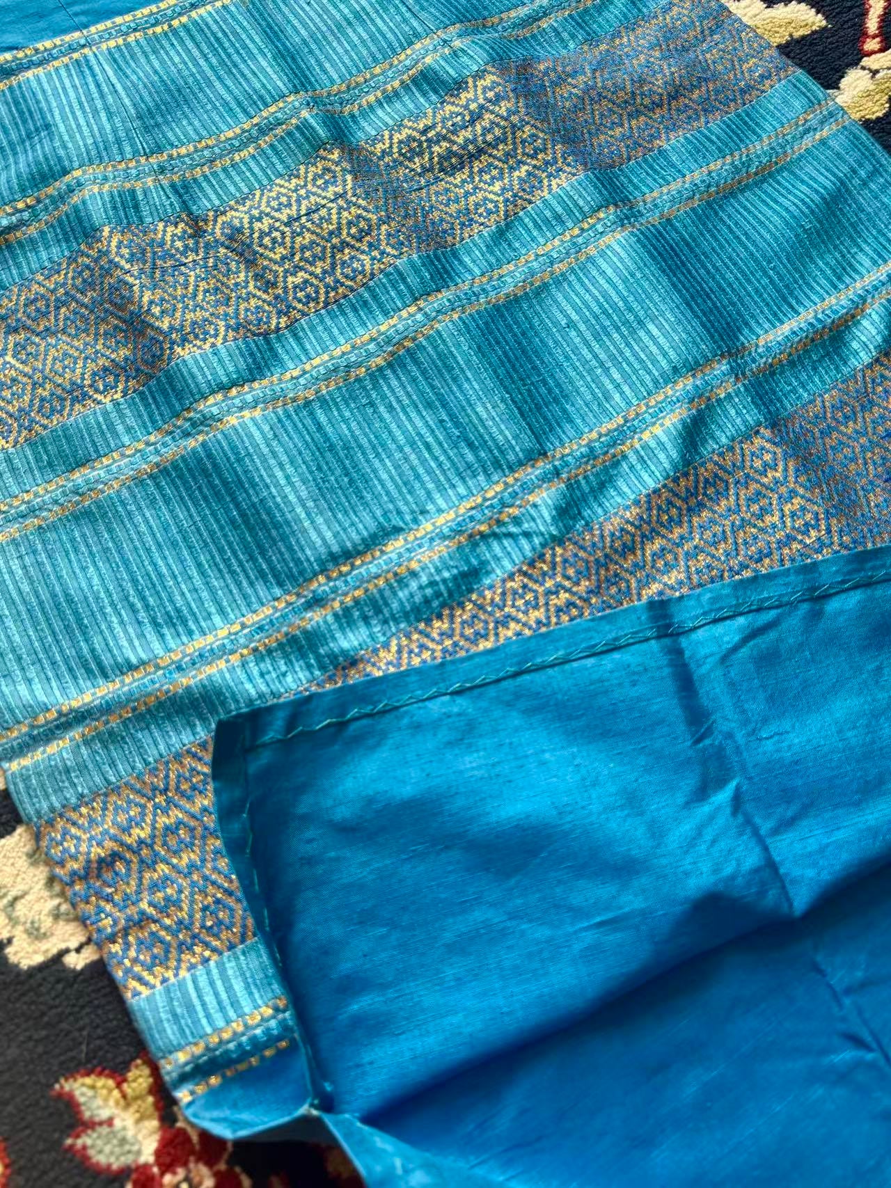 面料选用双宫丝(Tussah Silk),以柞蚕丝为经,桑蚕丝为纬,兼具粗犷与柔滑之质感。