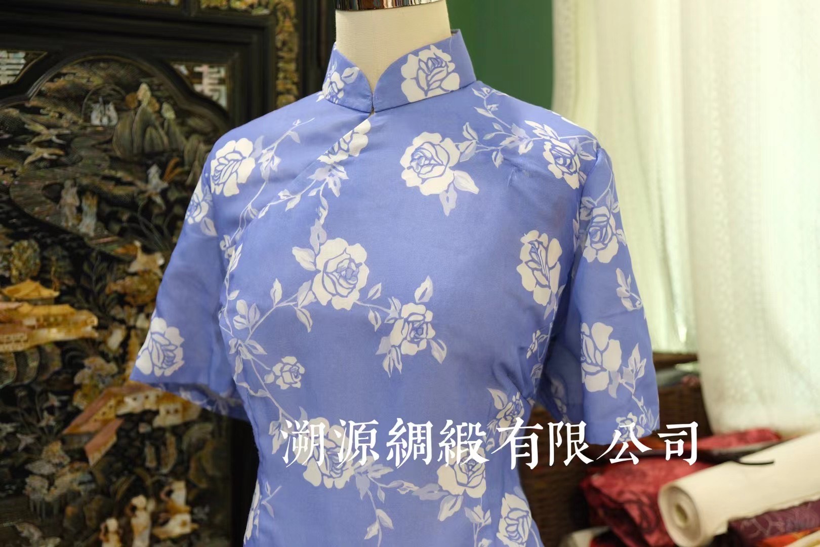 这件旗袍的主色调是罕见而高级的山梗紫——一种略带灰度的清新紫色,典雅而不失活泼。其上是精致的玫瑰枝印花图案,清雅的白色玫瑰花朵和蜿蜒的枝蔓散落其间,营造出一种藤蔓缠绕、清风拂过的浪漫意境。