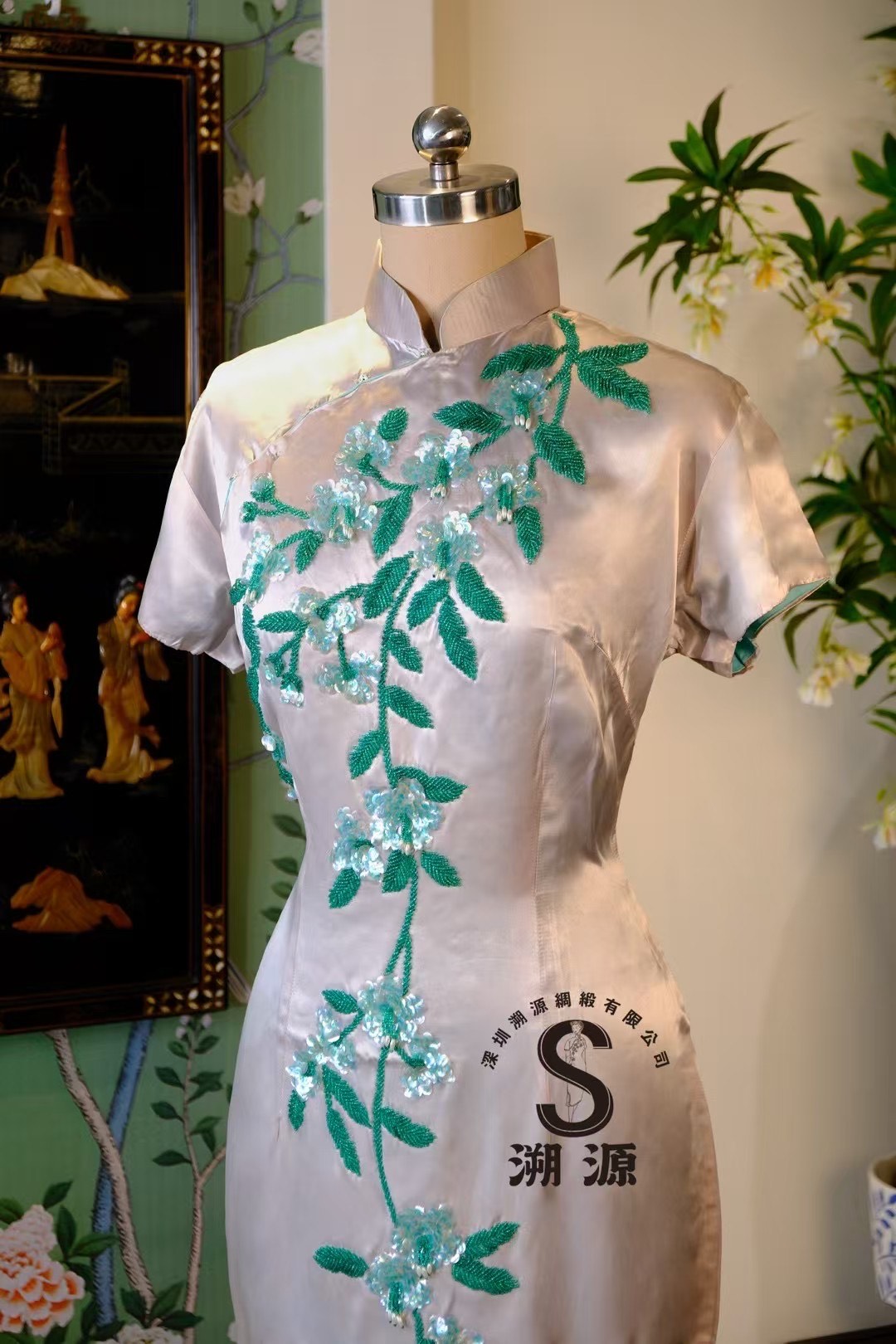 設計的焦點集中在精緻的手工珠繡(Bead Embroidery)之上。工匠們用細膩的針法,以翠綠色珠子勾勒出蜿蜒的藤蔓與葉片,並巧妙地綴以淺藍綠色的亮片花朵。這些花朵彷彿清晨凝結的露珠,立體而閃耀,從右肩沿著大襟線條一路垂落,打破了素色緞面的沉靜,帶來生機與靈動。