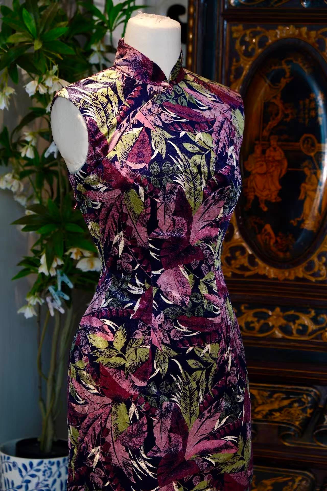 分享一件上世纪六十年代南洋风热带植物丝绒印花古董港式旗袍。