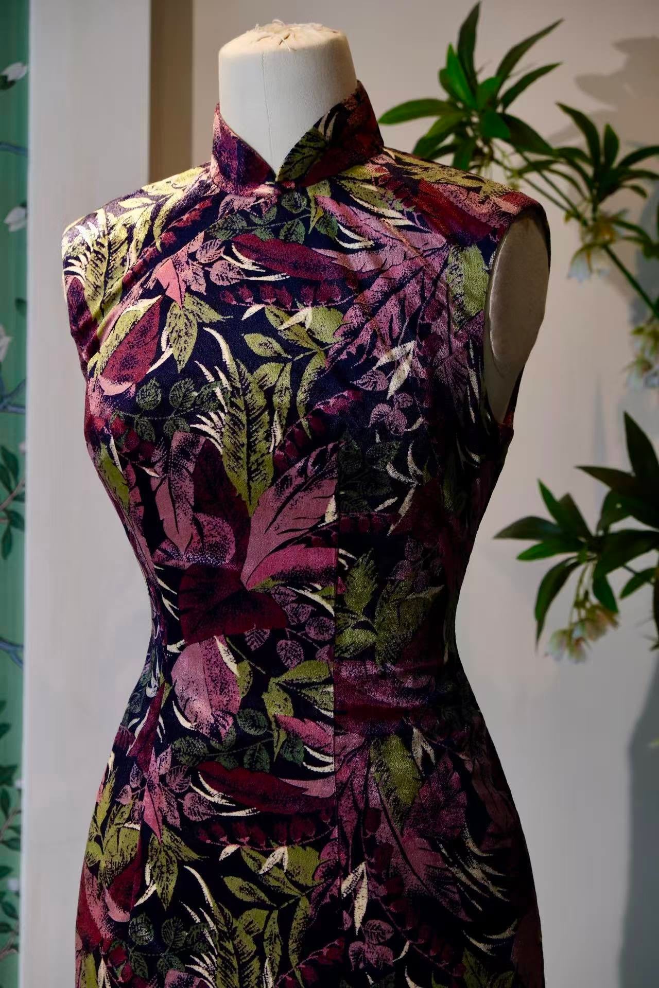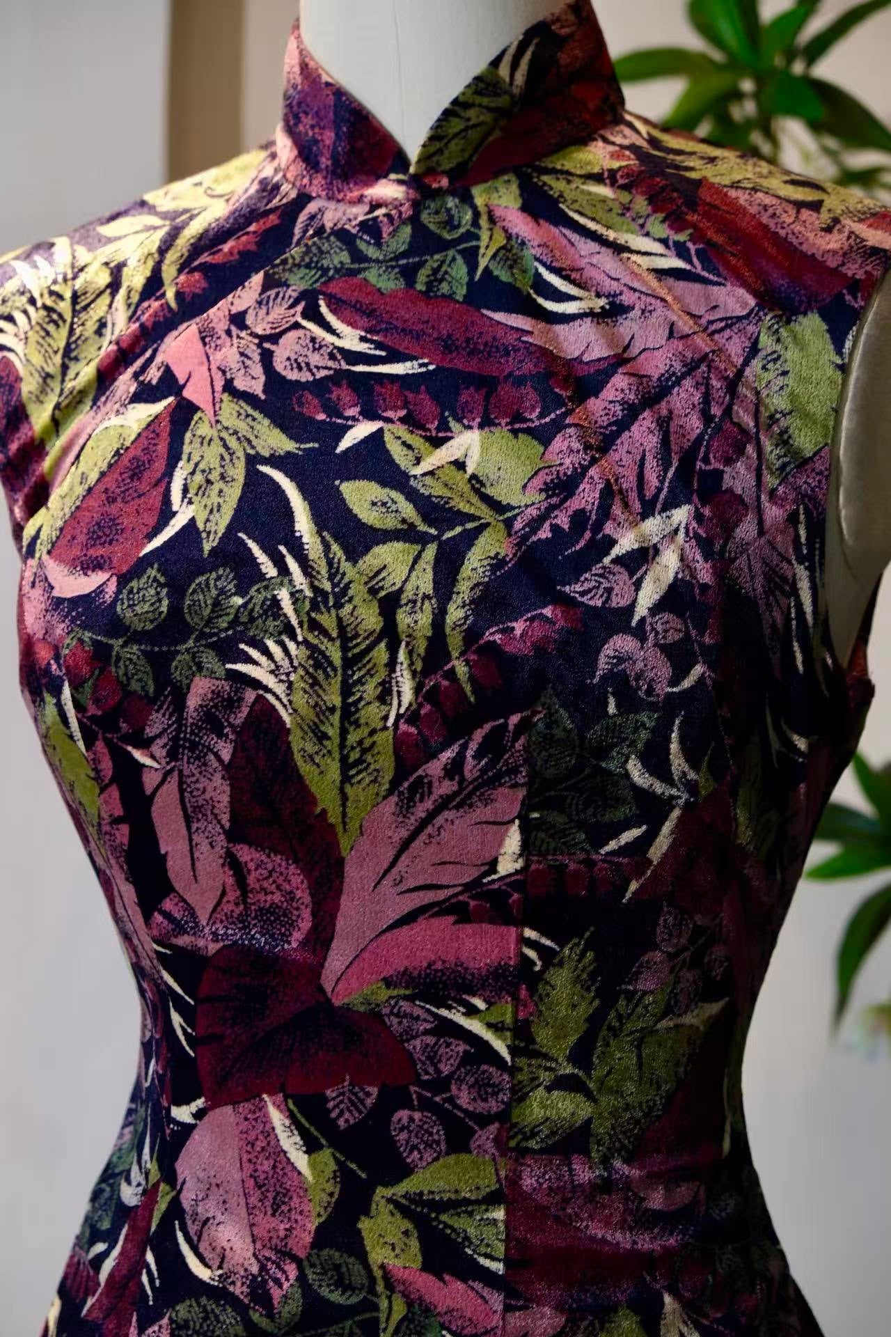 60年代 - 上世纪六十年代南洋风热带植物丝绒印花古董港式旗袍 | 1960s - An Antique Hong Kong-style Cheongsam from the 1960s, Featuring a Southeast Asian-inspired Tropical Plant Velvet Print
