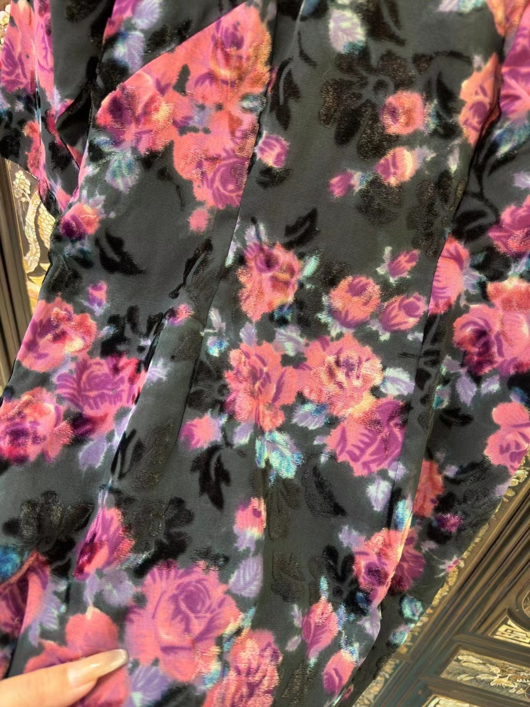 • 烧花丝绒的奢华触感: 独家采用烧花(Devoré)工艺的厚重丝绒面料。在深黑底色上,大朵的玫瑰图案以立体天鹅绒的质感凸显,形成了光泽与哑光、透明与实心的迷人对比。丝绒的垂坠感和光影变化,使得玫瑰仿佛在暗夜中生动盛放。