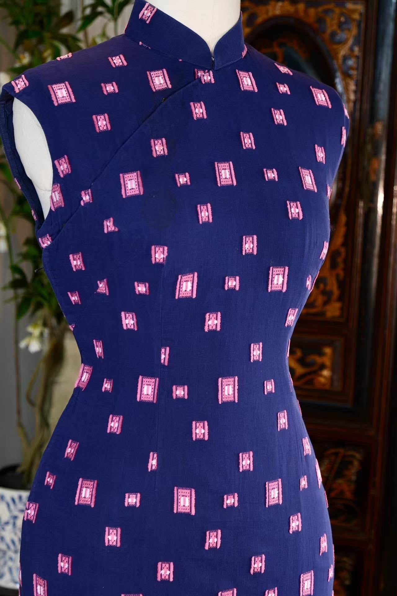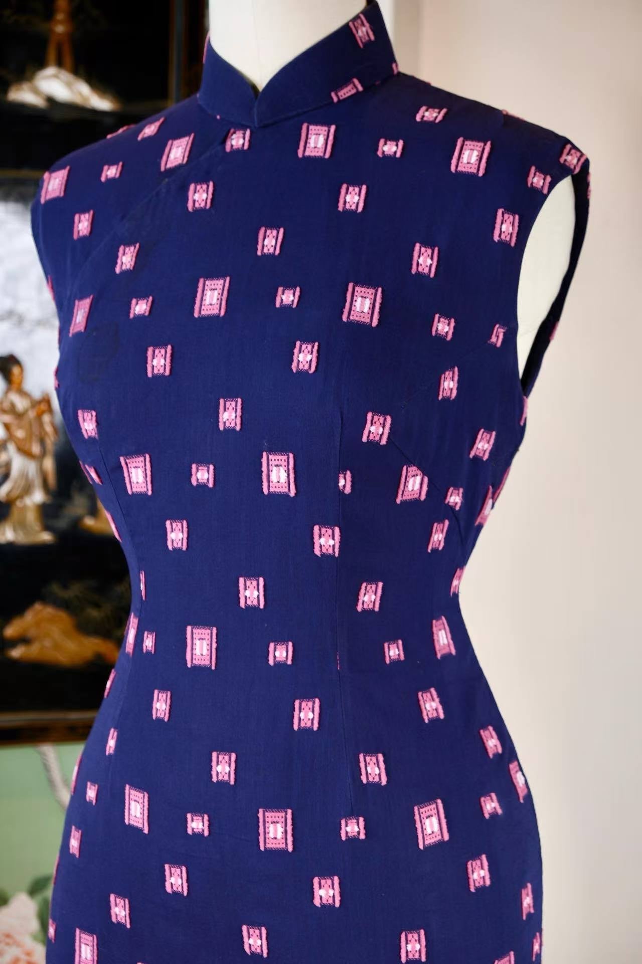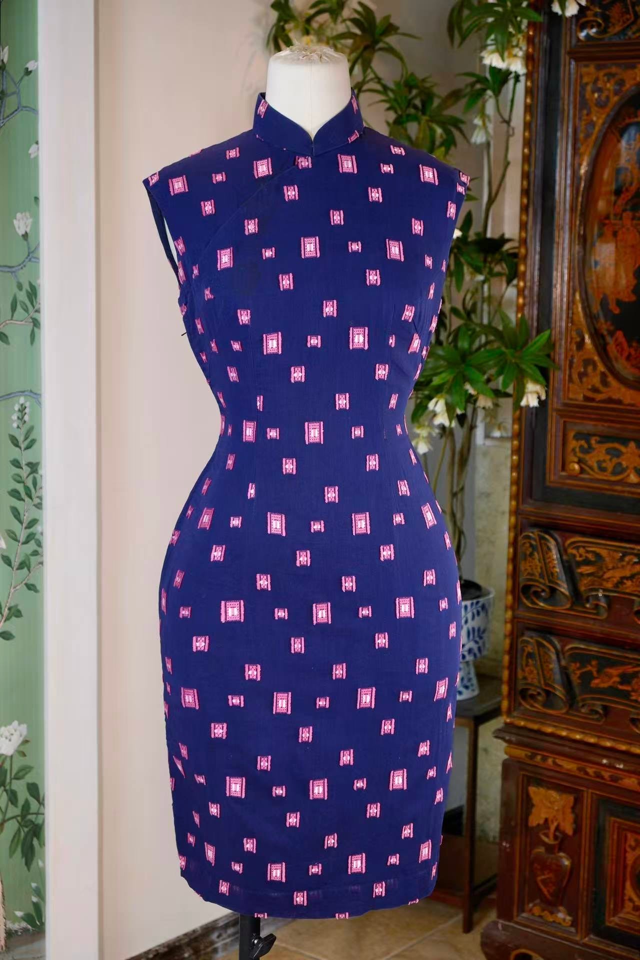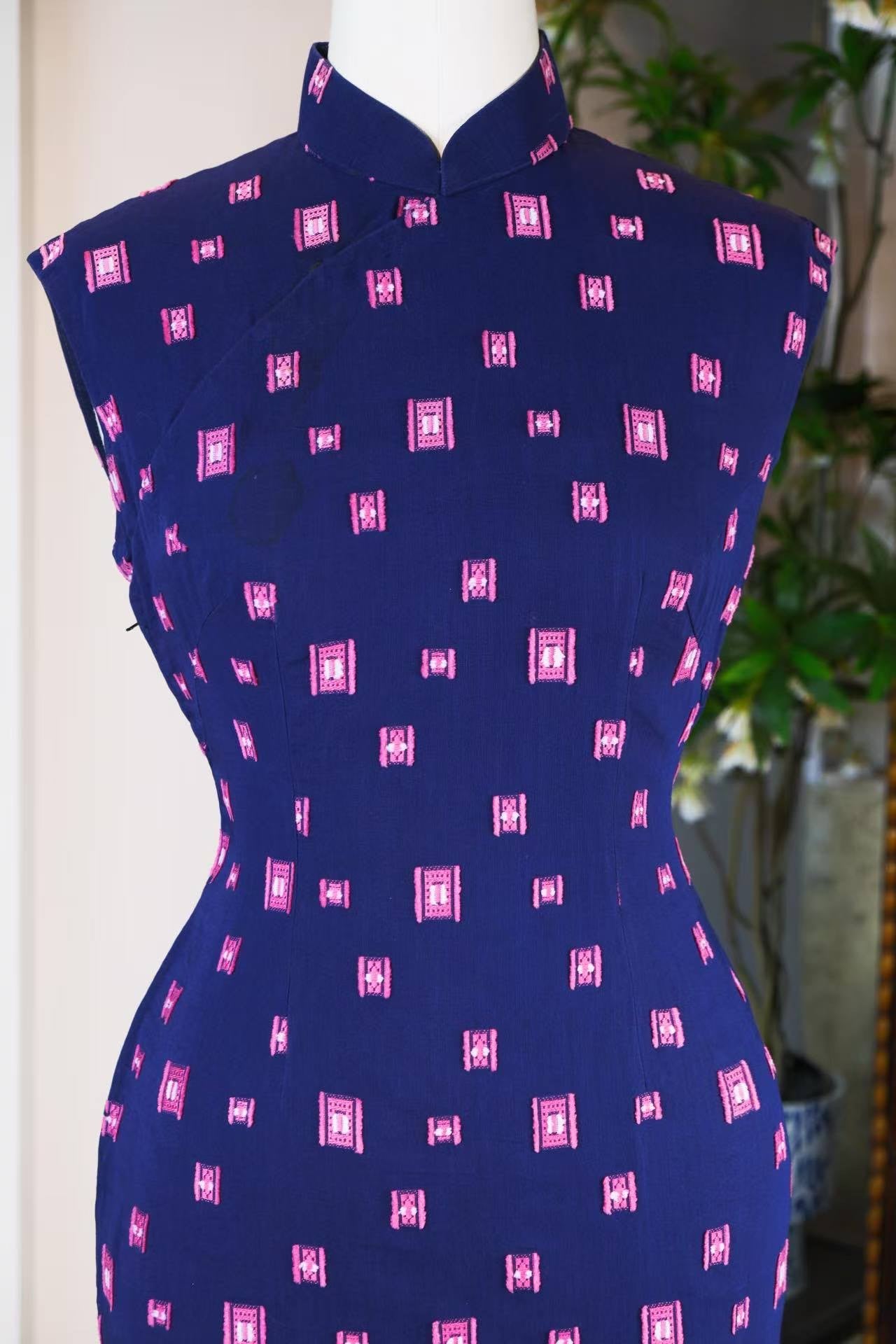 60年代 - 六十年代台湾风华:靛蓝底粉色几何机绣印花纯棉古董旗袍 — 工业化时代的传统回响与现代身体叙事 | 1960s - 1960s Taiwan Elegance: A Vintage Indigo Pure Cotton Cheongsam with Pink Geometric Machine Embroidery — Traditional Echoes of the Industrial Era and a Narrative of the Modern Body