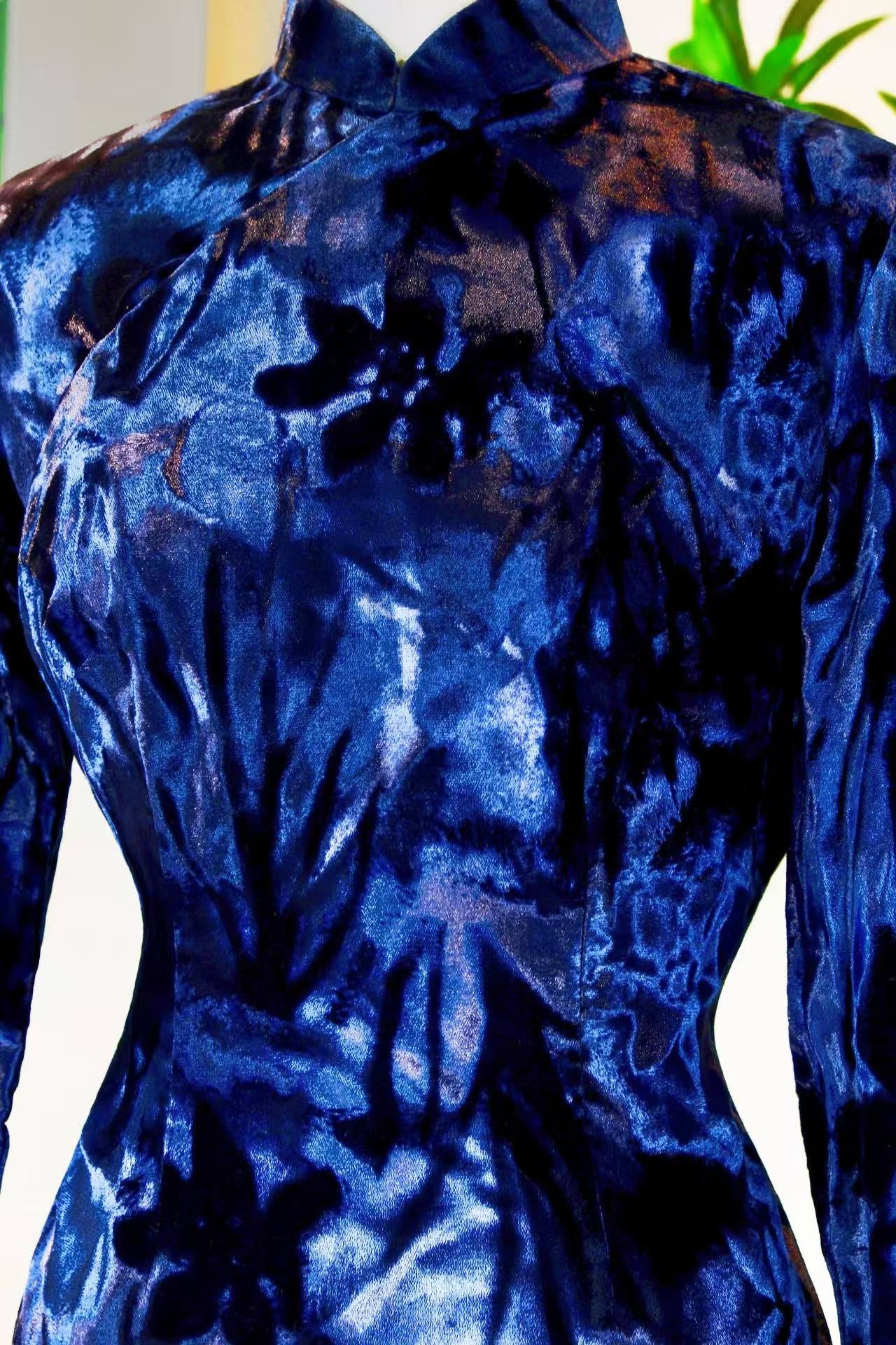 Its scarcity is deeply rooted in the irreplicability of the technique: the machine embossing technology used in 1960s Taiwanese garment workshops required precise control of pressure and temperature on the gold velvet base. This ensured the embossed pattern achieved a stable, graduating light-and-shadow effect without damaging the quality of the velvet pile. This "weaving + embossing" composite technique, due to the high barrier of equipment and skill, was only preserved in a few Taiwanese factories and is now virtually lost. Even rarer is the color coordination of indigo and electric blue, which required repeated adjustments in both the dyeing and embossing stages. This process ensured that the light refraction creates a layered effect of "the color being better than the source it came from" (qīng chū yú lán ér shèng yú lán). This relentless pursuit of color and light is a microcosm of the "tradition remade" aesthetic of post-war Taiwanese Chinese fashion: it retains the classic form of the cheongsam (stand collar, diagonal closure, cinched waist) but uses machine embossing to replace traditional embroidery, reconstructing the Oriental aesthetic with a modern industrial language, serving as a material testament to the cultural blending of that special era.