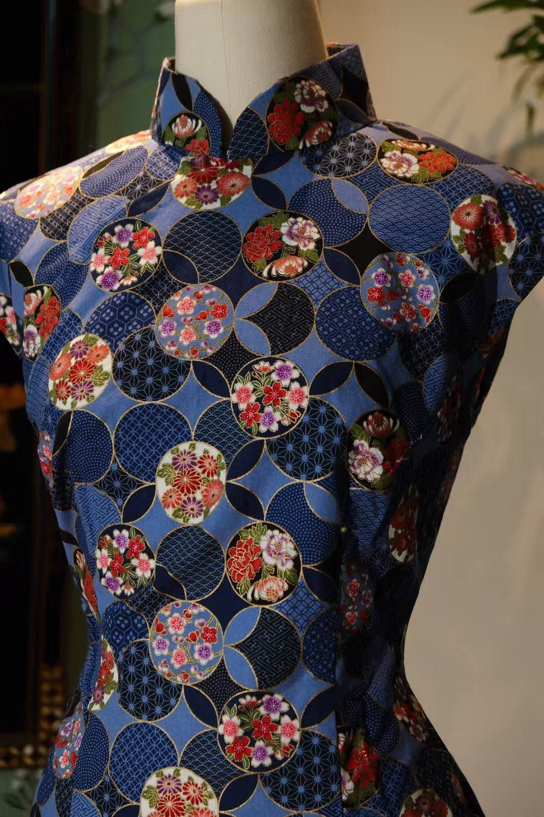 The fabric unfolds like a shimmering scroll, utilizing exquisite gold-tracing to detail a myriad of auspicious motifs. The Qipao is adorned with many traditional Japanese patterns, including the prosperity-symbolizing peony (Botan), the enduring chrysanthemum and Sho Chiku Bai (Pine, Bamboo, Plum), the romantically fleeting cherry blossoms (Sakura), and geometric patterns like the auspicious Seigaiha (blue ocean waves), Shippou (Seven Treasures), Kikko (turtle shell), and Asa-no-ha (hemp leaf).