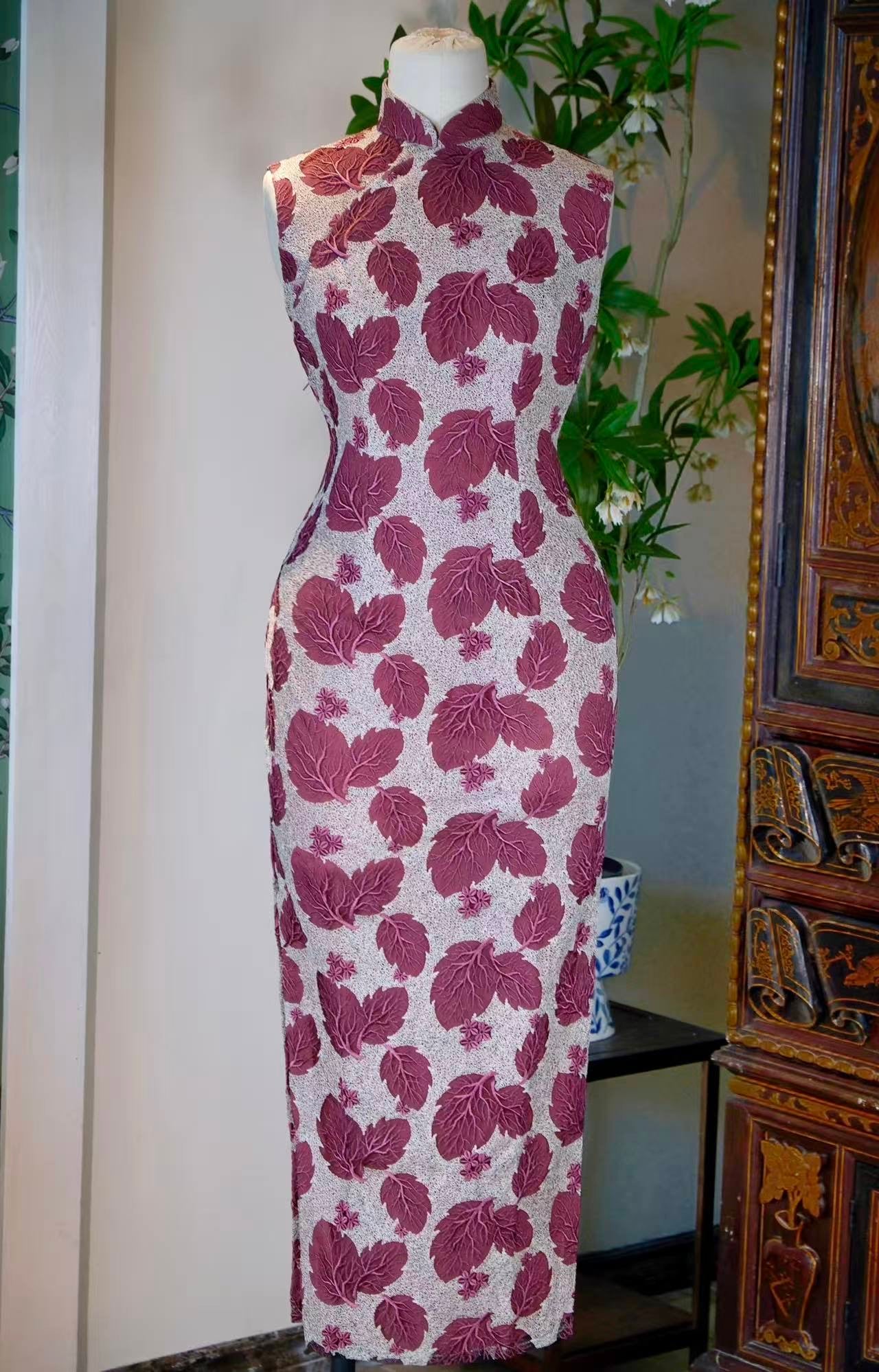 60年代 - 台湾铲镂空蕾丝刺绣网纱立体肌理感古董旗袍:叶片刺绣蕾丝的立体诗学与时光铭刻 | 1960s - A Sculptural Poetic of Lace and Leaves: A Vintage Taiwanese Cheongsam with Three-Dimensional Embroidered Lace