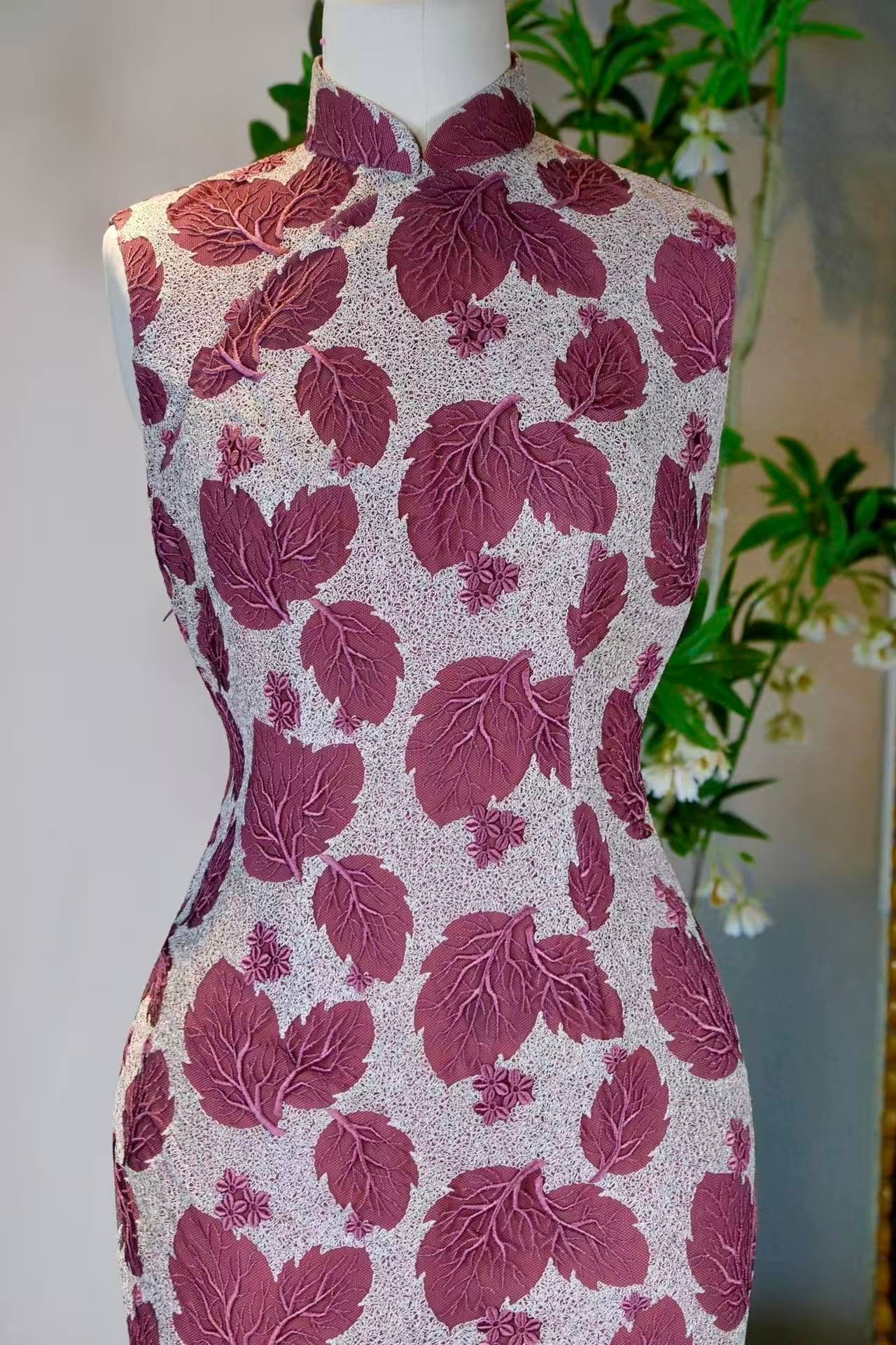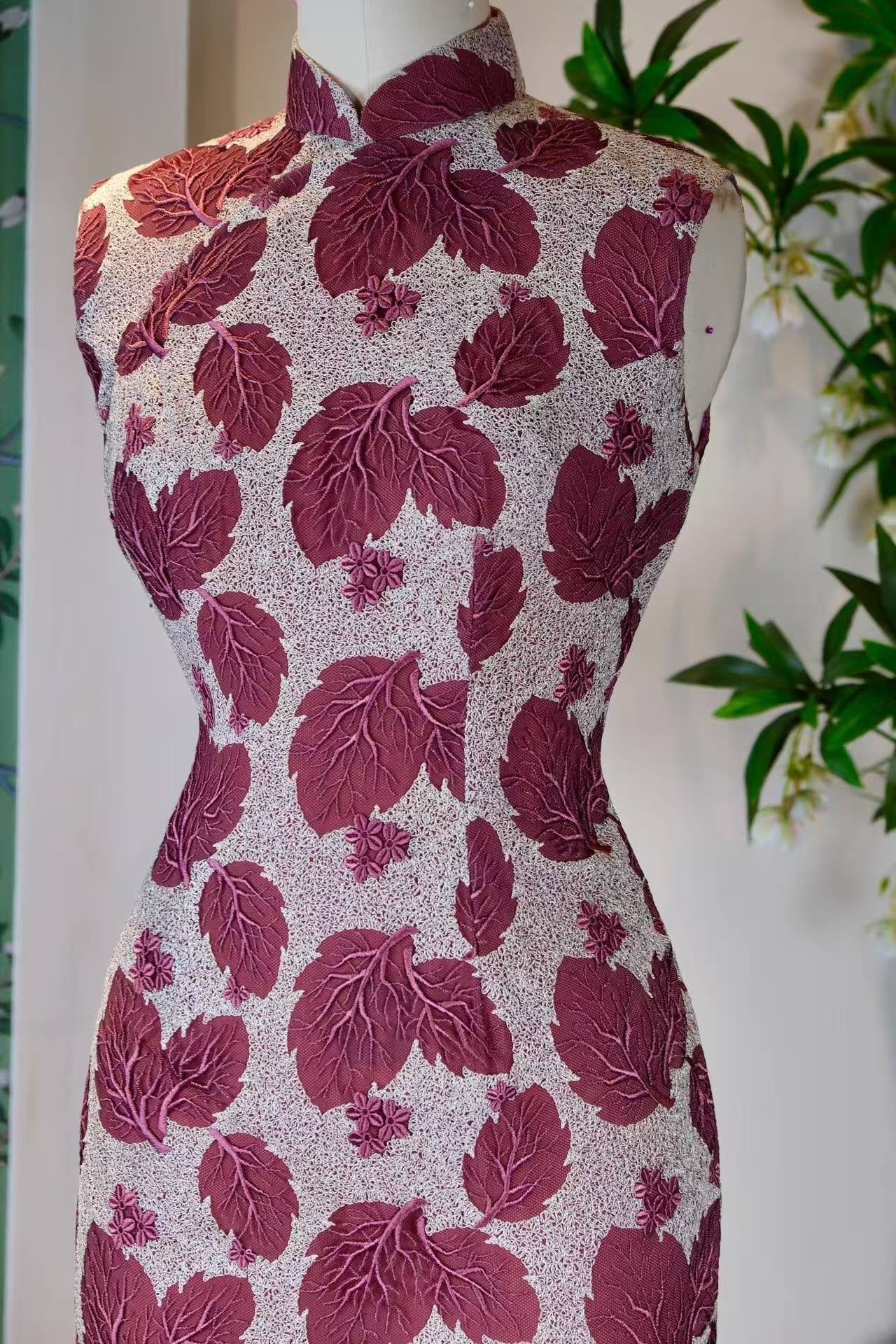 This vintage Taiwanese cheongsam from the 1960s uses transparent mesh lace as its foundation, elevating leaf embroidery into a "natural growth upon fabric." The deep purple-red leaf motifs, like silhouettes of an autumn maple forest, are scattered across the light grey mesh base. Each leaf is outlined with delicate flat stitching, and the veining is rendered with layers of gradient silk threads, resembling the brush intent of "leaves distinguish light and shadow, veins vary between solid and void" from the Mustard Seed Garden Manual of Painting. This perfectly integrates the life-drawing spirit of Chinese painting into the language of embroidery.