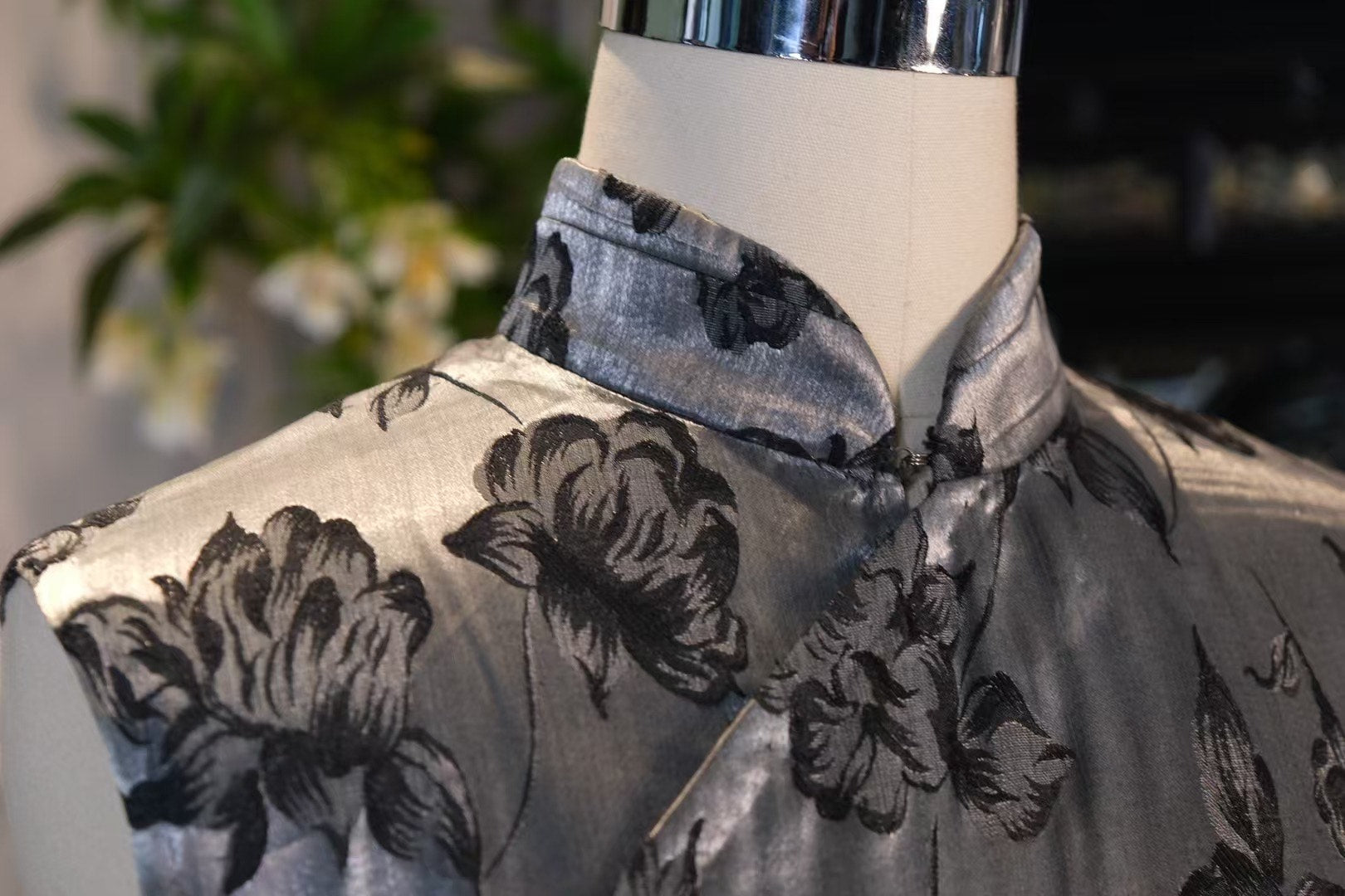 面料上的花卉图案以深沉的墨色炭黑色呈现,花形饱满,线条流畅。这种“黑对银”的配色,如同水墨丹青被泼洒在未来主义的背景之上,创造出一种独特的**“浮光掠影”**的视觉效果。随着光线的流动和身体的转动,旗袍的银色底色会不断变化,而墨色的花朵则若隐若现,充满了戏剧张力。