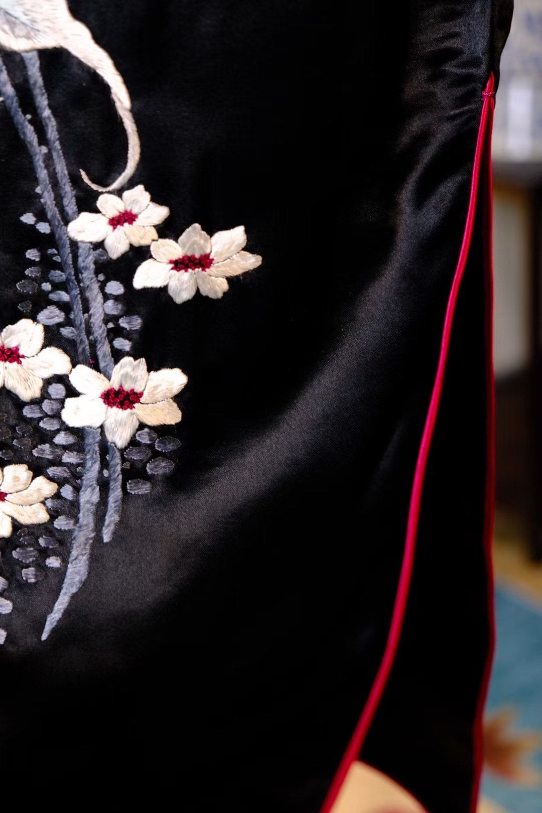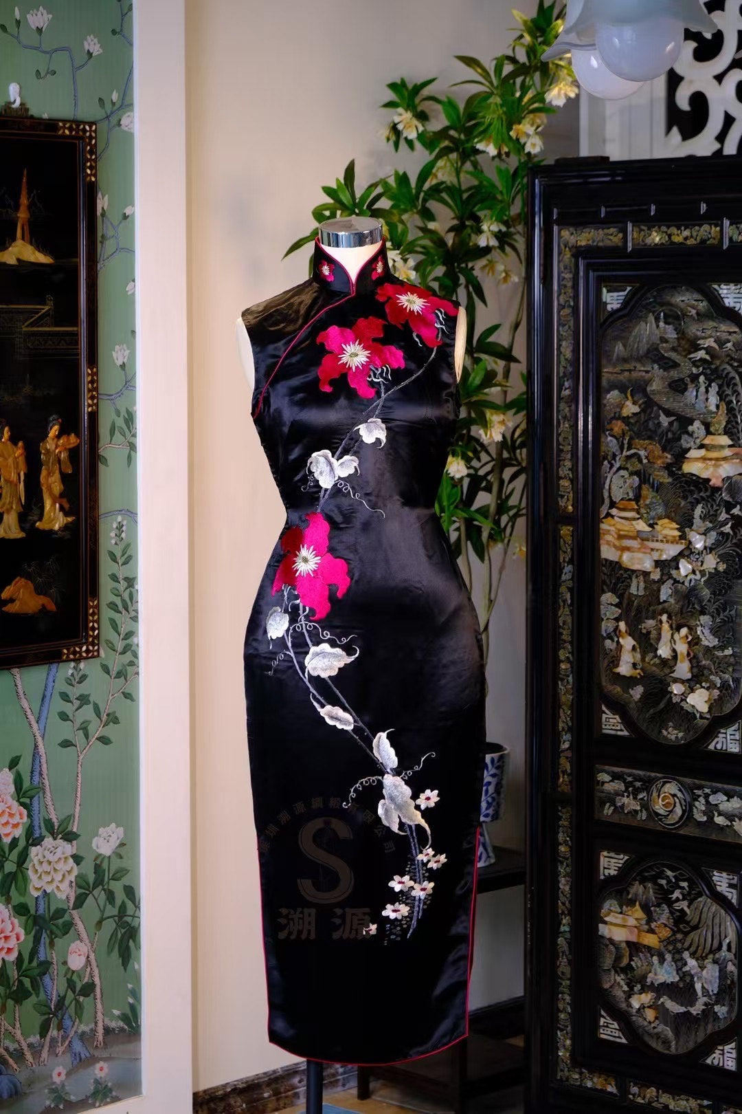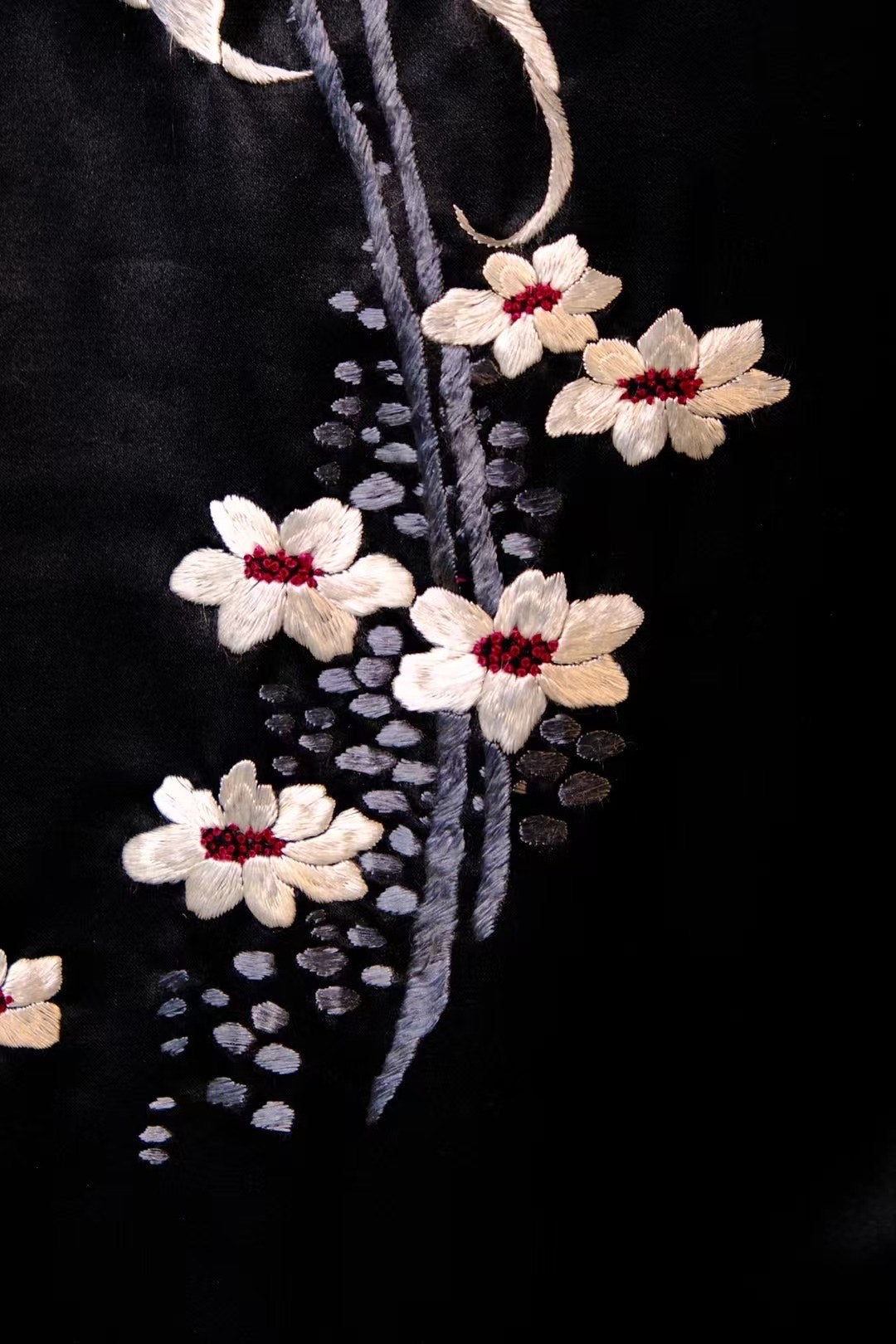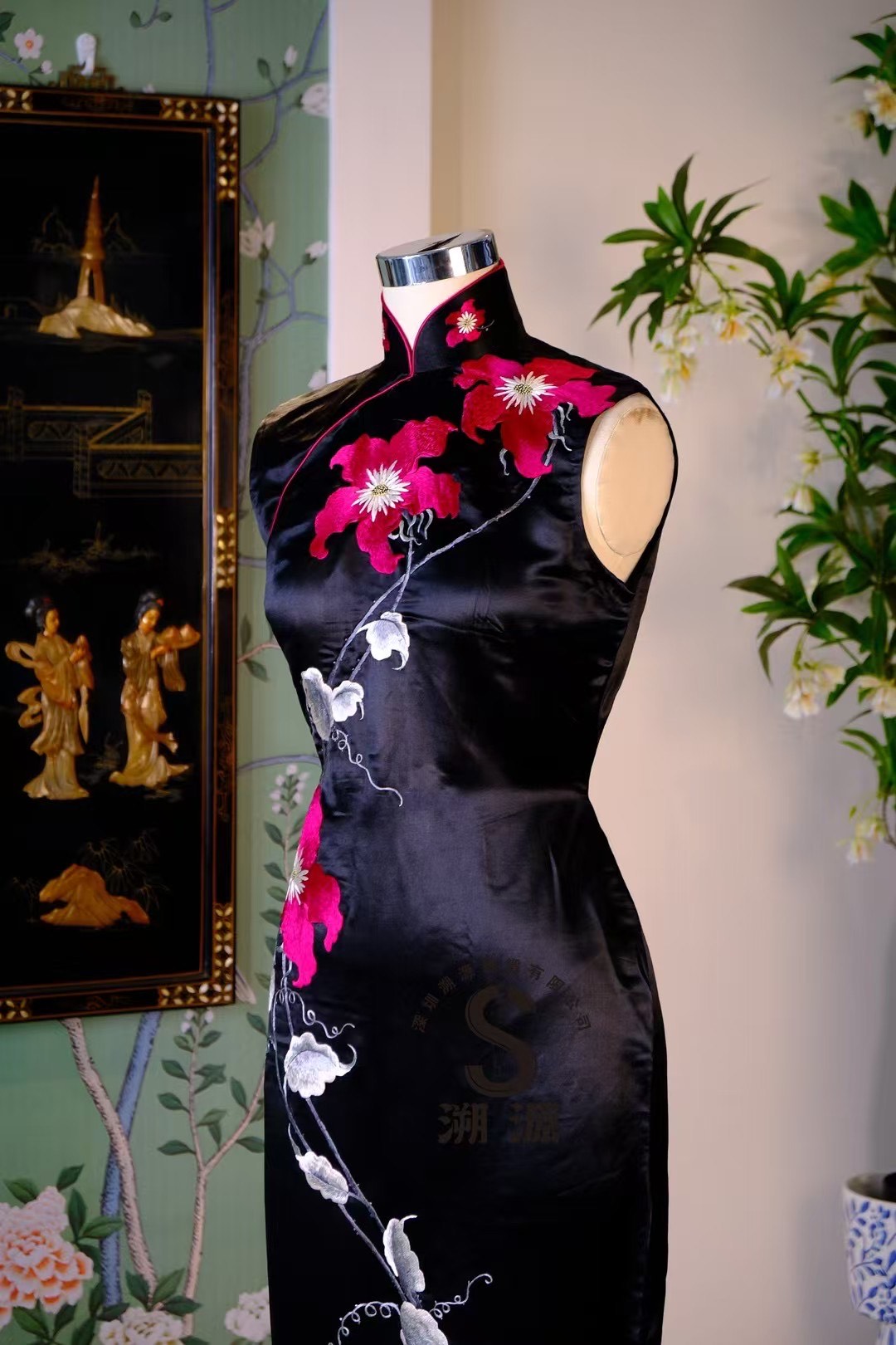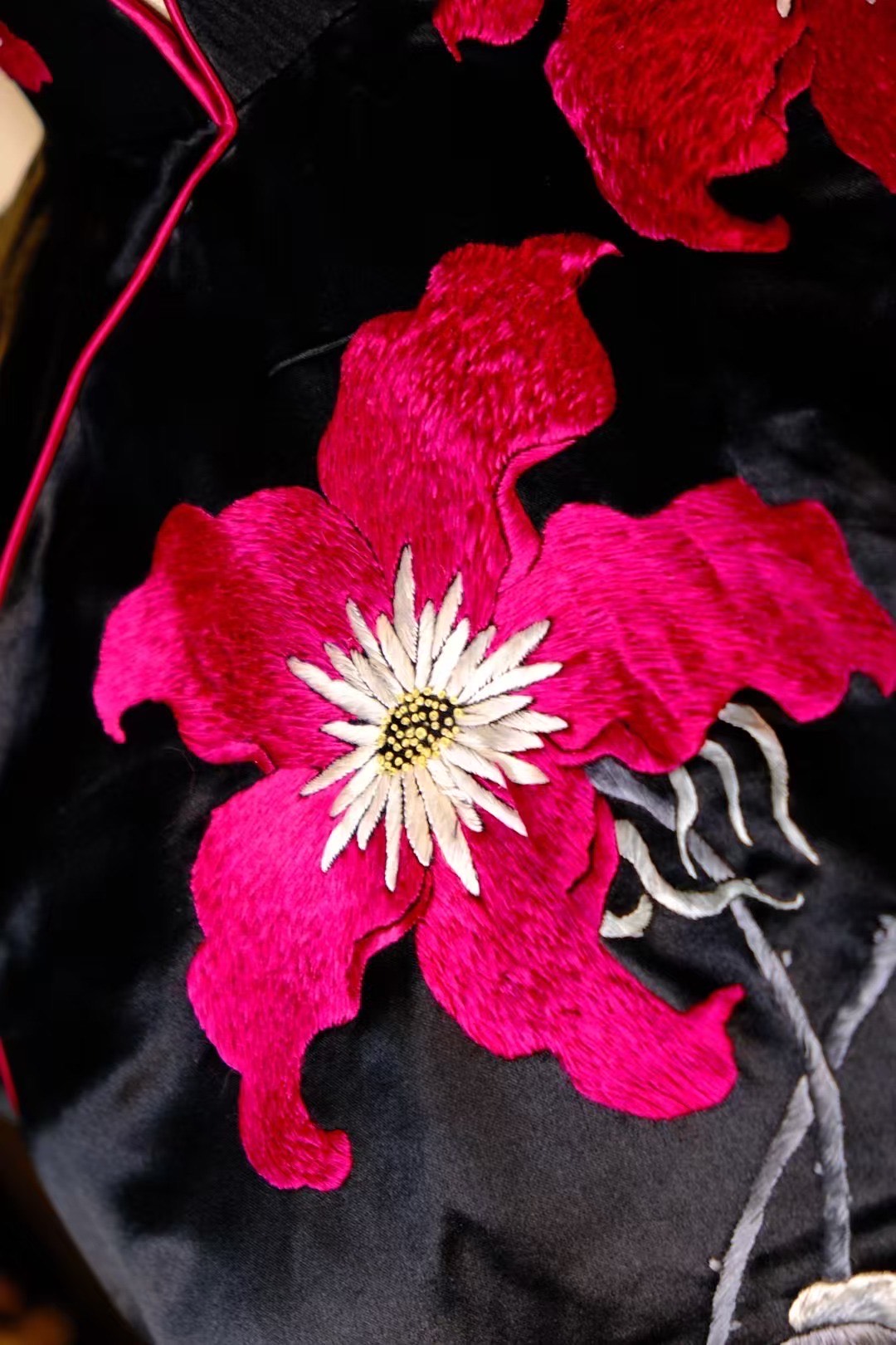旗袍以光泽柔美的真丝为面料,深邃的黑色犹如沉静的夜幕,为主题刺绣提供了完美的舞台。那栩栩如生的扶桑花(朱槿)刺绣图案,以鲜艳的品红与纯净的白色丝线勾勒,沿着曲线优美地攀爬而上,花朵形态立体而饱满,仿佛下一秒就要随风摇曳。