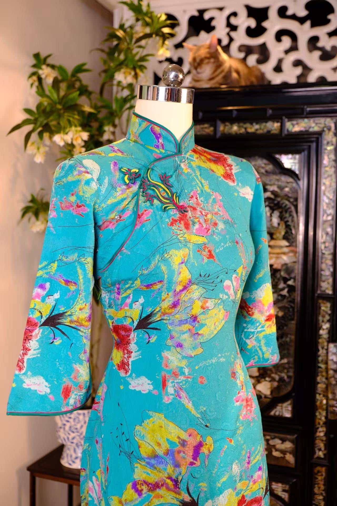 60年代 - 【天瀑流光】60年代抽象花鸟油画风 非遗嵌丝硬花扣古董港式旗袍 | 1960s - 【Turquoise Cascade】Vintage 60s Abstract Floral-Aviary Qipao with Intangible Heritage Gilt-Thread Hard Frog Closure
