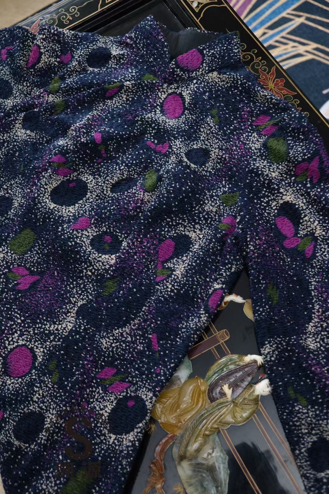 这件古董港式旗袍,是时代与艺术交织的瑰宝。它精确捕捉了六十年代艺术觉醒的瞬间,将波普艺术(Pop Art)几何的精髓凝聚于方寸之间。底色沉稳而高级,其上涌现的粉紫与绿色的抽象色斑,如同幻彩流萤,在光影中变幻不定,充满生机与张力。