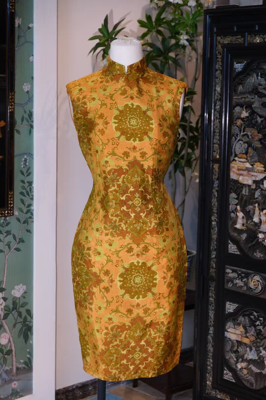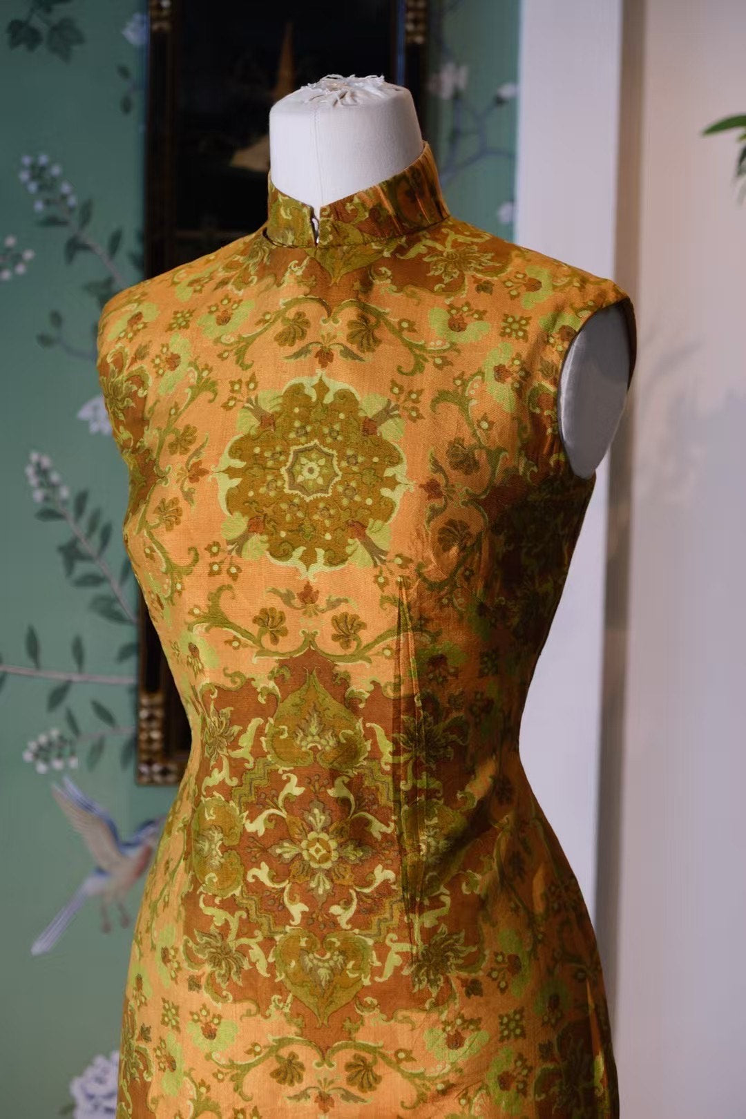 60年代 - 异域贵族情调:六十年代焦橙与橄榄绿提花古董旗袍礼服 | 1960s - Exotic Aristocratic Flair: 1960s Tangerine and Olive Green Brocade Antique Cheongsam Gown
