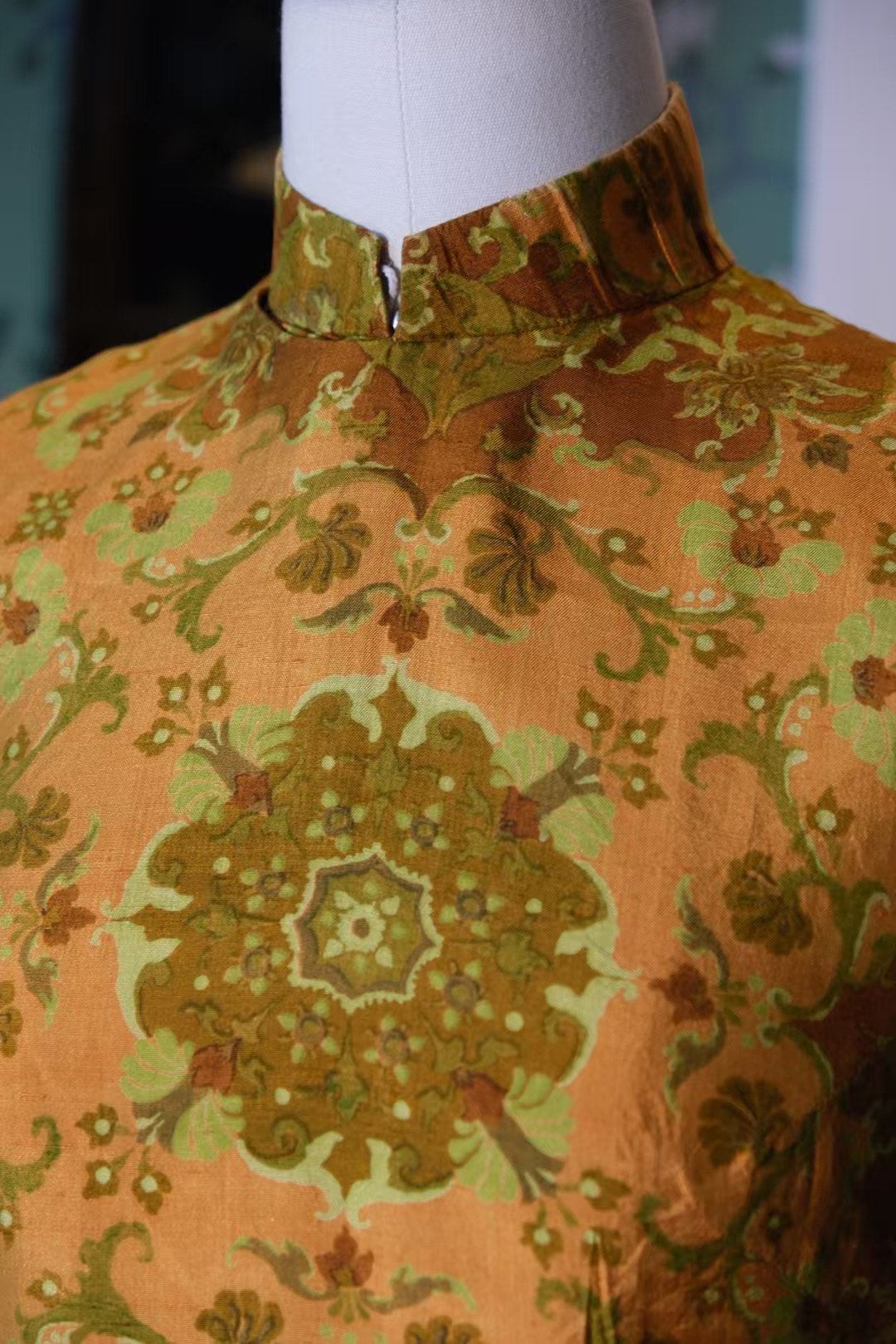 • 旗袍的色彩是典型的六十年代美学:温暖的焦橙色底色搭配富有生命力的橄榄绿与浓郁的棕色系提花纹样,构成富有层次感的佩斯利/大马士革(Damask)风格团花,极具异国情调。