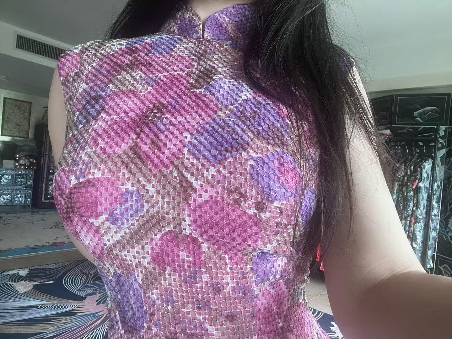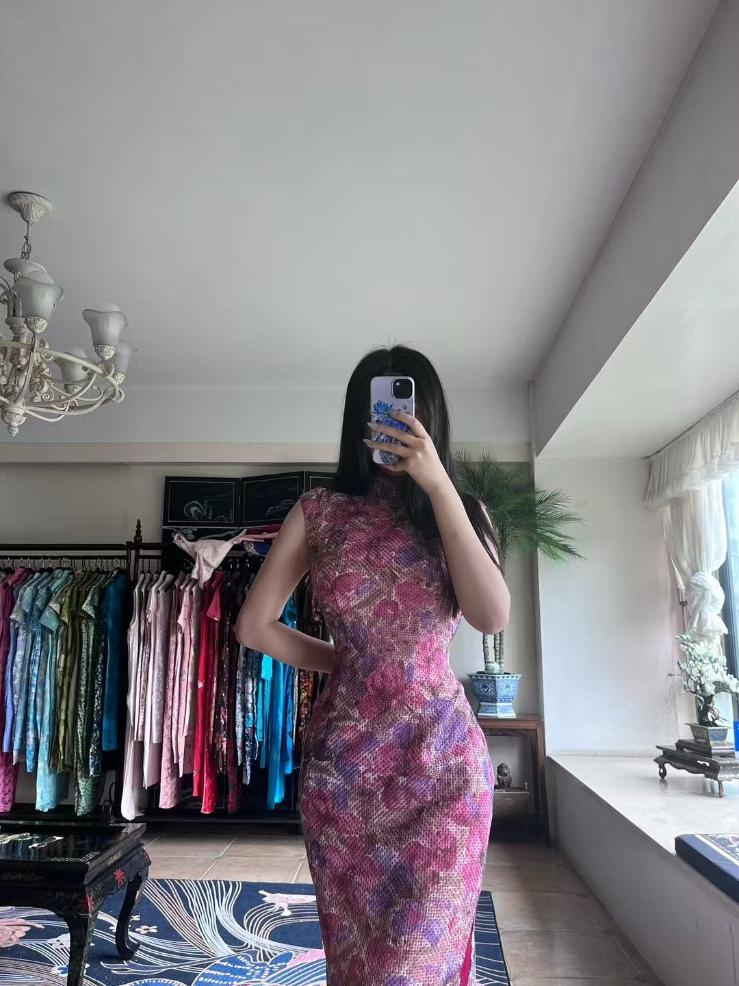 這件旗袍的魅力,首在於其如詩如畫的色彩。它採用了極為獨特的**「胭脂水紫」主色調,紫色、粉色、酒紅色的暈染在面料上交織,形成一幅抽象的「水彩暈染藝術」**圖案。那色彩,紅若曉霞初綻,粉似桃瓣含春,嬌而不豔,雅而不素。
