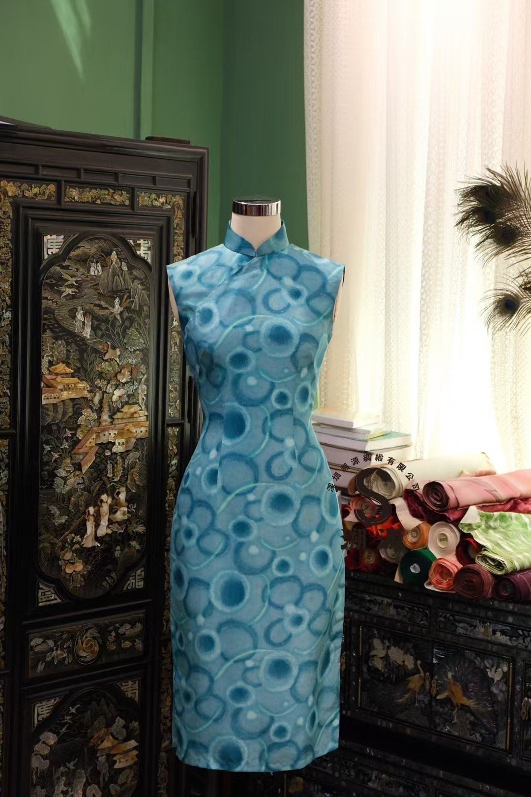 这款旗袍是现代极简主义与东方魅力的巧妙结合。它放弃了繁复的写实花卉,采用清新的湖水碧为基调,搭配充满动感的抽象水波纹或圆环几何图案。