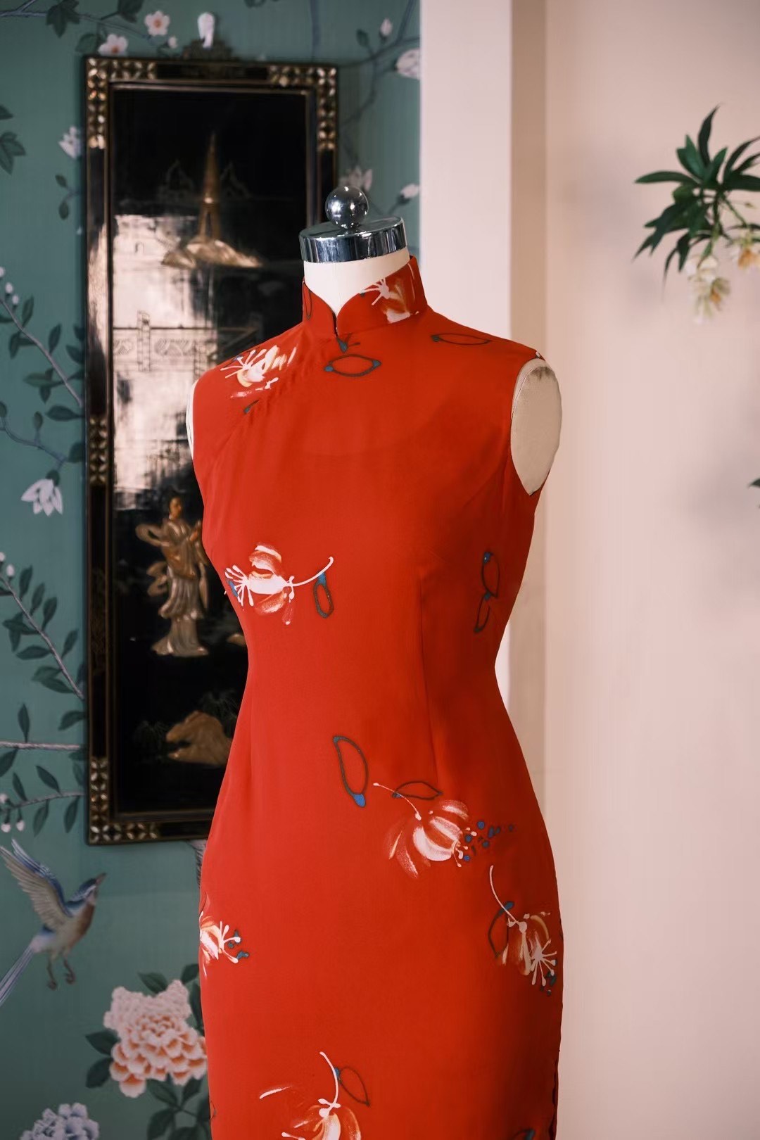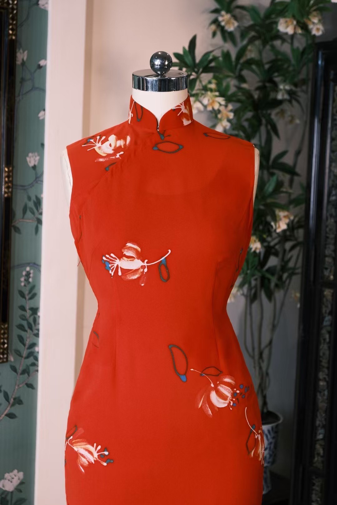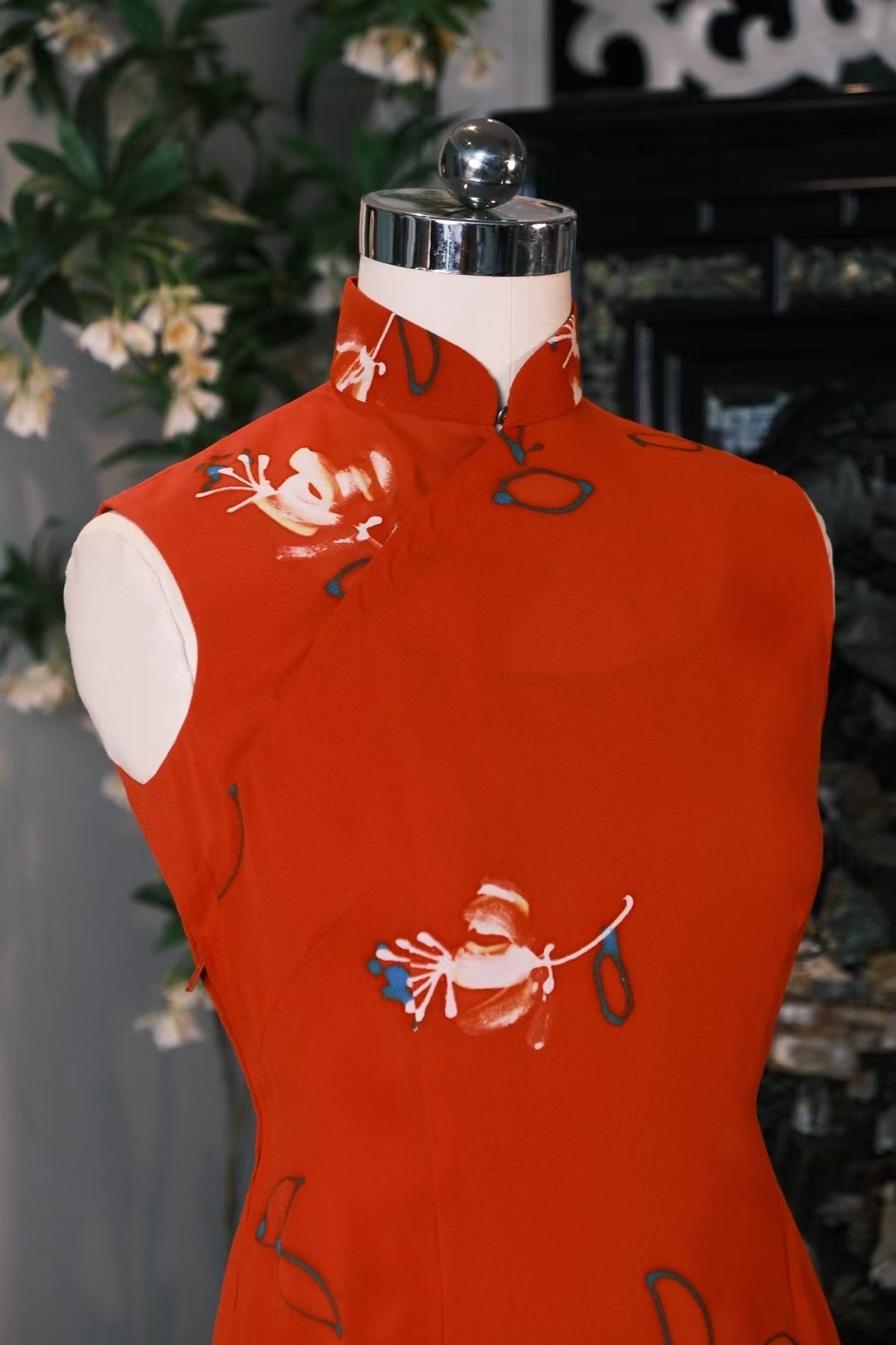 60年代 - 朱砂流光・水墨寫意:一襲熱烈而清雅的現代東方詩意 | 1960s - "Vermillion Luster・Ink Wash Abstract": Sleeveless Orange-Red Modern Minimalist Abstract Floral Qipao (Cheongsam)