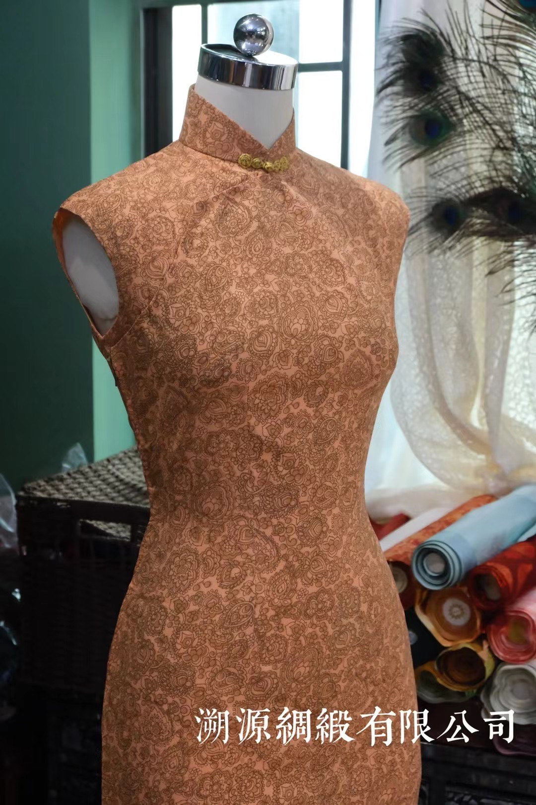 旗袍面料采用经典的丝光织锦,以沉静典雅的蜜桃杏色为底,表面密布着精美的织金宝相花纹样。宝相花象征庄严与吉祥,在光线下闪烁着低调的金色光泽,正是五六十年代旗袍对奢华感内敛表达的最佳范例——不过分张扬,但每一细节都透露着优渥的生活品味。这比早期的素色棉麻更具节日感和仪式感。