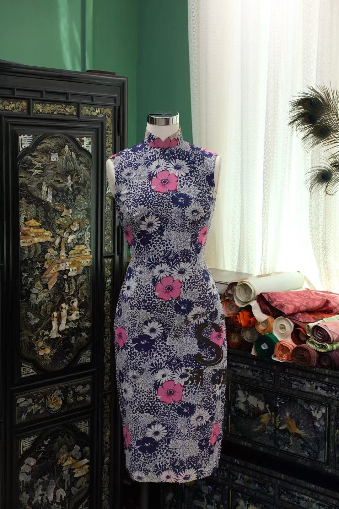 这款旗袍完美融合了60年代的波普(Pop)艺术风格与传统剪裁。图案采用高对比度的紫蓝色、白色底纹,穿插大面积的热粉色花朵,形成极度密集、近似万花筒或迷宫的视觉效果。