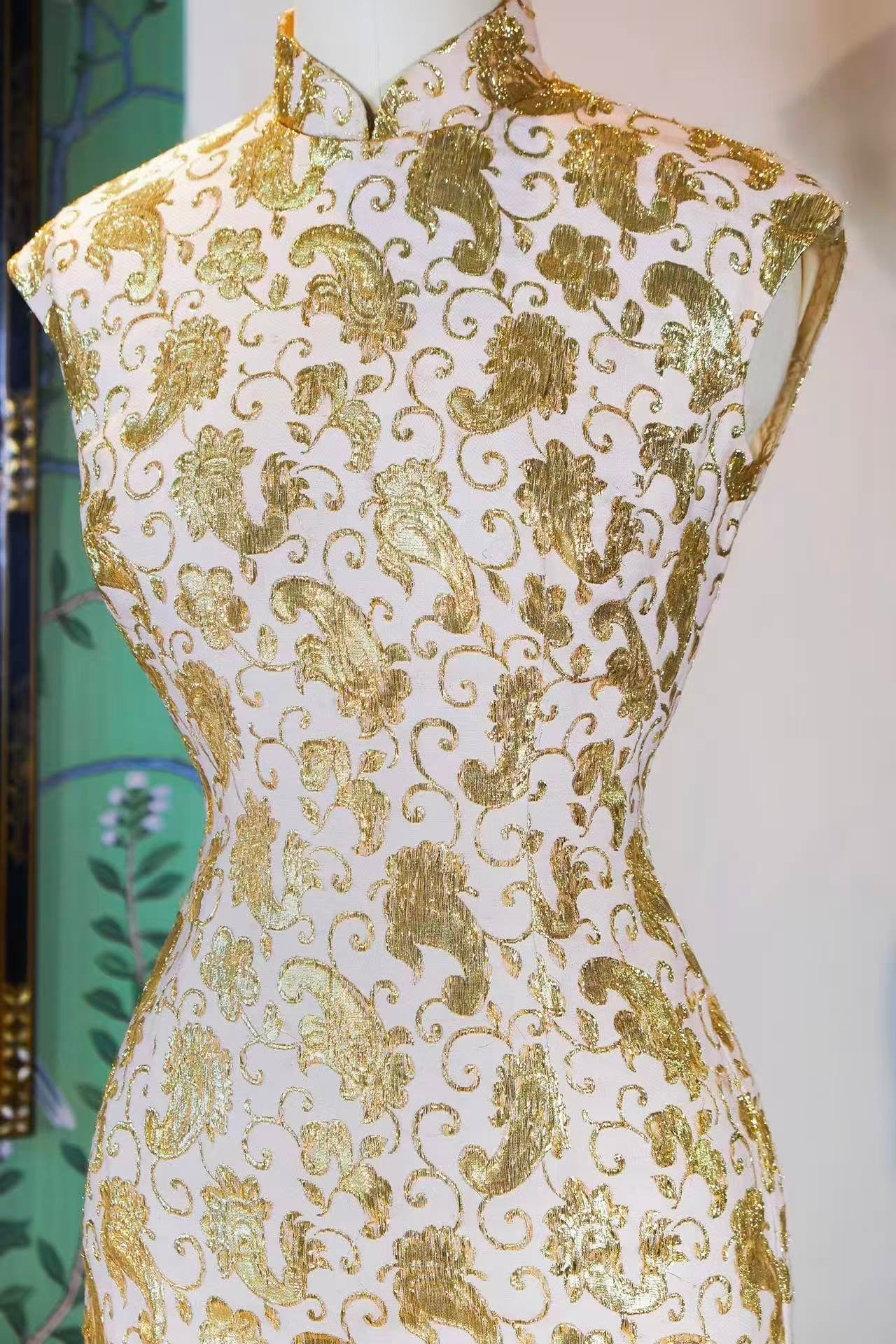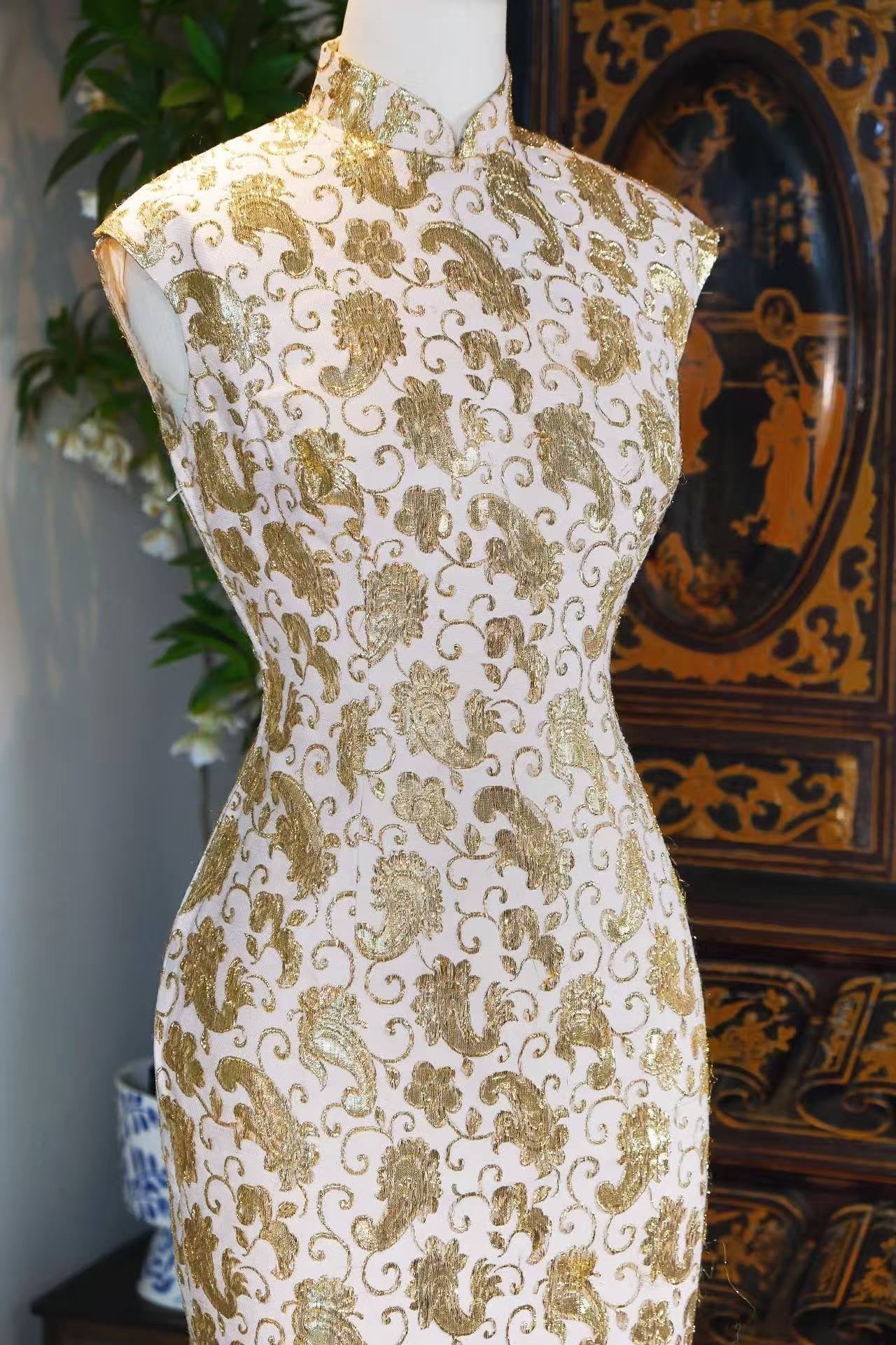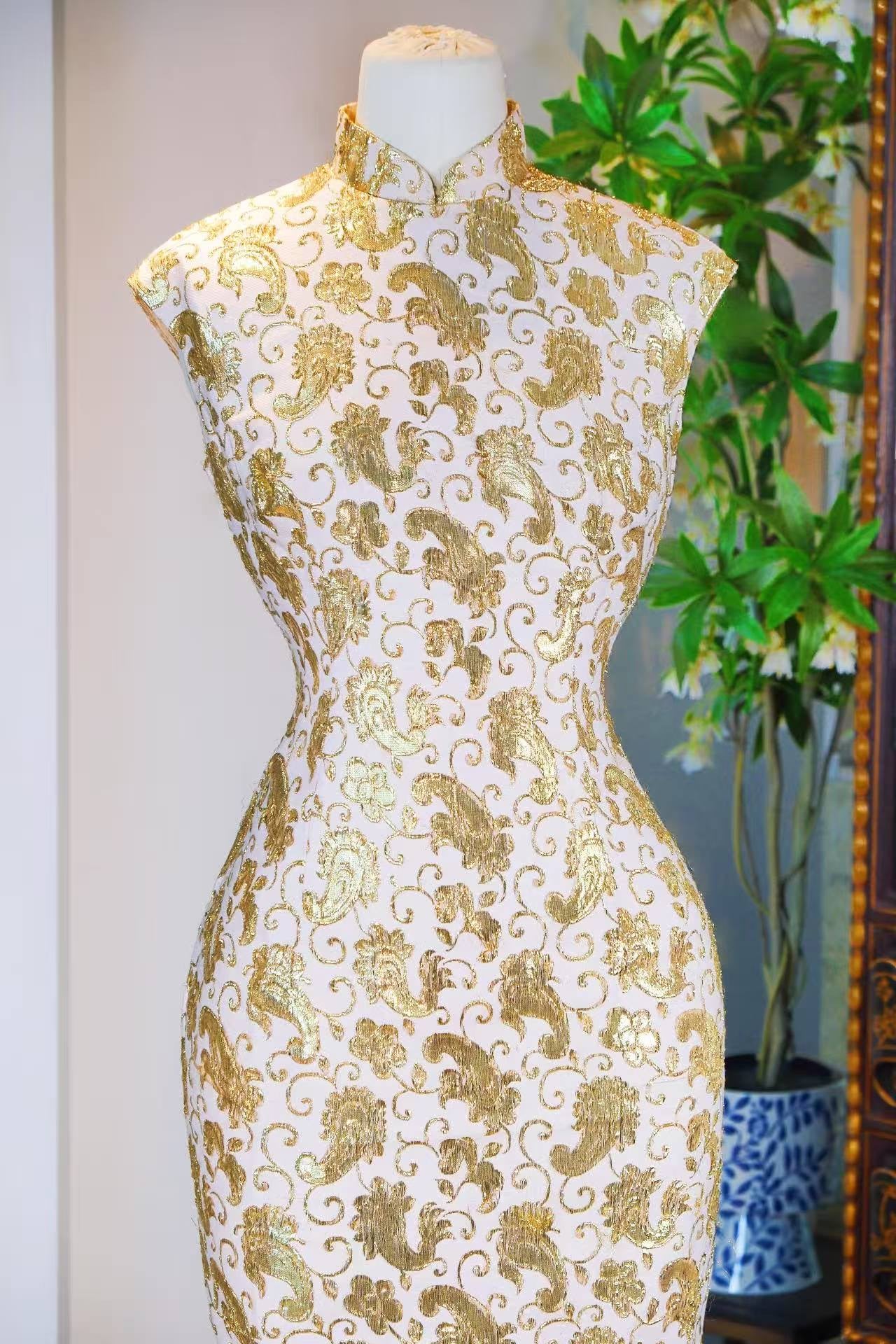 The cheongsam is entirely rendered using the gold brocade jacquard (zhījīn tíhuā) technique, its motifs winding like Bodhi leaves and unfurling like the Tree of Life. The Paisley pattern, originating in ancient Babylon, flourishing in Persia and India, with its teardrop-shaped vortex, is seen as a symbol of the "Tree of Life," embodying the metaphors of reincarnation and eternity in Hinduism. When this motif crossed the Silk Road and bloomed on a 1960s Hong Kong cheongsam, artisans reshaped it using Oriental zhījīn techniques: gold threads, like swimming dragons, shuttle through the white satin ground, fusing the complexity of Persia, the spiritual grace of India, and the exquisite skill of Jiangnan weaving. The pattern transcends simple decoration, progressing in a spiral structure, resembling auspicious clouds or winding lotus vines, aligning with the traditional Chinese philosophy of "perpetual vitality" (shēng shēng bù xī). The initiation and resolution of every vortex perfectly echo the cheongsam's stand collar, cinched waist, and slit, as the gold thread flows, the imagery of "flitting like a startled swan, graceful as a swimming dragon" from the Ode to the Goddess of the Luo River seems to dance on the fabric.