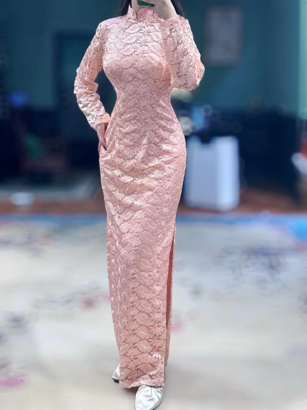 60年代 - 浪漫樱花粉 满幅蕾丝提花 挖胸长袖曳地剪裁 古董旗袍:【粉黛春华】| 1960s - Romantic Cherry Blossom Pink, Full Lace Jacquard, Scoop-Neck (or Keyhole Bust) , Long Sleeves, Floor-Length Cut Antique Qipao: [Pink Spring Glory]