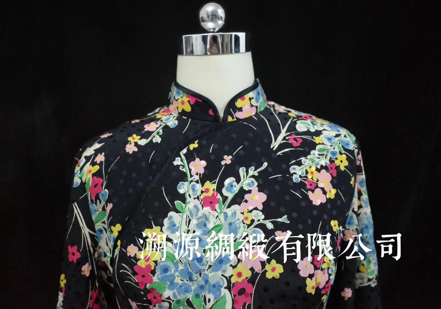 ✨ 面料与花色:波点暗纹与绚丽花束 旗袍选用轻盈且带有暗纹的雪纺或乔其纱面料。