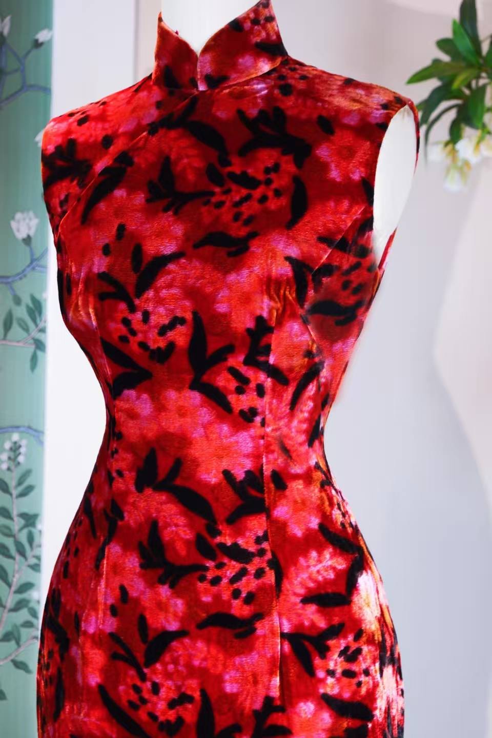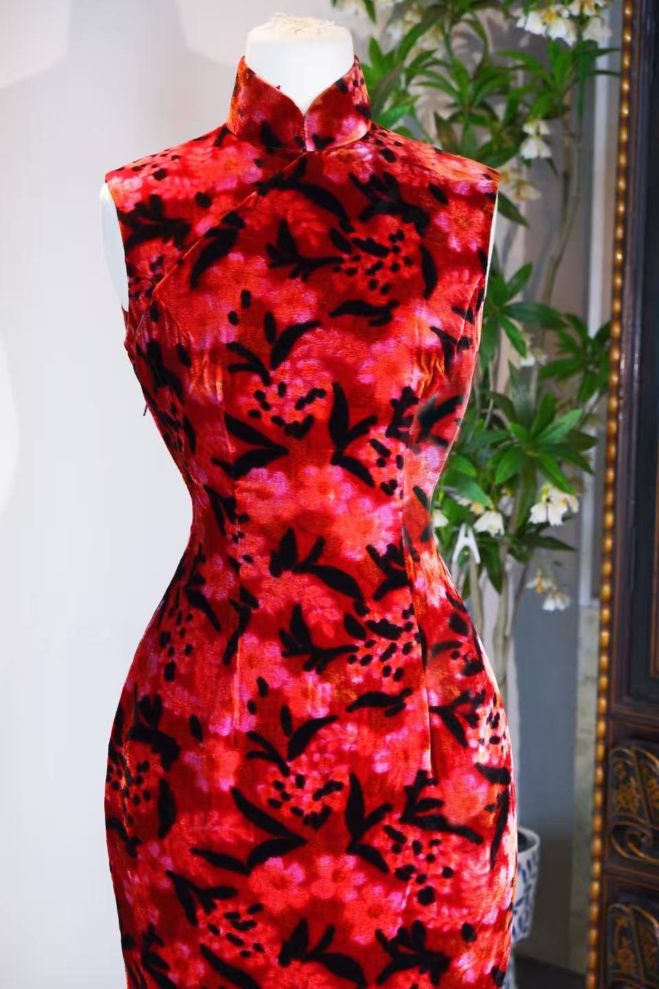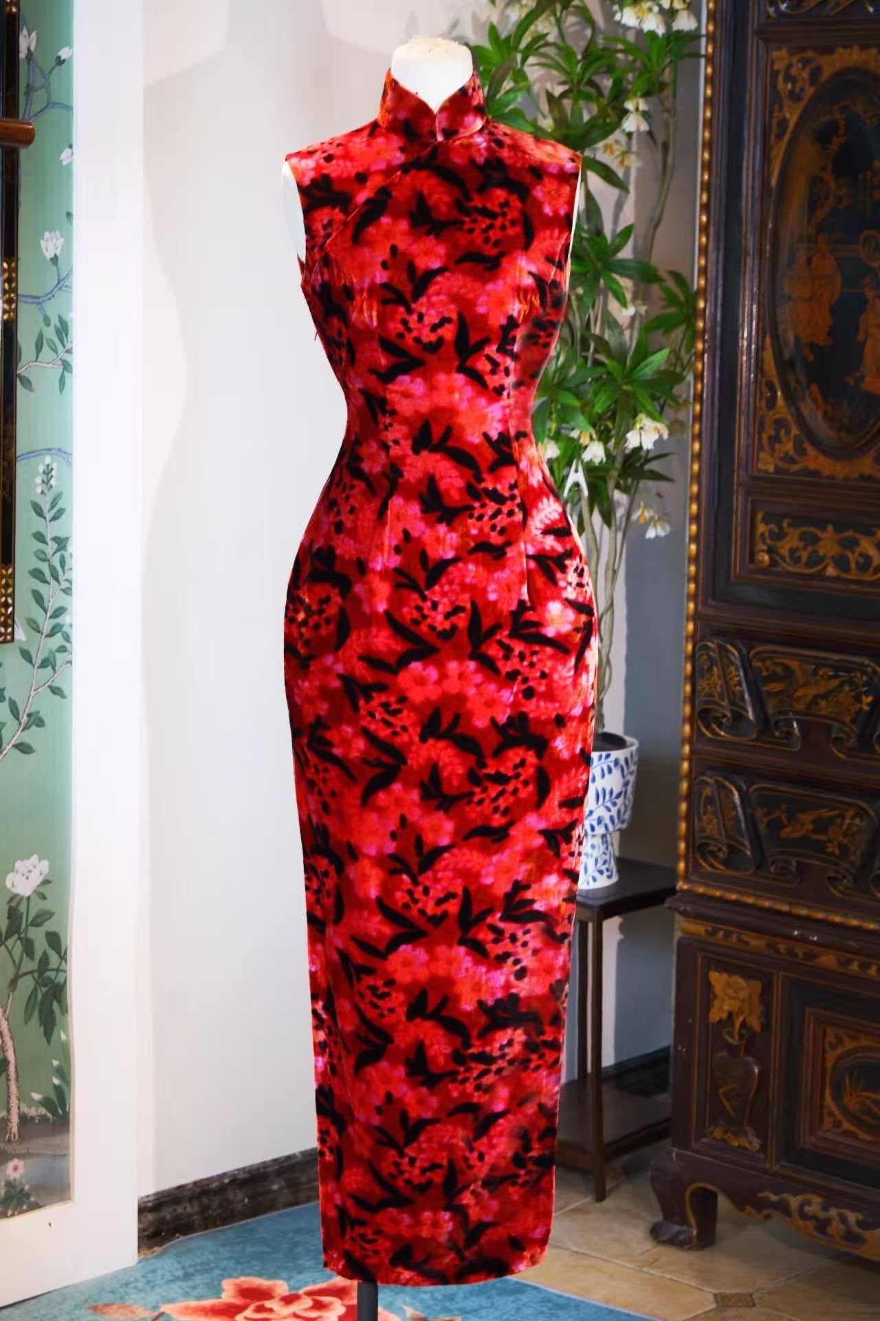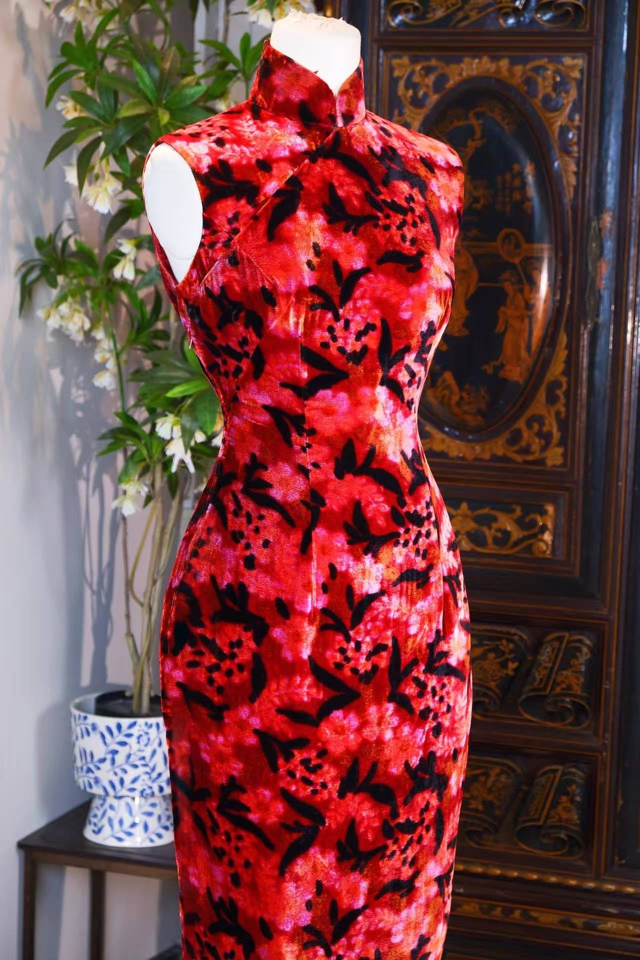 🔥 The Cinder-Dyed Crimson Bloom: The Visual Poetics of a Vintage 1960s Taiwanese Velvet Print Cheongsam