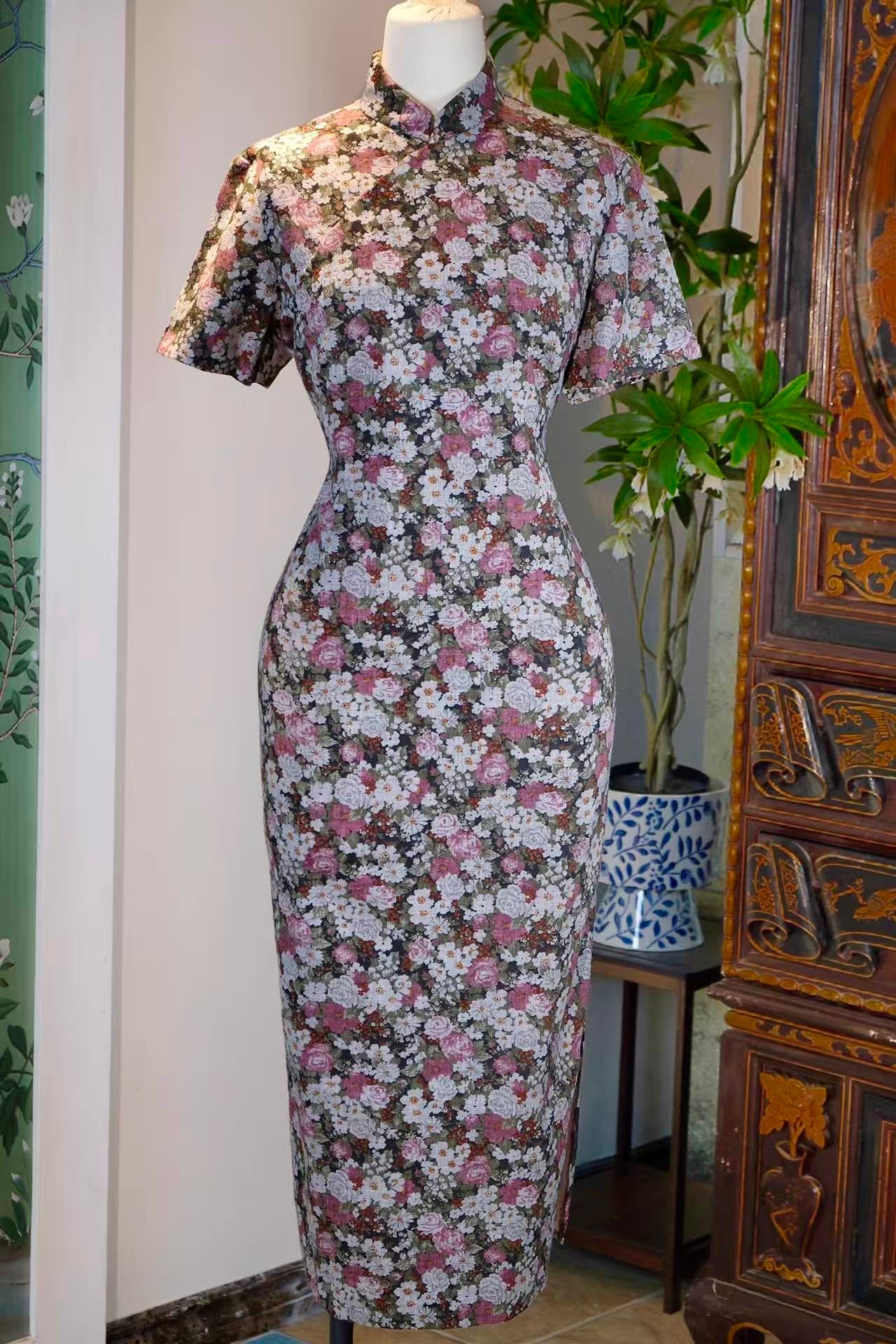 The floral pattern on the cheongsam is a miniature "poetry of botany." The dark gray base serves as the paper, adorned with pink and white bi-colored roses, daisies, and unnamed wild flowers. The flowers vary in size and density, scattered across the fabric, resembling the interspersed beauty described in the Classic of Poetry: "In the mountains are fú sū (hibiscus), on the wetlands are lotus flowers." The delicate pink rose is akin to the subtle grace of the phrases "the zhǐ in the Yuan River, the orchids in the Li River" from the Songs of Chu; the pure white daisy is like the aloof elegance in Tang Yin's poem: "How many wanderers who have not returned, gaze at the autumn wind leaning against the fence."