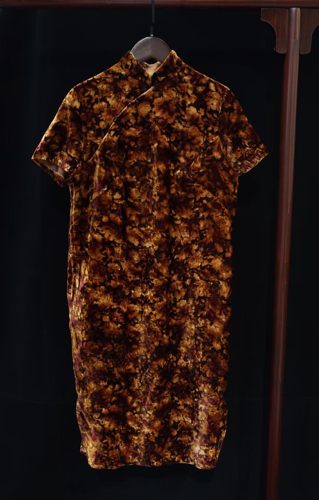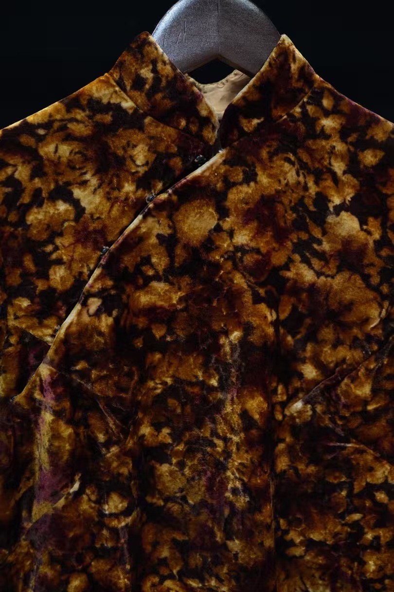 这件旗袍呈现出独特的复古艺术感,仿佛是一幅流动的油画。它采用温暖浓郁的金棕色丝绒面料,光泽感饱满柔和。其印花图案设计精妙,以扎染或泼墨的手法将深棕、黑色和一抹幽微的紫红色融于其间,花卉图案模糊而抽象,营造出一种深邃、神秘的秋日密语般的氛围。