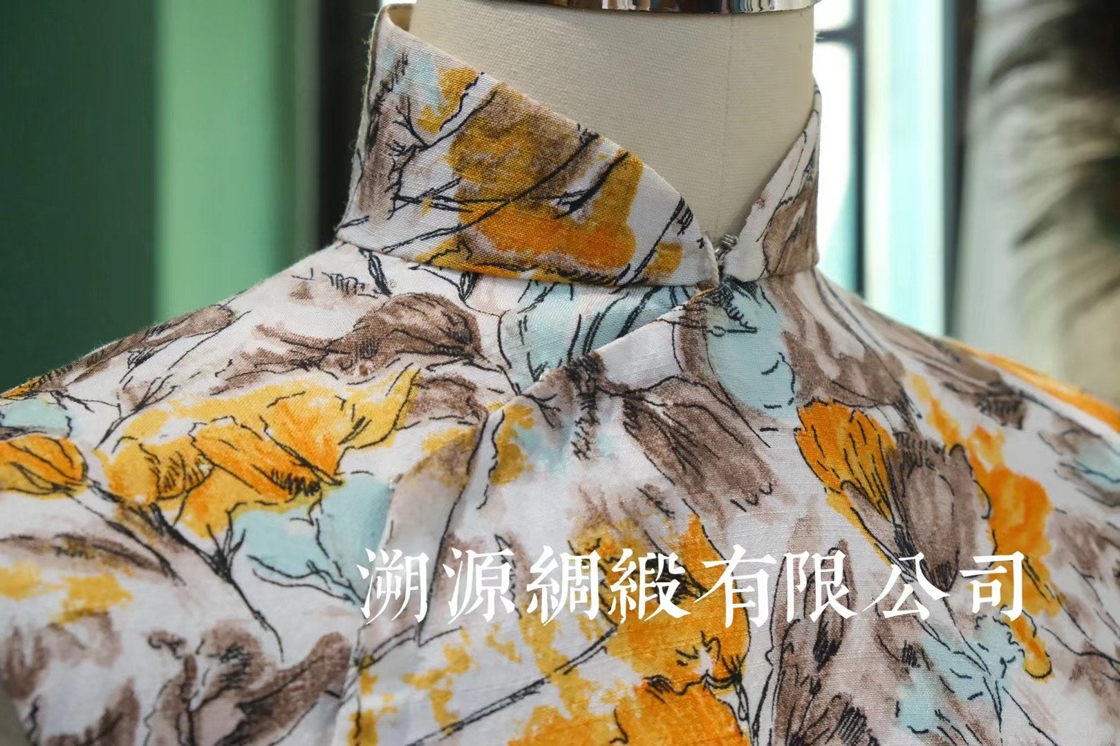 这件旗袍以其清新而温暖的色彩组合,独具魅力。它采用清爽的米白或浅杏色为底色,仿佛一张待绘的宣纸。其上是手绘感十足的橘黄与淡蓝色花卉印花,笔触轻盈,带着水彩画般的艺术气息。橘黄色的花朵如同秋日暖阳下的果实,温暖而饱满,淡蓝色的叶片则带来一丝清雅的平衡,营造出一种**生动而复古的“秋橘浮光”**意境。