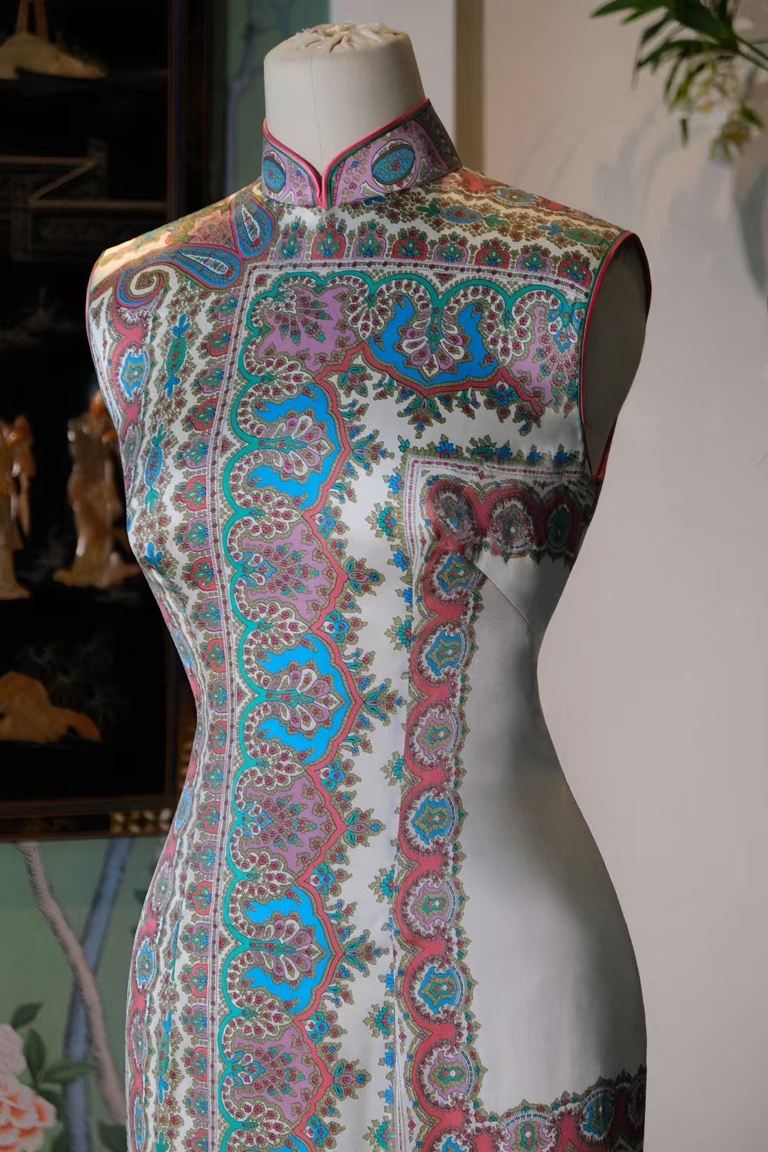 • 佩斯利之秘: 旗袍的面料满铺着色彩绚烂、复杂精美的佩斯利涡纹(Paisley)。这种源自古老西域,带有泪滴或生命之树寓意的图案,赋予了旗袍一种独特的神秘感和浪漫的异域情调