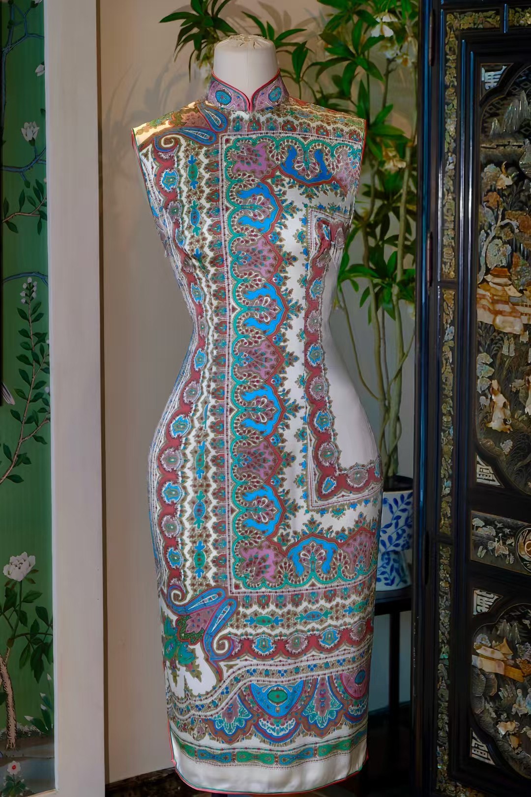 This Cheongsam is a rare treasure, reputed to be part of the vintage collection of Madam Zhang Leyi, embodying the elegant taste of a mid-20th-century socialite. It skillfully merges the body-contouring silhouette of the Oriental Qipao with the Western-popular exotic Paisley pattern, creating a captivating and unique sense of mystery.
