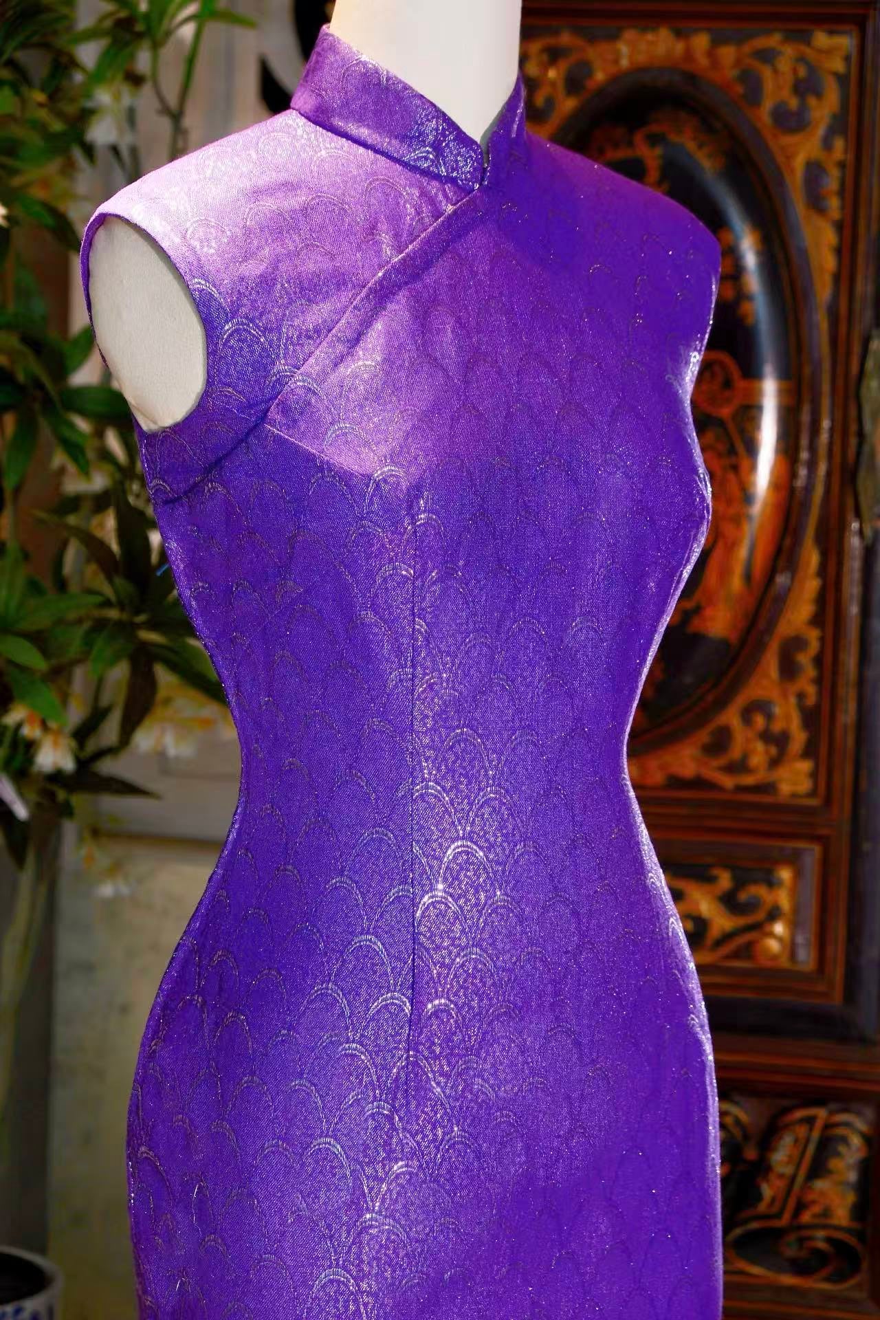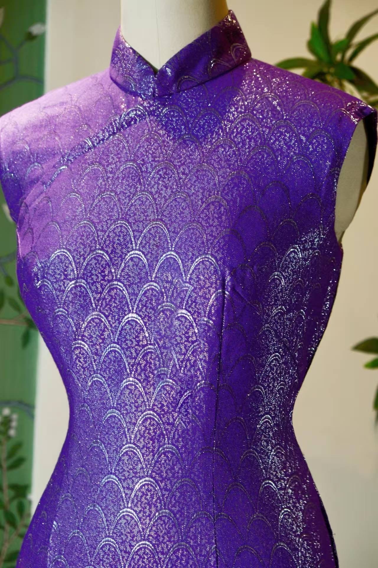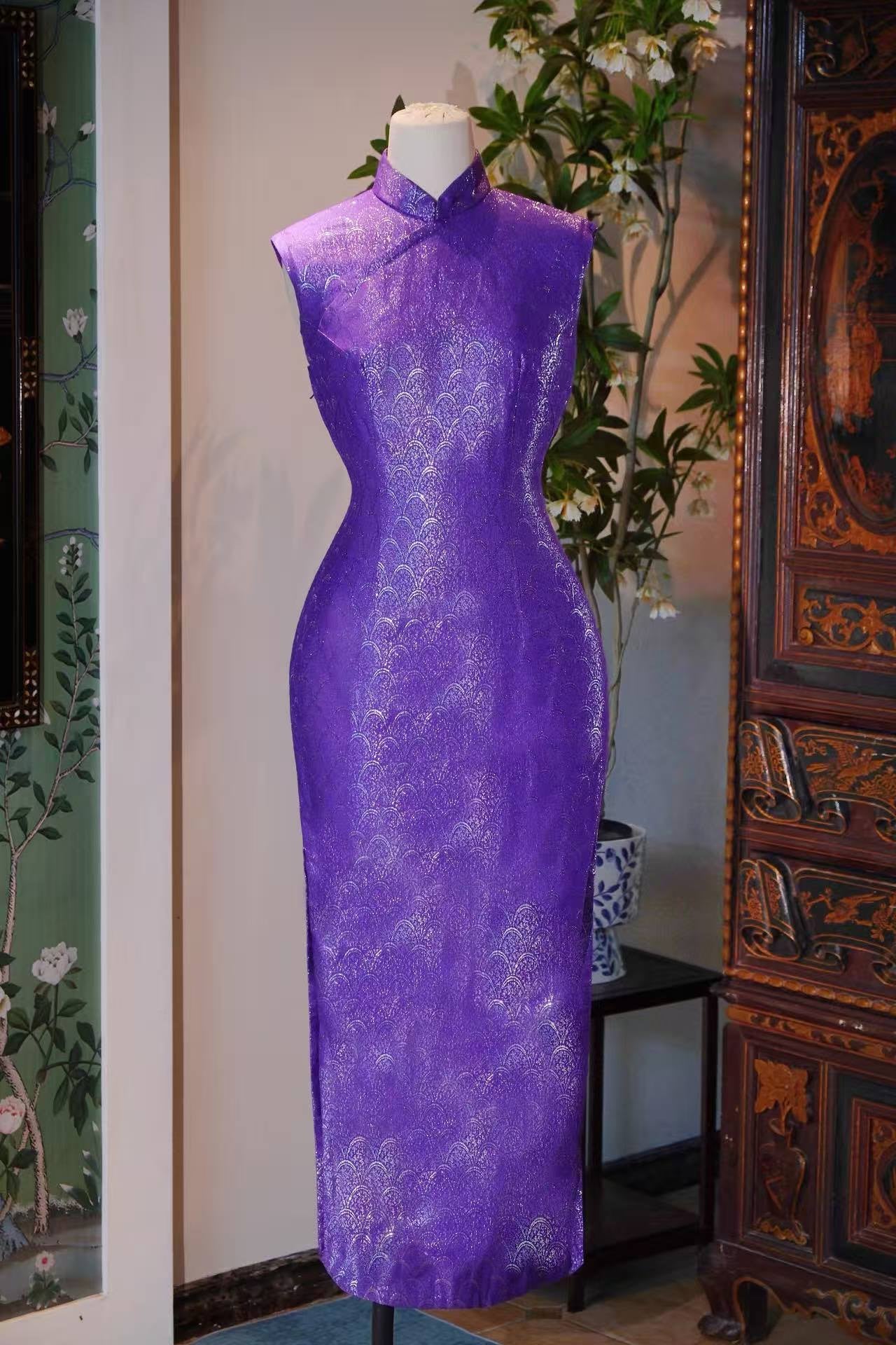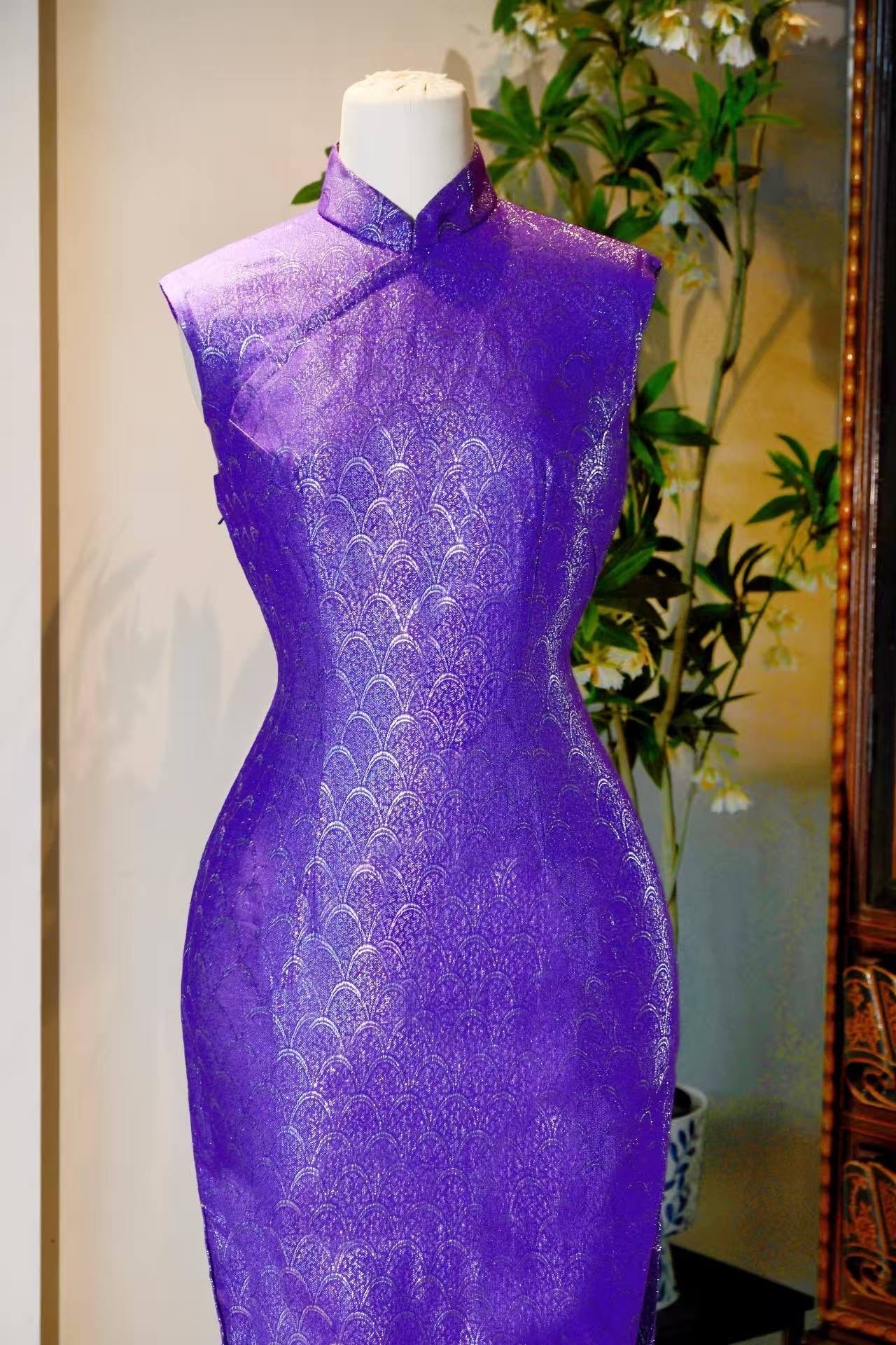 Today, its scale pattern still shimmers with metallic light, and the purple ground remains as vibrant as a freshly bloomed Chinese redbud. It stands as a scarce physical specimen for studying the qipao craftsmanship, pattern evolution, and social fashion of the sixties—an aesthetic landmark transcending the dust of time. As we pause amidst the symphony of purple haze and silver scales, we hear the echo of an era's elegance and touch the sophisticated craftsmanship tempered by time.