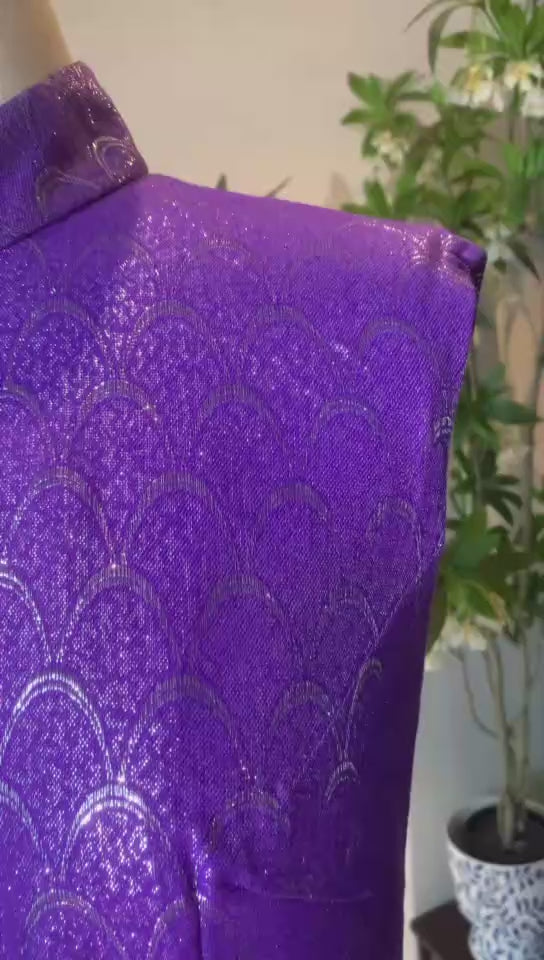上世纪六十年代,旗袍在东西方时尚交融中完成现代转型,更强调人体曲线,同时保留传统装饰元素。这件旗袍的紫地象征尊贵(《论语》"紫,间色之贵者"),银鳞呼应"衣锦衣"的奢华想象,将传统等级符号转化为现代审美语言,既是对古典美学的致敬,也是对时代风尚的回应。其纹样布局承袭宫廷服饰的"遍地锦"传统,却以现代剪裁赋予活力,是传统工艺与现代设计对话的经典案例。